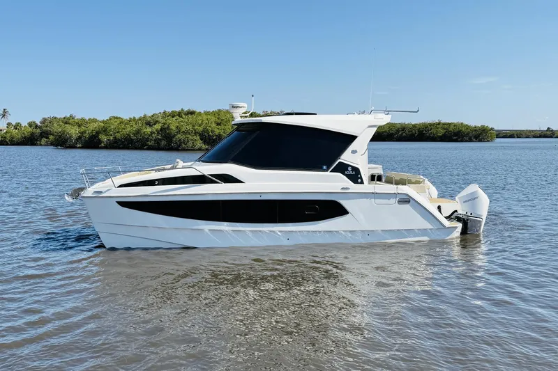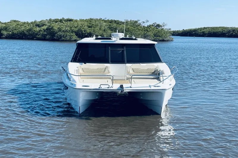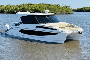 The all-new Aquila 36 is a power catamaran that blends plentiful live aboard space and qualities perfect for socializing with rugged strength and control. Offering the conveniences of a large yacht including topside summer kitchen with smokeless grill, the Aquila 36 has cockpit seating for over two dozen adults and two comfortable cabins with private en-suite heads. A hardtop is available with or without an opening sunroof. Powered by efficient and reliable twin 300 horsepower Mercury Verado outboards, the Aquila 36 provides spirited performance and excellent fuel economy. Add its open water capabilities, wide stance and twin sponsons, and the boat is remarkably stable making it exceptionally comfortable at speed or while at rest.