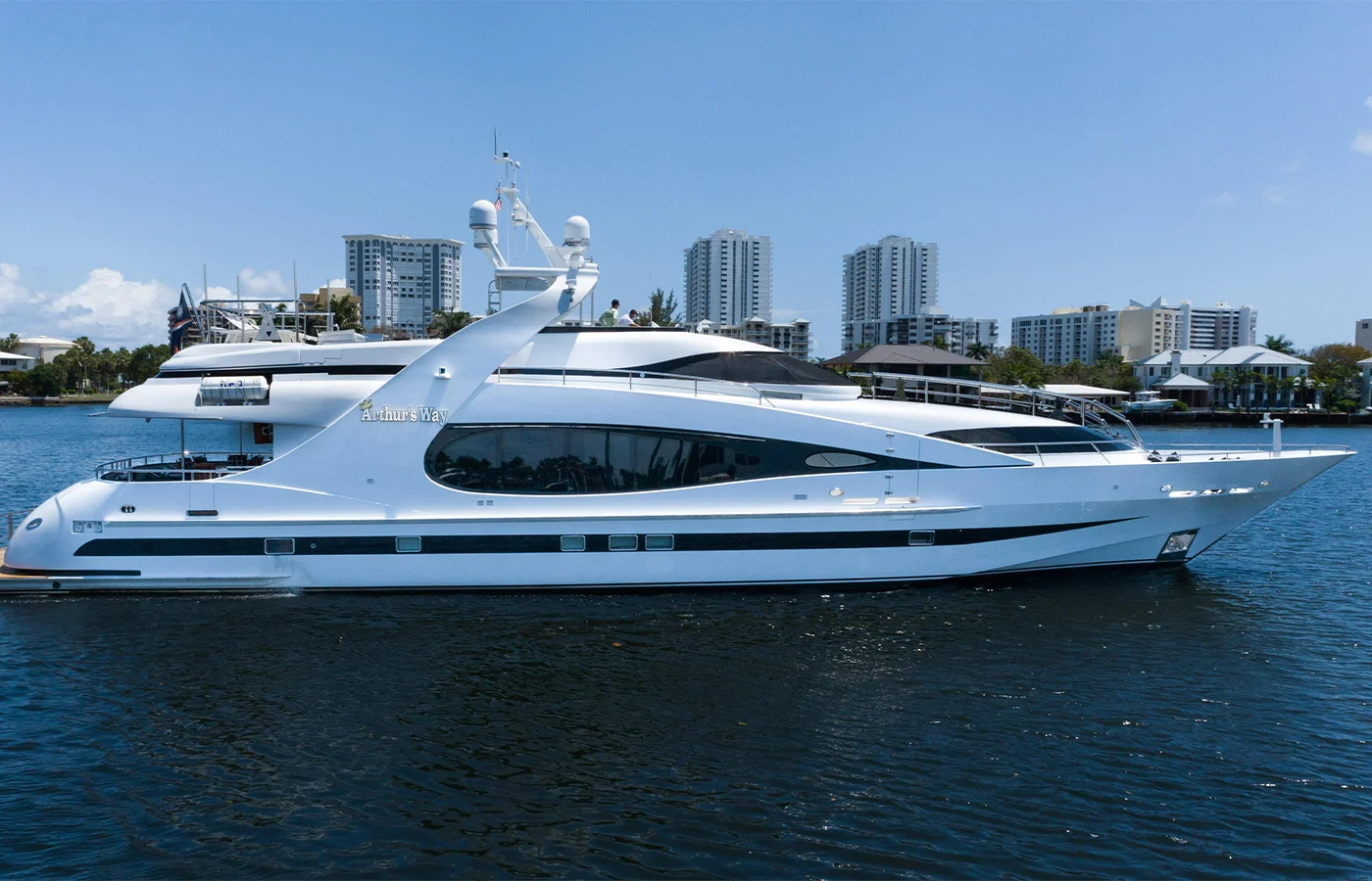 Welcome to Pompano Beach, Florida. I’m Justin Nystedt and today it is my pleasure to walk you through the motor yacht, ARTHUR’S WAY , a 118-foot superyacht built by Millennium Yachts in 2003.