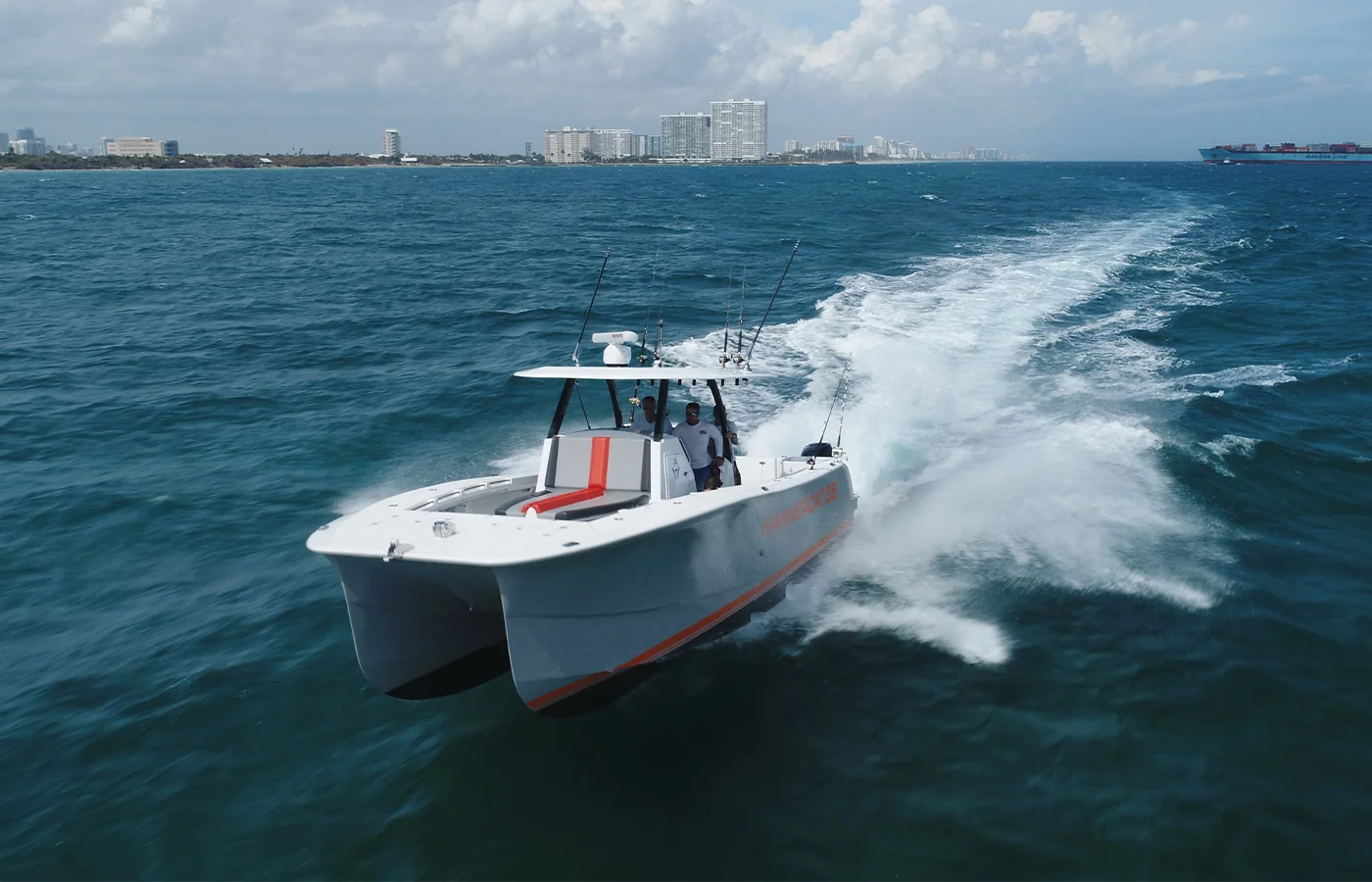 The HammerCat 35 weighs 40% less than competitors’ vessels, which means it can use twin outboards as opposed to quads to reach the same speeds. That means this boat is double the efficiency and half the maintenance. With 2 x 350 horsepower engines, the HammerCat 35 has a range of more than 600m at 30 mph. Her top-speed is greater than 50 mph.