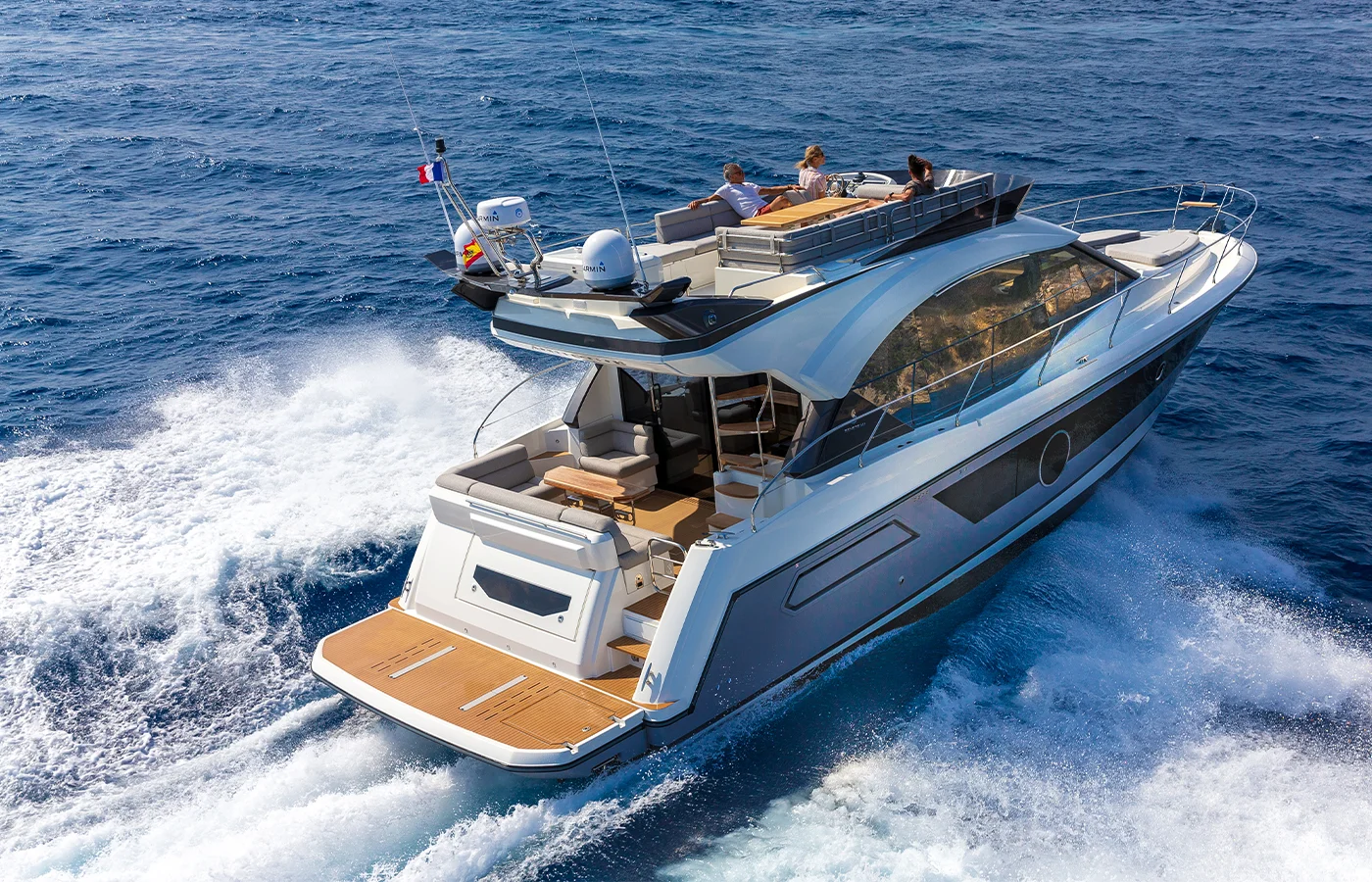 The Beneteau Gran Turismo 50 Sportfly is a sporty boat that’s equipped with the latest technology to offer thrills on the water. With a two-seater co-pilot bench that converts to a sun-lounger and an aft saloon for five people, guests can share a sensational cruise on this new boat. The ship control interface (a tablet to manage air-conditioning, navigation lights, lighting, and hi-fi system) can be accessed from the navigation screen of the flybridge’s driving station. Driving sensations are second to none thanks to Volvo IPS engines.