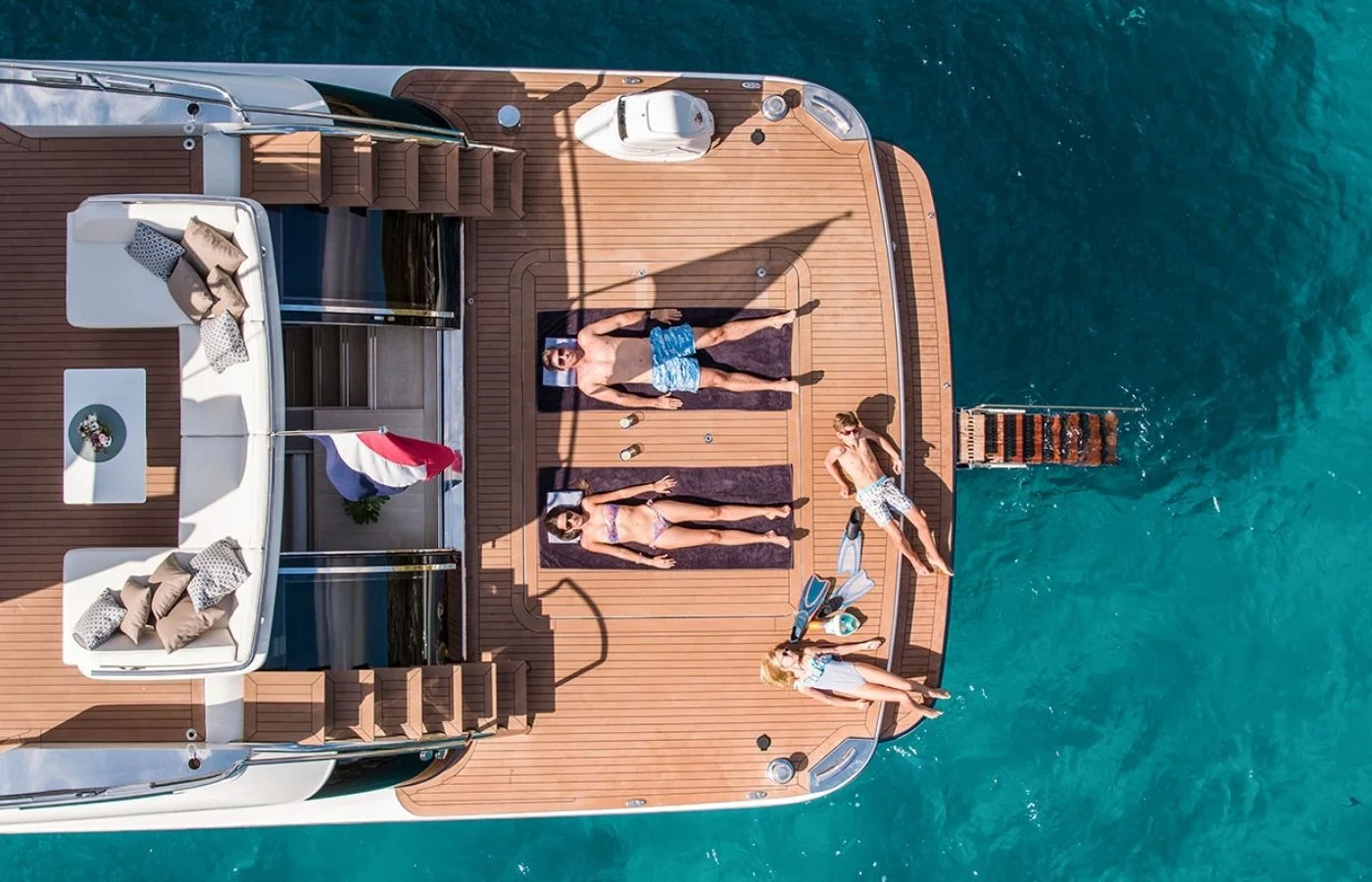 ZARANIA is a Denison yacht charter with all the best amenities. Across this Numarine yacht, you’ll find sun pads, a hot tub, a gym, sundeck, and a Portuguese bridge. But the beach club is where you’ll find us. The garage door opens down to create an expansive swim platform.