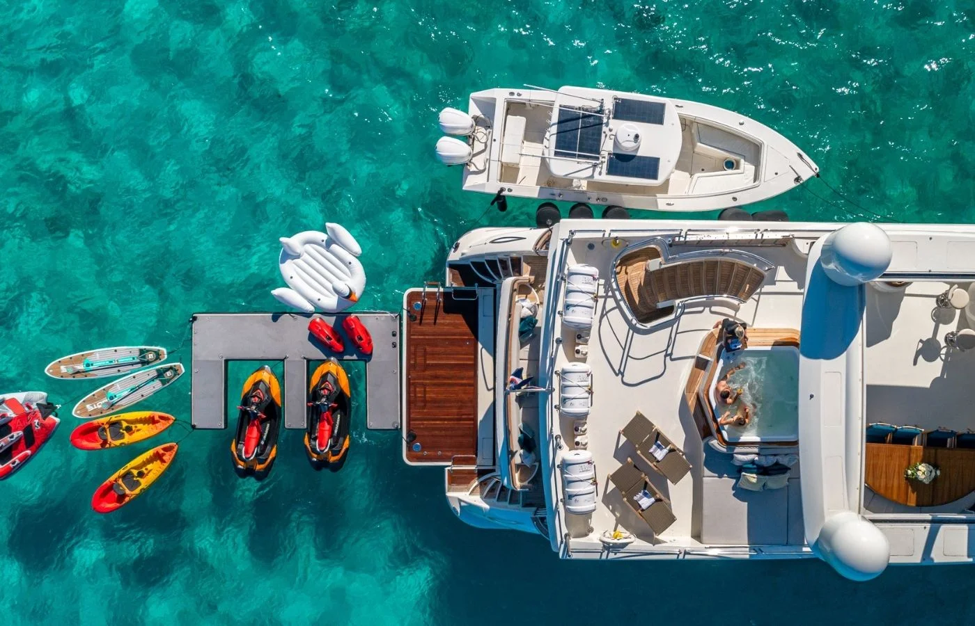 KEFI can sleep up to 8 guests in 4 well-appointed cabins. Accommodation includes a master suite, one VIP stateroom, and two convertible twin cabins. This versatile layout makes it the perfect boat for a family vacation. She comes with plenty of onboard benefits to make your yacht charter a comfortable and entertaining experience. Take full advantage of her toys and tender, including a 28′ Sea Hunt, 4 Seabobs, 2 wave runners, paddleboards, inflatable docks, floating island, snorkel gear, and fishing equipment. As the kids are occupied with the toys, find peace on the flybridge, which is the best spot to relax in the sun or shade.