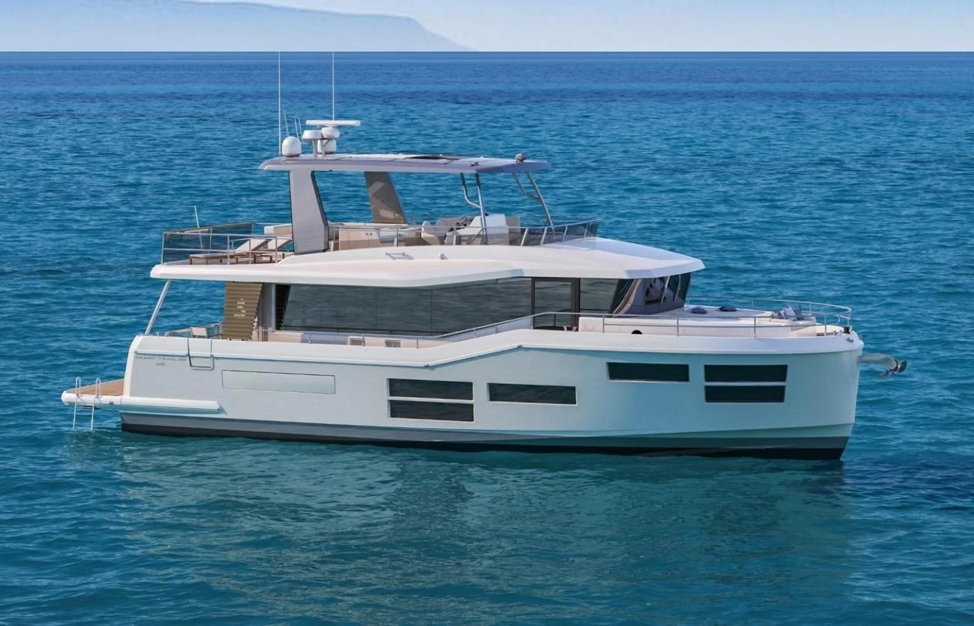 Hey guys, Tony Smith with Denison Yachting. Today we’re here at The Cannes Yachting Festival in front of the 2022 Grand Trawler 62. We’re really excited about this boat and I’m going to give you a quick tour around. A few key features that you should know about the Grand Trawler 62 is that she’s designed for extended cruising. She has a terrace to the sea, hydraulic platform and a full three cabins in addition to crew quarters. One of my favorite features about the boat is the flybridge. It’s got a molded hardtop, tons of seating, two access points and a large helm.