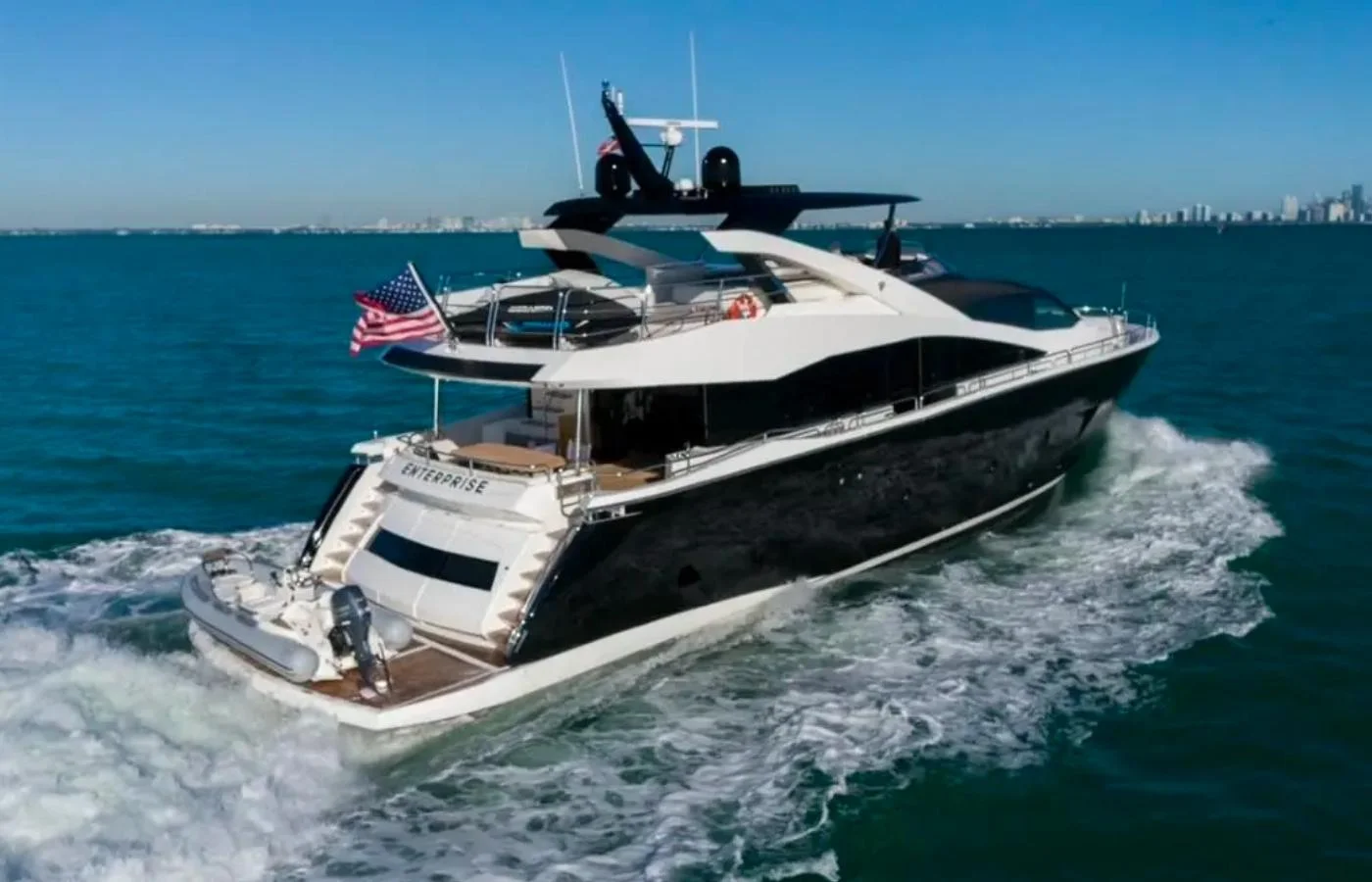 The ENTERPRISE sits on a base dock at a prominent marina here in Miami. The boat has to look good at all times. Something that the owner has done to keep this boat looking amazing is that when it was delivered new, he applied a coat of ceramic coating on the boat and has always maintained every couple of months the application of the ceramic coating and if you look at the hull now, it still has a beautiful shine to it.
