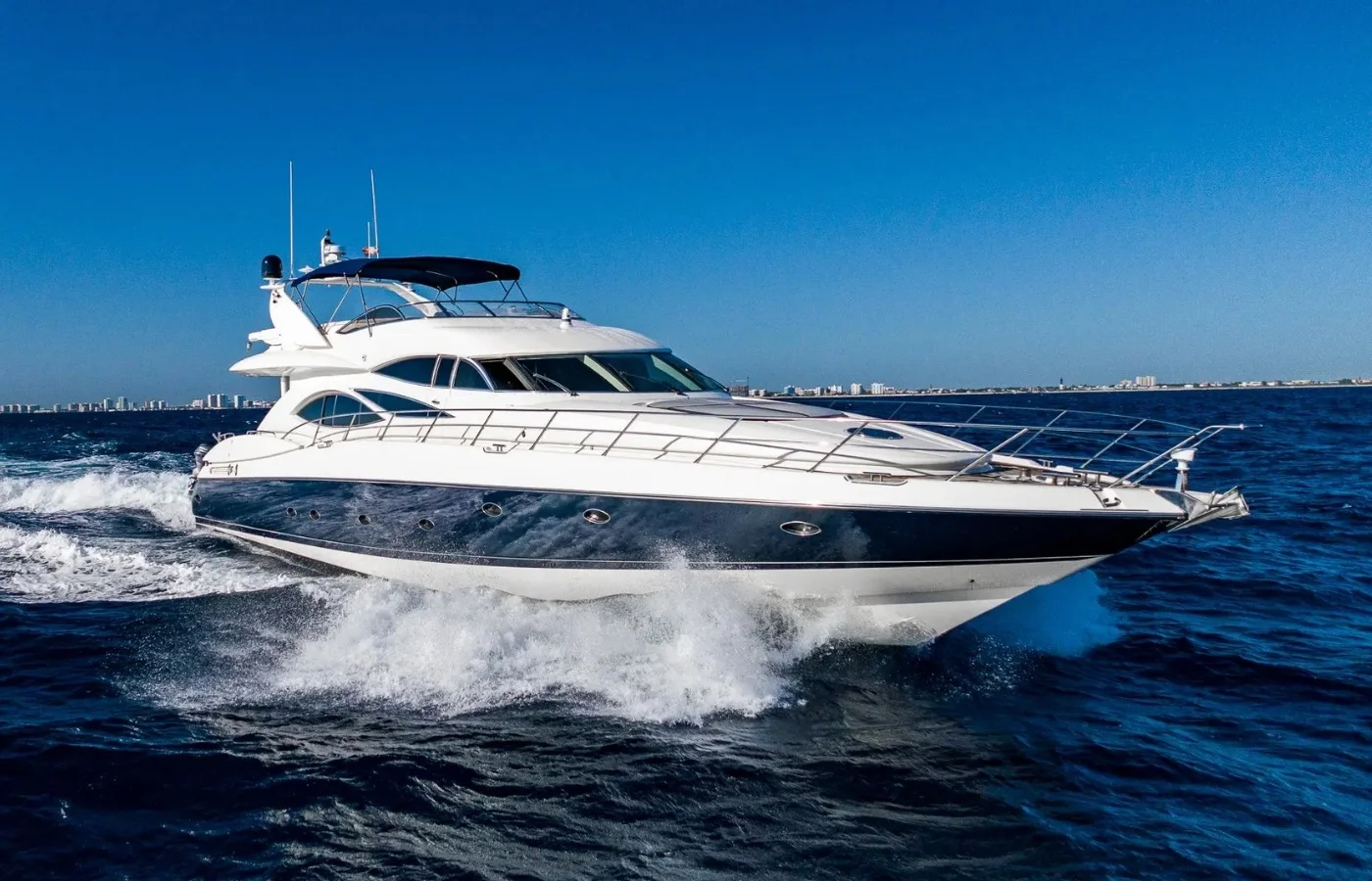 My name is Bobby Giancola with Denison Yachting, and today we’re in Pompano Beach, Florida aboard my new listing, a 2000 Sunseeker Manhattan 84. Before we get today’s walkthrough started, I’m going to go over a couple of my favorite things, starting with the flybridge. For me, I think it’s a great conversational area where you get to enjoy the breeze, the sun, and enjoy the captain operating the boat.