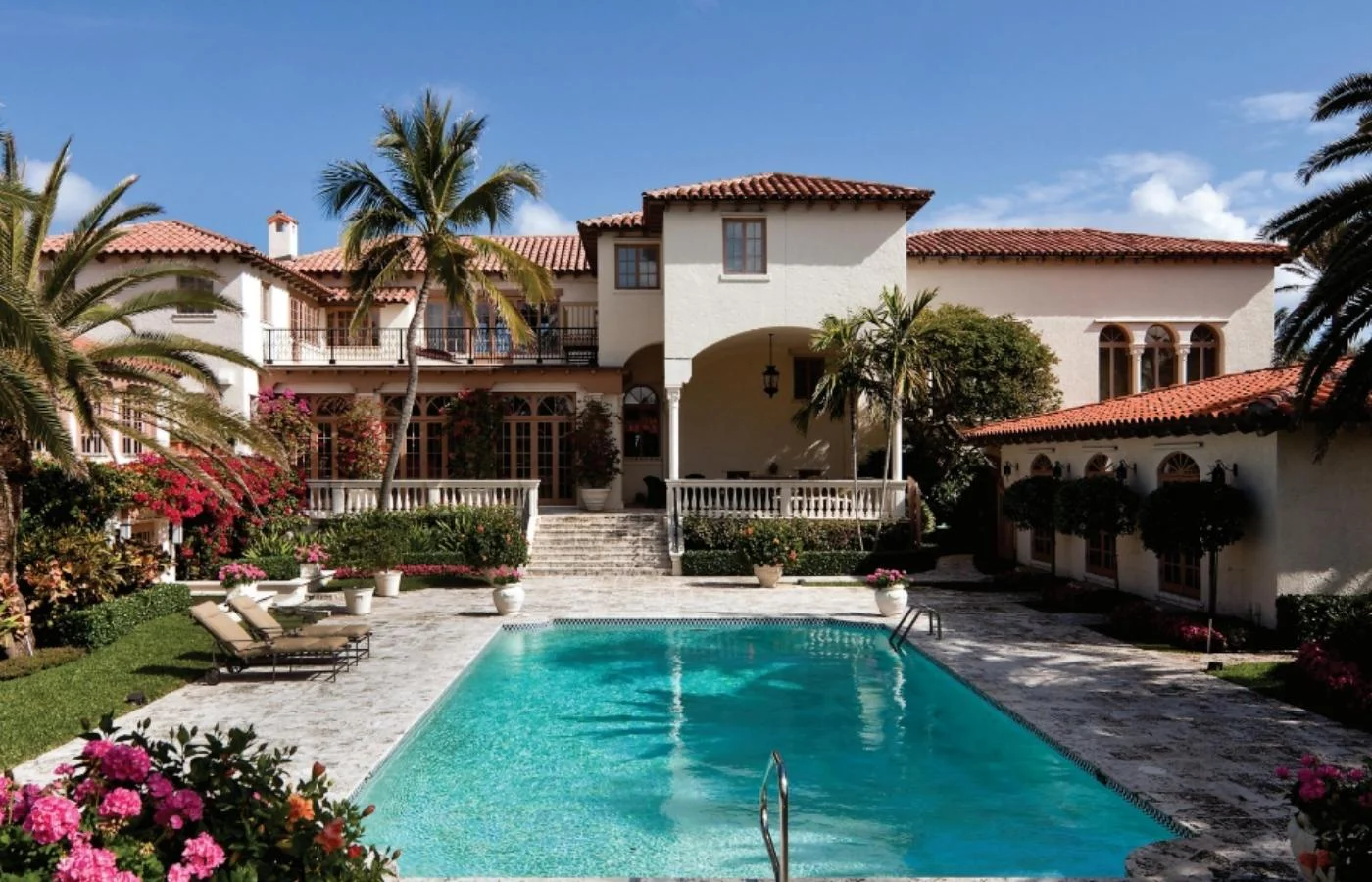 To buoy his spirits, philanthropist Singer asked him to design a convalescent hospital for wounded World War I veterans, encouraging him to explore a look that would be mindful of resort living. Mizner responded with porticos and high-ceilinged rooms opening onto courtyards with fountains to cool the air. Ventilated red tile roofs sprouted towers and turrets to drink in water views. The war ended before it was complete, so Singer turned this magnificent, fanciful, pink stucco wellness palace into the Everglades Club. Its brightness, light, colors and decorative concrete flourishes captured the fancy of key Palm Beach socialite Eva Stotesbury. With her commission for El Mirasol, a 37-room oceanfront mansion at 348 North County Road, Mizner was suddenly the talk of the town.