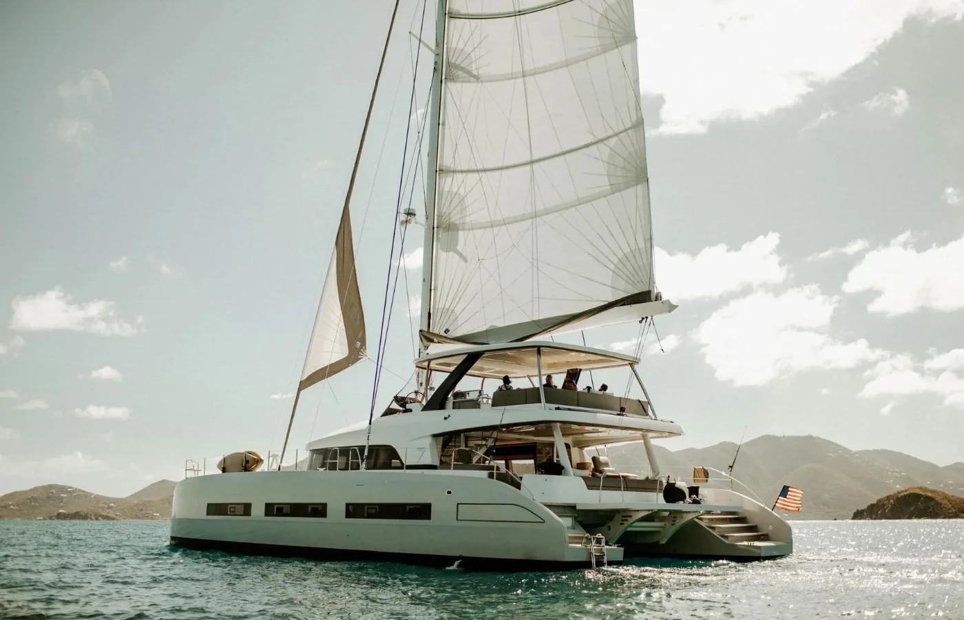 I’m Captain Jack. I’m the captain of TELLSTAR. I’ve been the Captain of this yacht since its inception in Bordeaux, France. She’s a magnificent yacht. She’s a lagoon 77. She’s the flagship from lagoon. And to be quite honest, I think she’s one of the best sailing vessels that lagoon puts out there.  I’ve actually run the Lagoon 44, the Lagoon 45, the Lagoon 560, the 52. Two 620s and now I’m on the flagship for Lagoon the 77. So I’m part of the Lagoon family for a while. Lagoon is really the most prolific builder sailing Catamarans. Out of all the Catamarans that I’ve sailed, I think they do an exceptional job of creating space out of not a whole lot of length. But there’s an amazing amount of space that they get out of these vessels quite frankly I think they sell very well for what we are with generators and washers and dryer and a dishwasher and everything else that goes along with this luxurious Catamaran, I think it sails spectacular.  Yeah we proved that today. We were ripping it out there. Wonderful day I mean we’ve got this hurricane or tropical storm just to the south of us. So it really kind of whipped up the weather and we were able to take advantage of that and really get to get a feel for how the boat sails.  We have a great charter business. We are packed full of charters and this boat books out. It’s a lot of fun. We’ll do charters with families, we really enjoy having the kids out it’s always a lot of fun. And then a lot of times we’ll also have like individual couples. We take up to 8 guests in 4 separate cabins. And typically our charters are 7 nights plus. Keep talking about charter but it’s really not all about charter. This boat is really a great boat just for individual private ownership. This is a big family boat here. When we have families aboard, they can all be together at the table for a meal and then they can all get their own private space. There’s private space in the balcony, there’s private space in the flybridge to create harmony with your family and also feel like you can get away and get some private time.