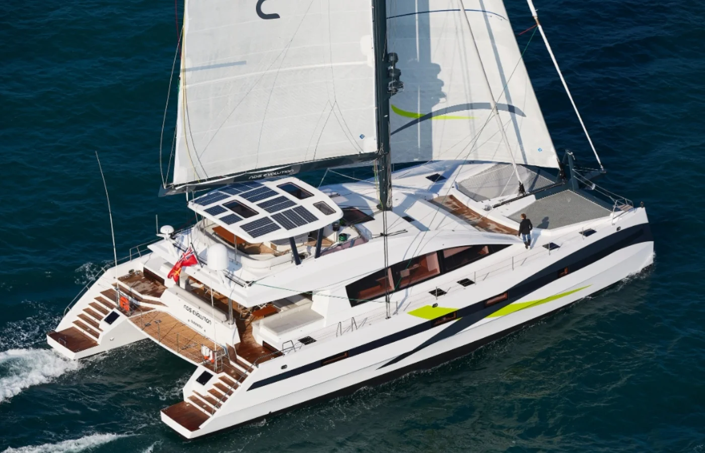 We’ll start today’s tour here on the flybridge where the guests will be hanging out most of the time. A couple things that jump out at me right away, first we’ve got the clotheslines here which obviously that you need something like this it’s really nice. So why not have them. This is a great place.  Something that you don’t see on a lot of Catamarans is a really well designed drainage system and I see right there where you’re standing, what is like kind of like a channel that’s cut into the off section works its way around and then it gets quite deep there and you have a really good drain rather than the water just running down the stairs. And I’d like to point out also that you have a little door here that’ll flip over and you can cover that whole area right there. Really sectioning that off. So obviously multiple areas on board the boat for dining. This is the one that has the best view I would say and also the nicest breeze. Great seating up here, got storage under all this area here and under the settee up here we’ve also got two refrigerator drawers. And one final thing while we’re standing back here, I’m looking at this hardtop. This is a substantial part of the boat I see that it’s you know. You’ve got the frames coming down supports, it’s built in solid fiberglass.  It’s quite good because it’s also quite useful when you’re dropping the mainsail. So you can work on the boom easily, you feel safe. You can work and walk. And then that’s where we have all the solar panels for the electricity.  Walking forward on the flybridge we’re getting up to the helm area. I see a really nice complement of Harken winches and Furuno and B&G equipment. I think this boat is very well equipped to handle every condition. For instance, on the way up here you guys hit 16 knots under sail coming up from Fort Lauderdale recently. Is that the top speed you’ve seen?  Yeah, mostly it’s been around that at the top speed 16-18. 18 is very impressive for an 85-foot Catamaran. What were the conditions? We were selling with 30 knots downwind so that would help also with a bit nice swell pushing us along. But the boat sails easily and very comfortable around 10 to 12 knots and you don’t feel that you are pushing the boat ever. You have a good balance always between the sails and the sea conditions. It’s quite a good thing to be so high up also helps to have a good visibility through the horizons.  As you can see here we have B&G and two Furuno displays. They are completely independent systems that means they have their own GPS antenna, radar and wind indicators. Also we have two independent autopilots. We also have a FLIR camera. Over here we have a ODS. It’s a Ocean Data System that records all the values of tensions on the masts.