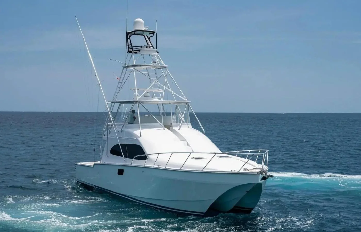 What makes this Sportfish stand out at first glance is her high freeboard catamaran hull, the walkthrough upper helm forward to the bow for single-handed docking, and tuna tower with full helm controls, electronics, and joystick. With accommodations like a 60-footer, she has an extra large interior living area with a high-volume full-beam master, 6’10” headroom, and full-size master shower/tub.