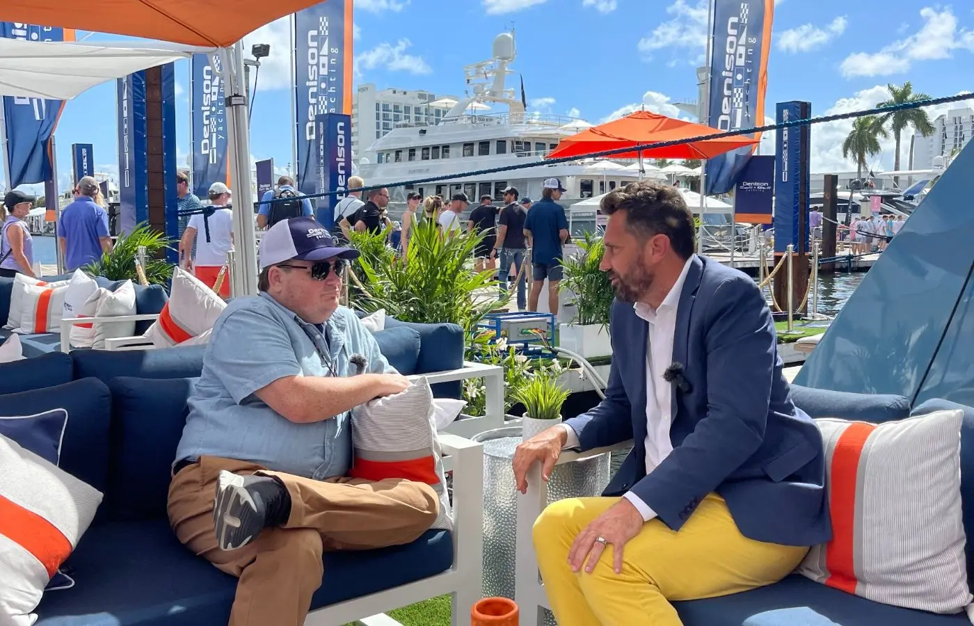 Clif got the VIP treatment, literally starting his day at the Denison + Holman VIP House, then taking a private boat ride to the show. Clif got to tour some of our nicest yachts for sale, including the impressive CHAPTER 3, SHALIMAR, NEREUS, and charter yachts VIVACE and ACACIA, often with more (accurate) commentary from him than some of our brokers! He even got to sit down with the one and only Bob Denison for some quality time and an interesting Q&A session.