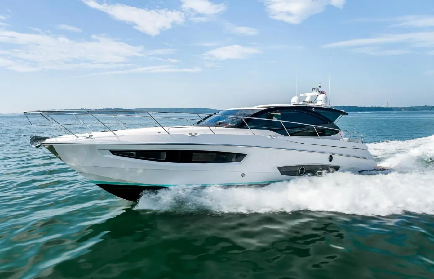 My second favorite feature is the retractable hard top which again, it just creates a whole other space in making the boat feel a lot more open. You can get sun in, get fresh air in. And then my third favorite feature has to be this retractable flat screen television. With a push of a button, you can have this thing come on up and, put a sports game on, or you have kids just hanging out and want to watch a show for a couple hours to get out of the sun. So the biggest reason why the owner decided to build with Rio Yachts has to be because of all the natural light that comes in through the large windows tractable sunroof on this boat as well as the one-piece windshield. That’s really the biggest feature of the boat is the natural light and windows, and it makes the boat feel two to three times bigger than it actually is. When you step on board this boat and you go down below and you sit in the living area or go out on the aft deck, you feel as though you’re actually on an 80-foot boat, which really was appealing for the owner.