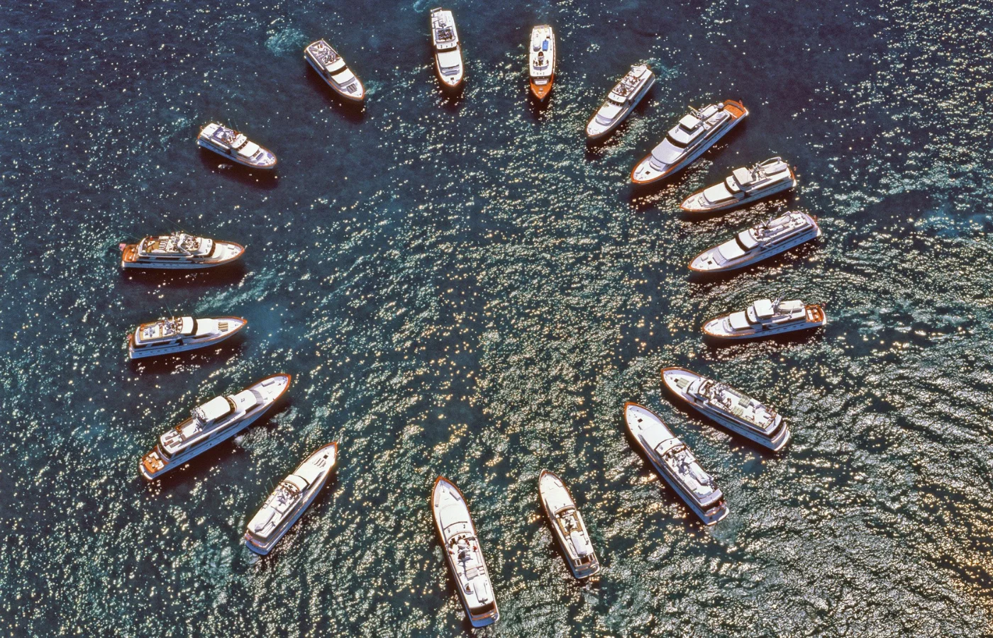 I’m always awestruck by the “circle” photograph that was shot at one of our early Broward Marine Rendezvous. It was taken by Ken and Donna Chessler, who were hired to be part of our marketing group headed by Mel and Marty Wolfe. They were not experienced yacht photographers and equally uncomfortable about the notion of riding next to the open door of a helicopter hovering over the open ocean just off Key Largo. Equally daunting was the fact that none of the captains, experienced as they were, had ever attempted a perfectly spaced shot like this.