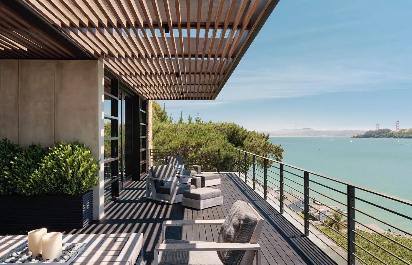 The site he purchased features a driveway with a 15-percent grade down to the home’s site, which itself sits on a 20- to 30-percent slope. “We created a journey from the top of the street, obscuring any views of other houses and opening up to the view of the bay,” says Adam Rouse, project architect at Aidlin Darling Design. “You’re experiencing this house from the top level down.” Rouse and Joshua Aidlin, co-founder of the San Francisco-based firm bearing his name, wanted to integrate outdoor spaces into that steep slope so that their client and his family could spend their time outside.