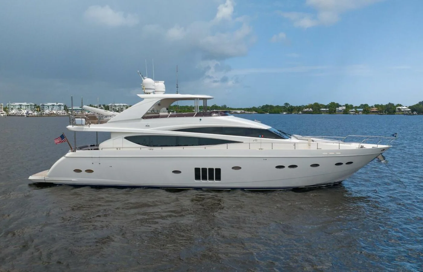 Hey guys. My name’s Paul Denton with Denison and Yachting. Today, I’m running an 85’ 2009 Princess. Let’s take a look. We’re going to start today’s walkthrough video on the flybridge of this 85 Princess. Three features I like about the vessel the most are the retractable sunroof, hydraulic swim platform, and zero-speed stabilization. Now let’s get to the tour.