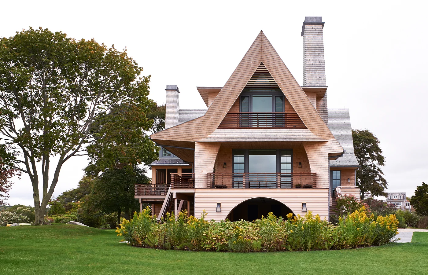 Sited on an acre and a half, the home came with restrictions on how and where it could be built. Anything within 1,000 feet of the water falls under the purview of the Coastal Resources Management Council. “They designated a strange footprint that looked like a little Pac-Man,” Kligerman says. “And it had to be raised 12 feet off the ground.”