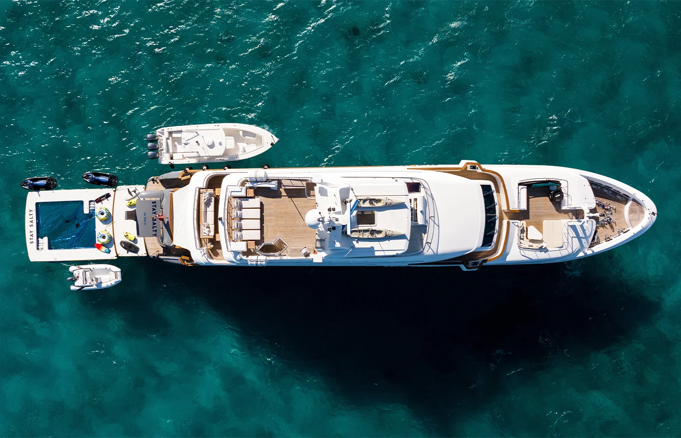 And, oh yeah, STAY SALTY has all the water toys that make chartering in the Bahamas so much fun. When it comes time to explore the Bahamas-blue water when you arrive in a remote anchorage, the crew can easily take guests out on the 34-foot-long Jupiter tender and 17-foot-long RIB. The awesome water toys include jet skis, Seabobs, and water skis, if you want to enjoy an active holiday, and plenty of other toys and rafts if you’re looking for a more relaxed day on the water. And better still, the thoughtful crew will make sure your time aboard is unforgettable no matter what you choose to do.