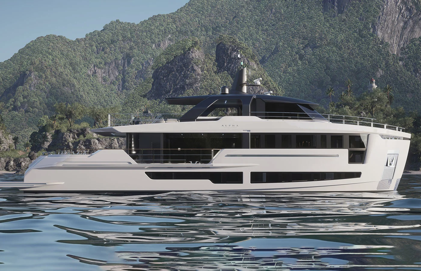 The 100’ Alpha Squalo Trenta is a raised pilothouse motor yacht designed for optimal use of exterior and interior spaces. With its bold profile, vertical bow, and sleek lines by Italian design studio Roberto Curtó, the yacht combines modern aesthetics with functional innovation. This new build emphasizes a connection to the ocean, offering outdoor amenities like a plunge pool on the aft deck, which sits above a toy garage, and a covered open-space deck for al fresco dining.