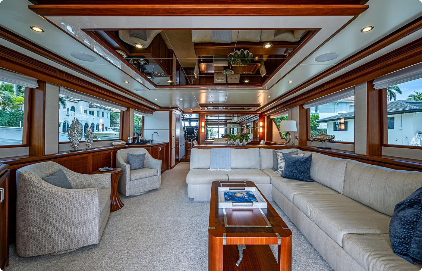 UNCORKED features a full-beam master suite, a spacious interior layout, and an expansive flybridge. She is powered by MTU engines with a recent borescope report confirming their good condition. Equipment includes hydraulic stabilizers, bow and stern thrusters, and a Yacht Controller system. Her interior was designed by Destry Darr.
