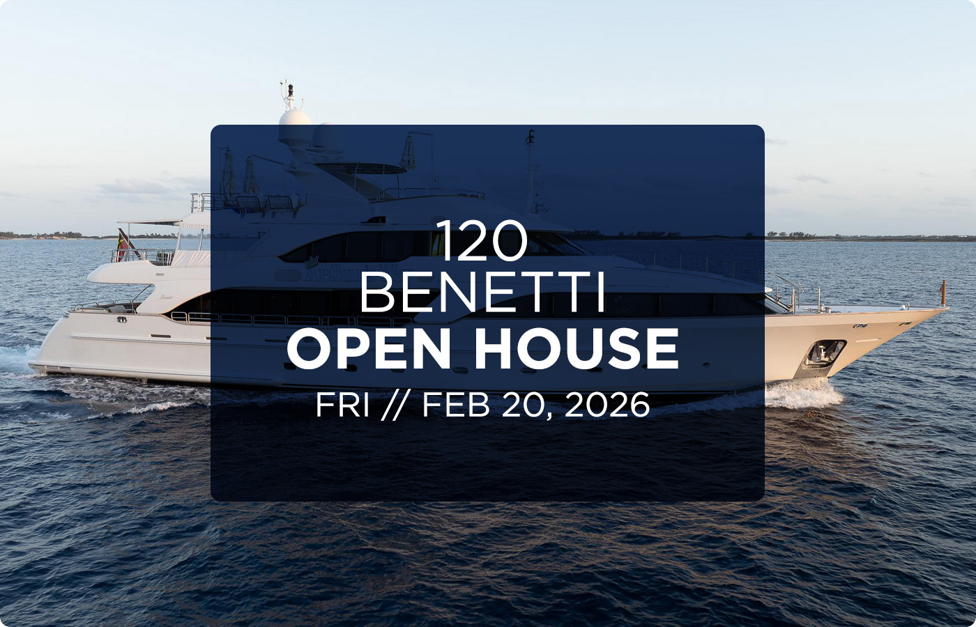 Denison invites you to join us aboard a 120′ Benetti Classic, at the Universal Marine Center in Fort Lauderdale from 3PM to 7PM on Friday, February 20th. Denison Brokers Will Noftsinger and Paolo Ameglio will be onsite to provide tours and answer any questions you may have.