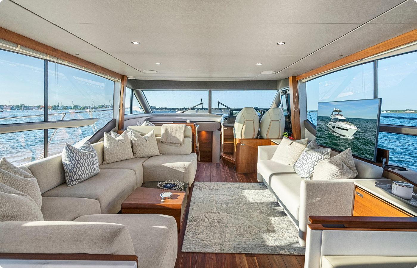 STUMPED reflects Princess Yachts’ design approach and uses infusion construction, which allows features typically found on larger boats. Her flybridge includes a large dining area, an aft sunpad, and a circular forward seating area that converts into an additional sunpad. She also has a walkthrough foredeck seating area and a standard hydraulic bathing platform.