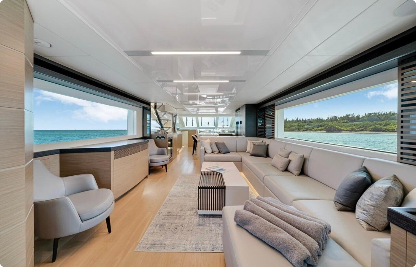 VALIANT was extensively upgraded and customized by experienced owners working closely with Horizon’s design team, with practical improvements that enhance usability while keeping a clean, modern look. Built for long-range cruising, she can run at planing speeds over 20 knots when needed, and the enclosed command bridge offers generous space, strong visibility, and effective air conditioning for comfortable longer runs. The interior décor is cohesive and contemporary, with details carried through from the flooring to custom LED lighting, and the office can easily convert to a 4th stateroom.
