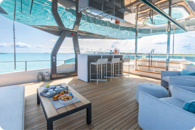 On deck, EROS guests have lots of space to relax. The sundeck features a hot tub and bar. The bridge deck dining area is the perfect place to enjoy a long relaxing dinner. And the large beach club is the perfect spot to sunbathe, swim, or launch one of the many water toys that are available.