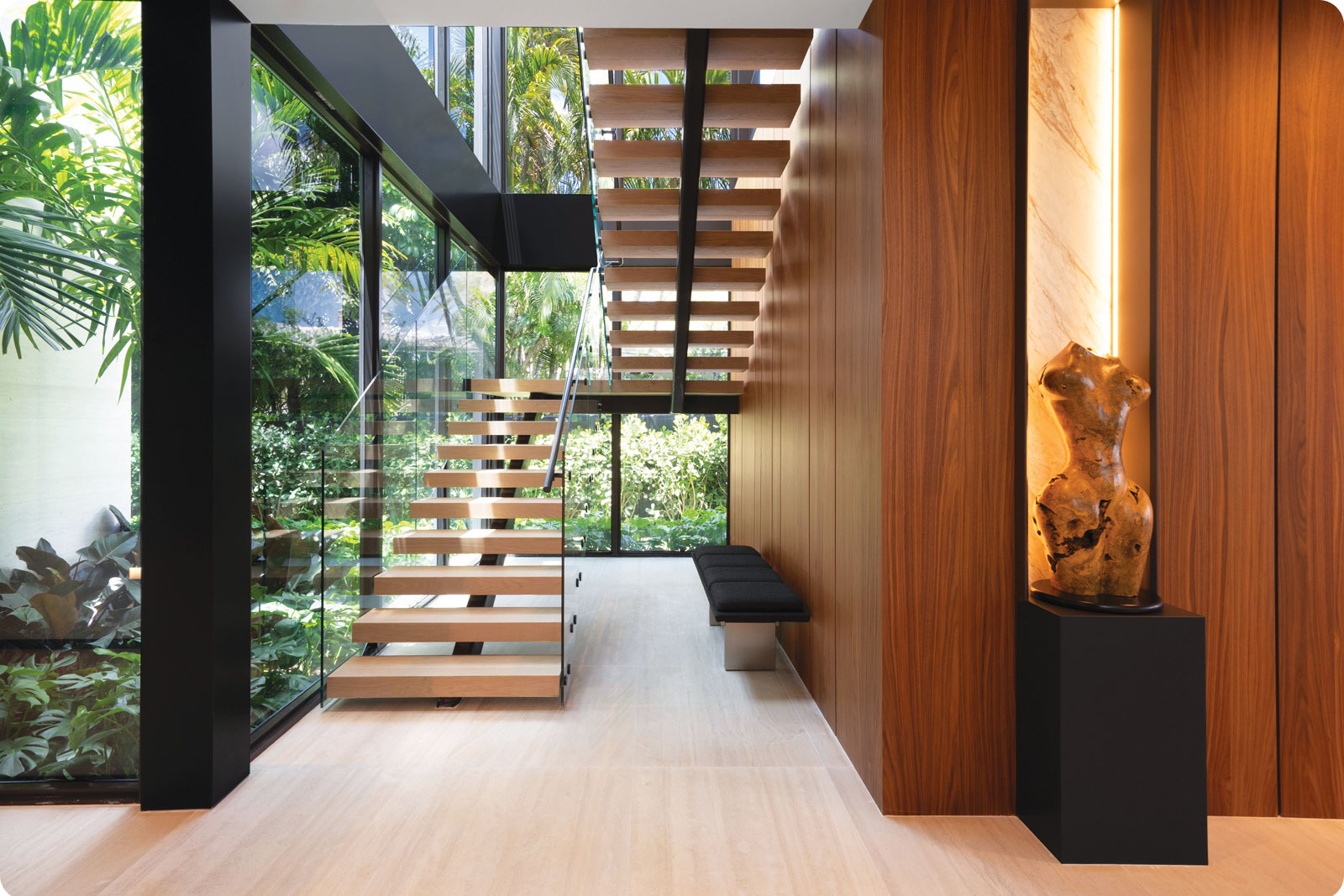 throughout its volumes. “As you enter the house you’re greeted with a double-height wall space that features the bar and sculpted staircase,” Fleischman says. “If you keep walking to the kitchen, you’ll find a stone island balanced with the sculpture of the stairs and framed views of the canal.”