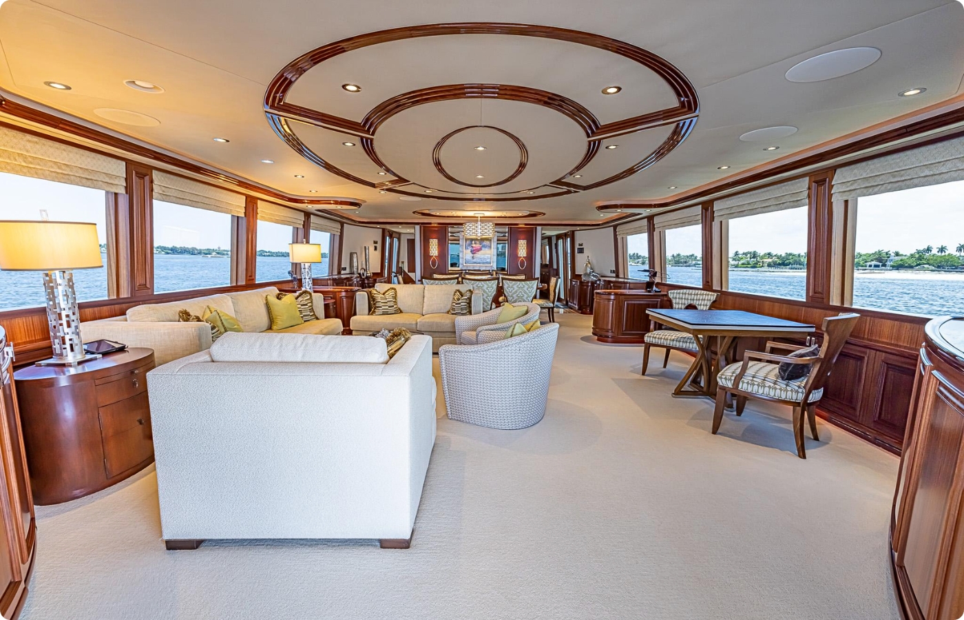 SEAHAWK provides four deck areas for outdoor entertaining: an aft deck with seating for eight and a full wet bar, a flybridge with a second wet bar, a sundeck with jacuzzi and tender deck, and additional outdoor spaces throughout.