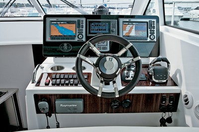 At a glance, it’d be easy to lump this boat in the coupe category, with other top cruisers like Sea Ray’s 410 Sundancer, with its three-sided enclosure. The Sundancer is a new boat, due to debut about the time you read this, and pricing wasn’t available as we went to press. With twin 375 hp Cummins MerCruiser Zeus pods it delivered a 35.6 mph top end. While the 41 Cantius is available with IPS, the tester I ran turned its props through twin Volvo Penta DPH diesel sterndrives. The combination of this propulsion, and its vented stepped hull, had me comfortably romping across a choppy Lake Michigan at 27 mph, topping out at 38.9 mph. Docking via Volvo Penta’s joystick proved a snap against the wind, and, as an aside, I also docked it in the conventional manner. If you want the trimability, shallower draft and efficiency afforded by sterndrives, my test proved their suitability in this application.