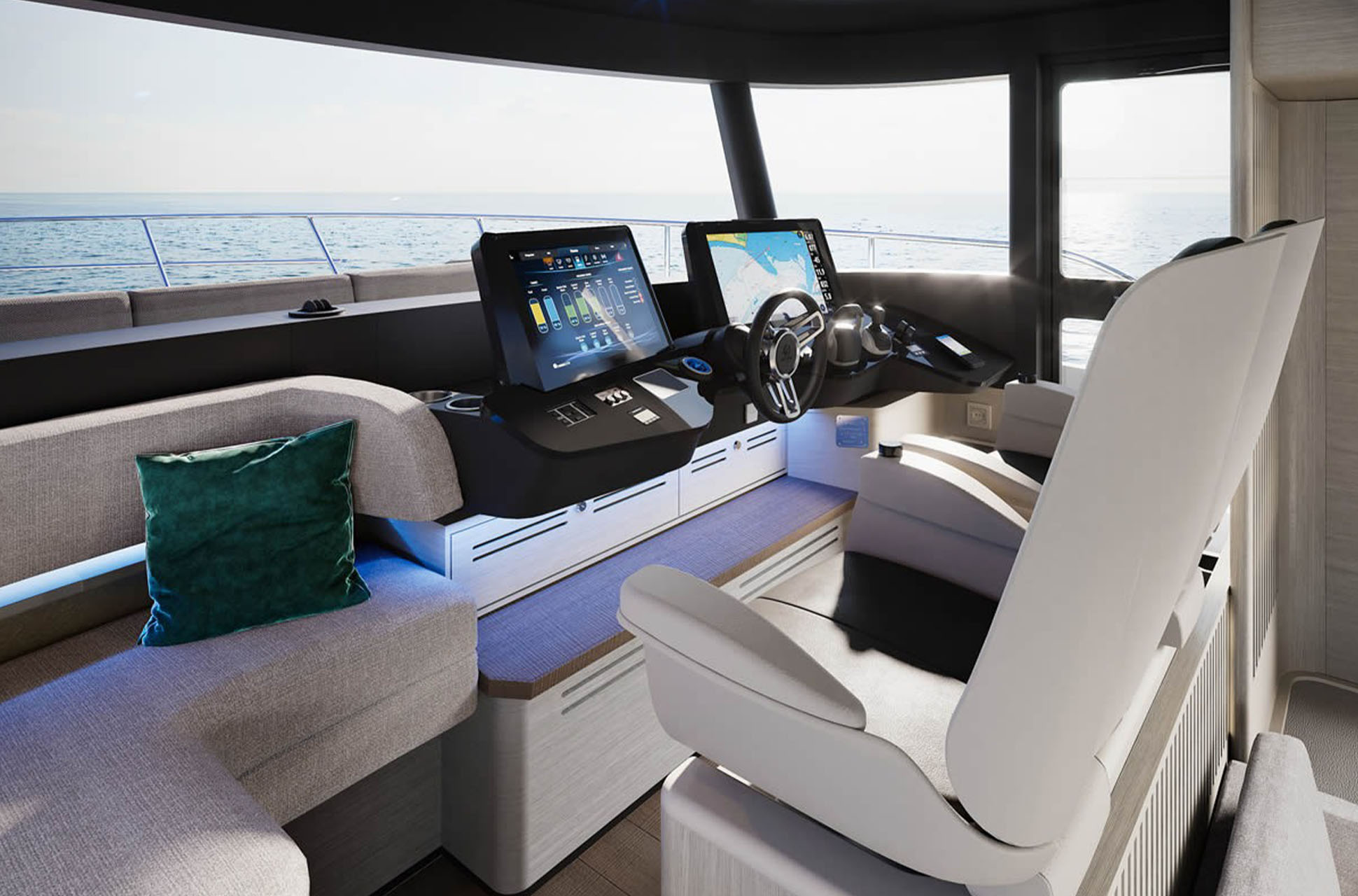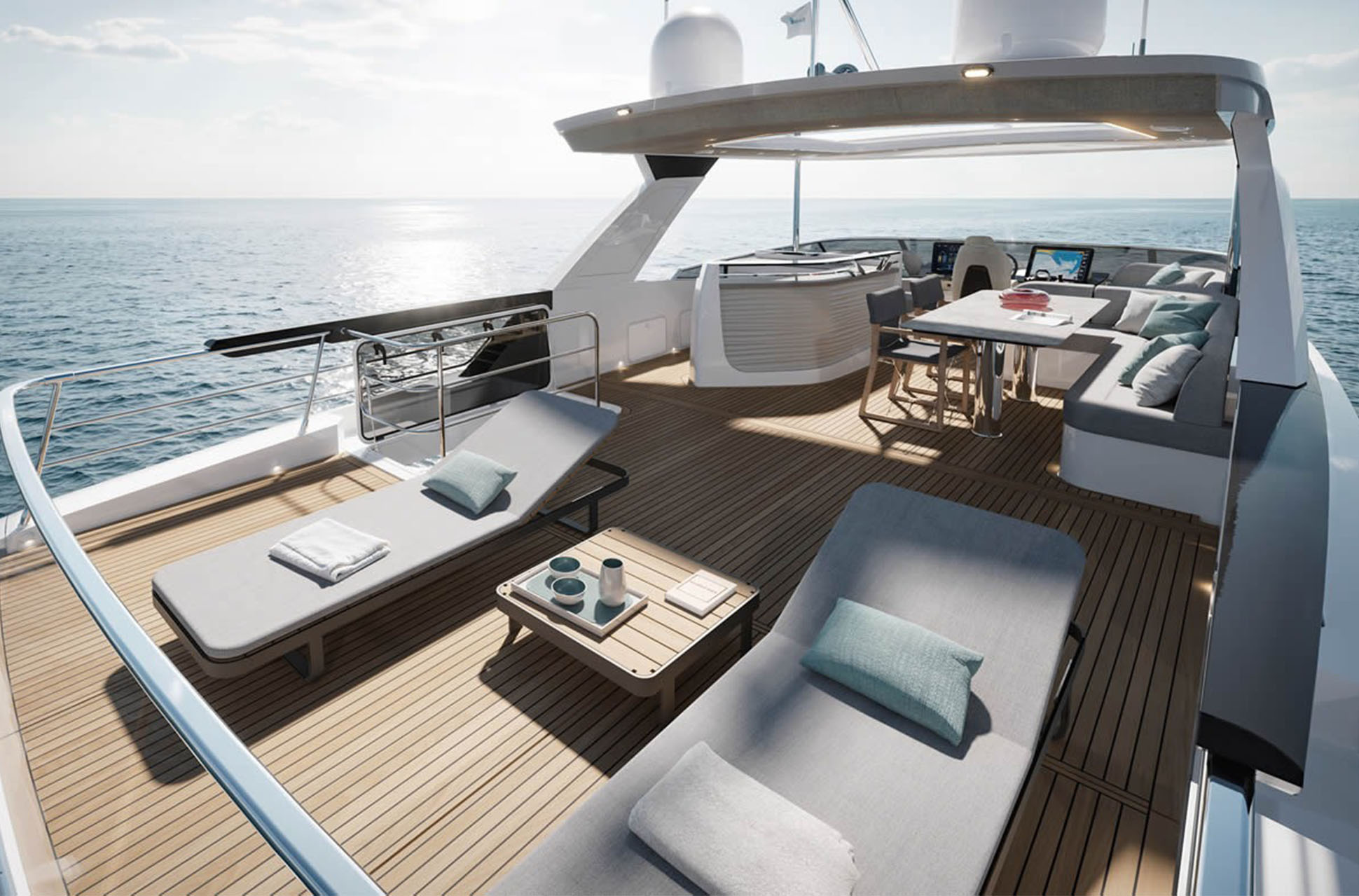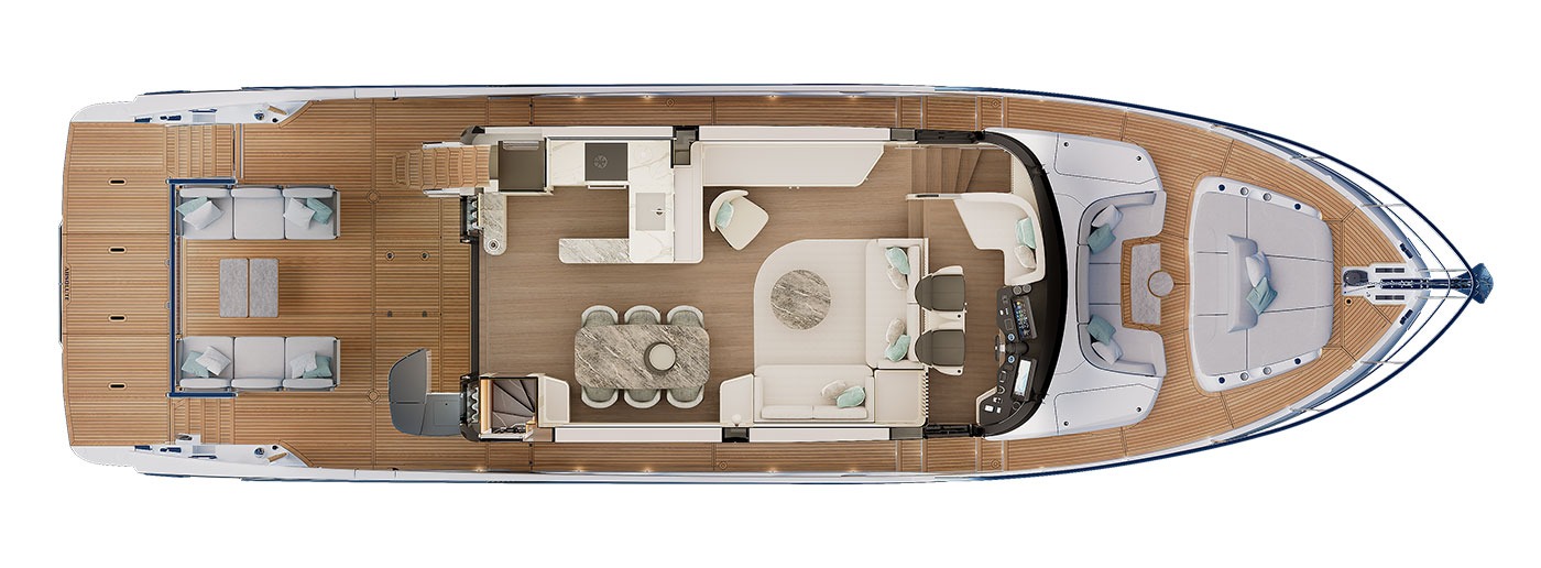 Up top, the flybridge is set up as a true all-day retreat with distinct helming, dining, and lounging zones, plus modular furnishings so you can reconfigure the space depending on whether you’re cruising, hosting, or relaxing at anchor. Down on the main deck, the cockpit terrace adds a privacy awning for more sheltered enjoyment, while the foredeck is fully equipped for lounging and sun time.