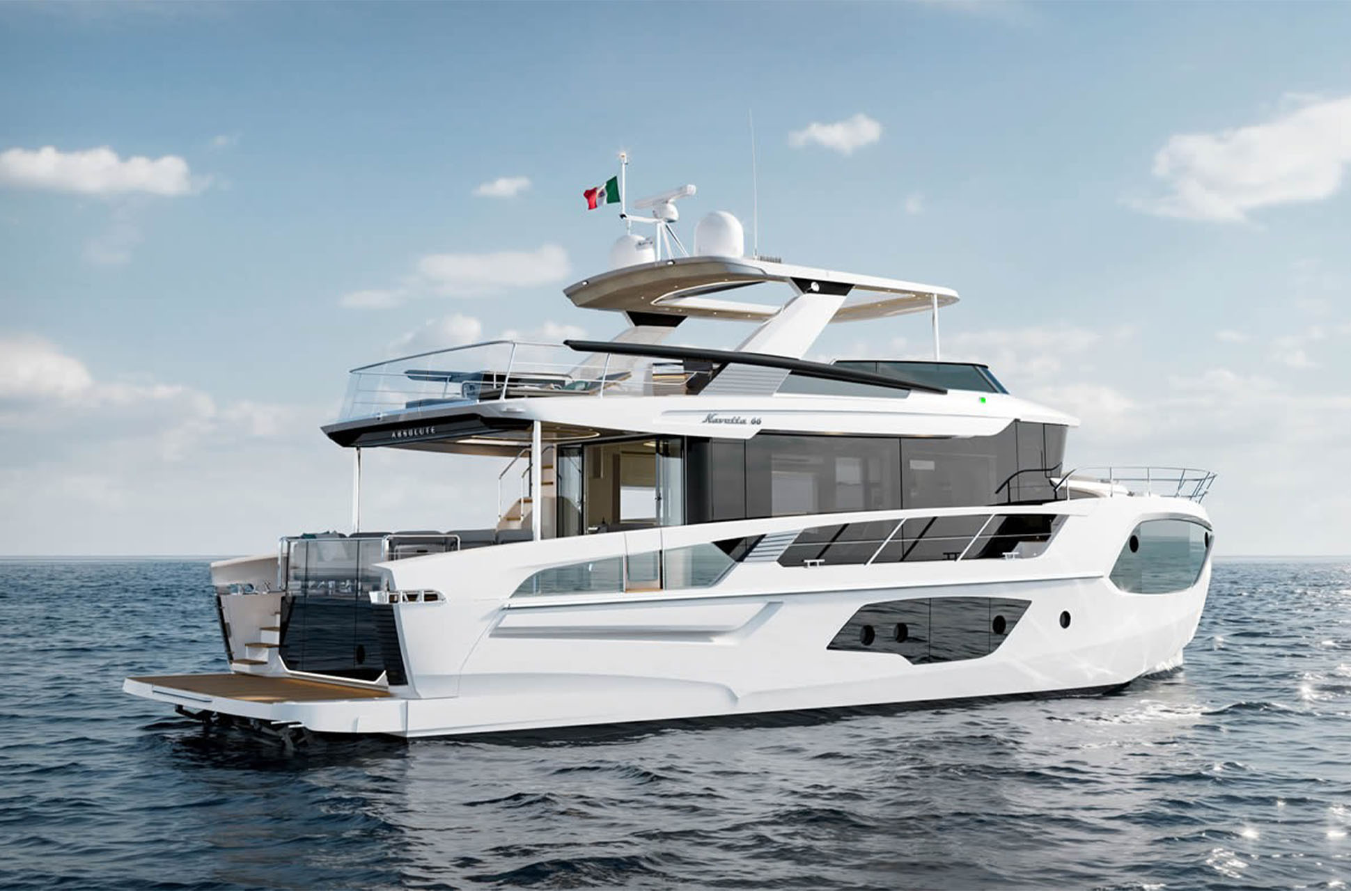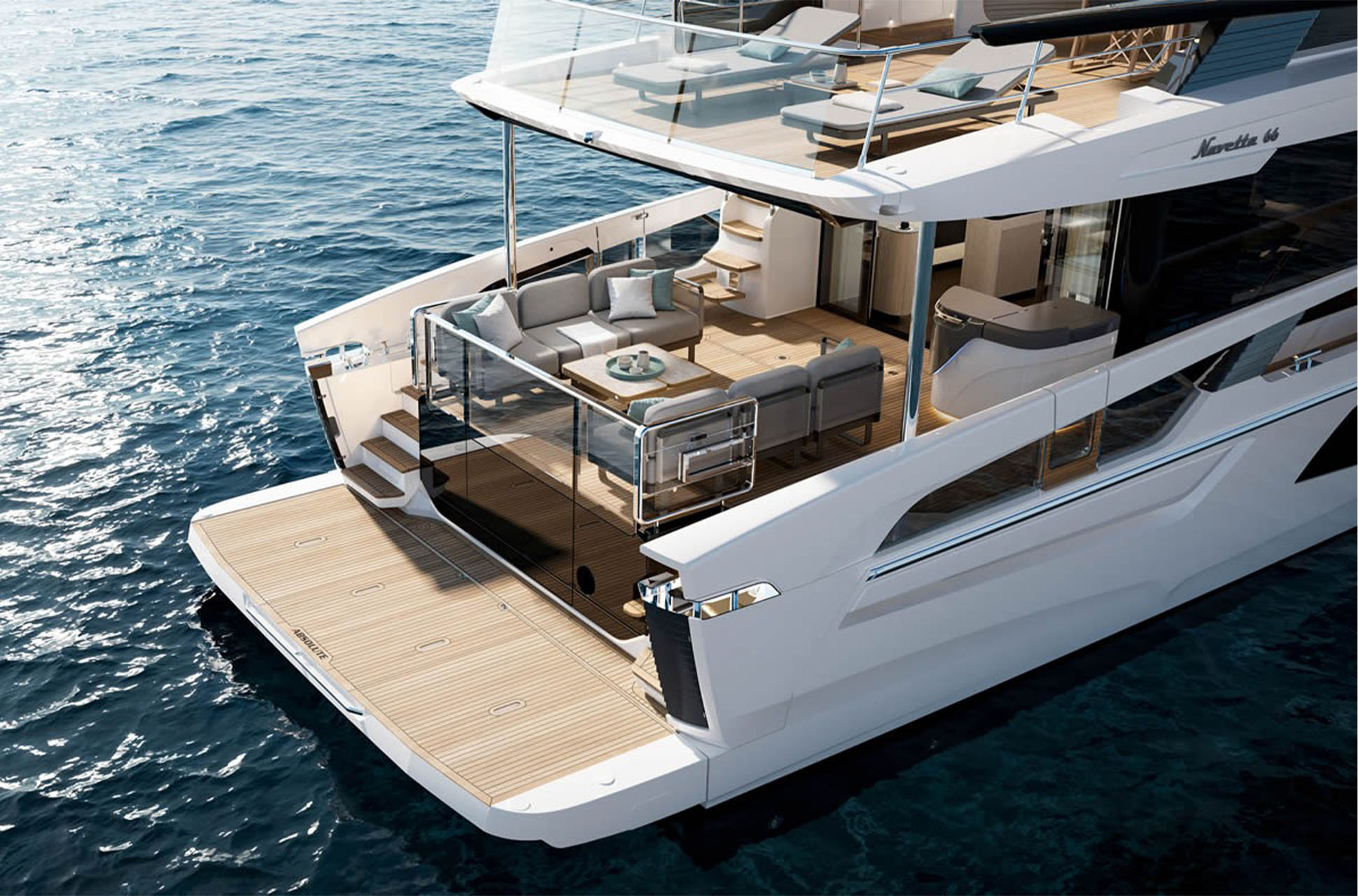 The Absolute Navetta 66 (The Absolute Aurora) is a 66-foot cruiser designed to feel open, bright, and genuinely connected to the water, with expansive windows and transparent gunwale glazing that keep the sea in view from the main deck living spaces. The overall layout is built around outdoor living, with spaces that flow naturally from the cockpit terrace to the foredeck and up to the flybridge.