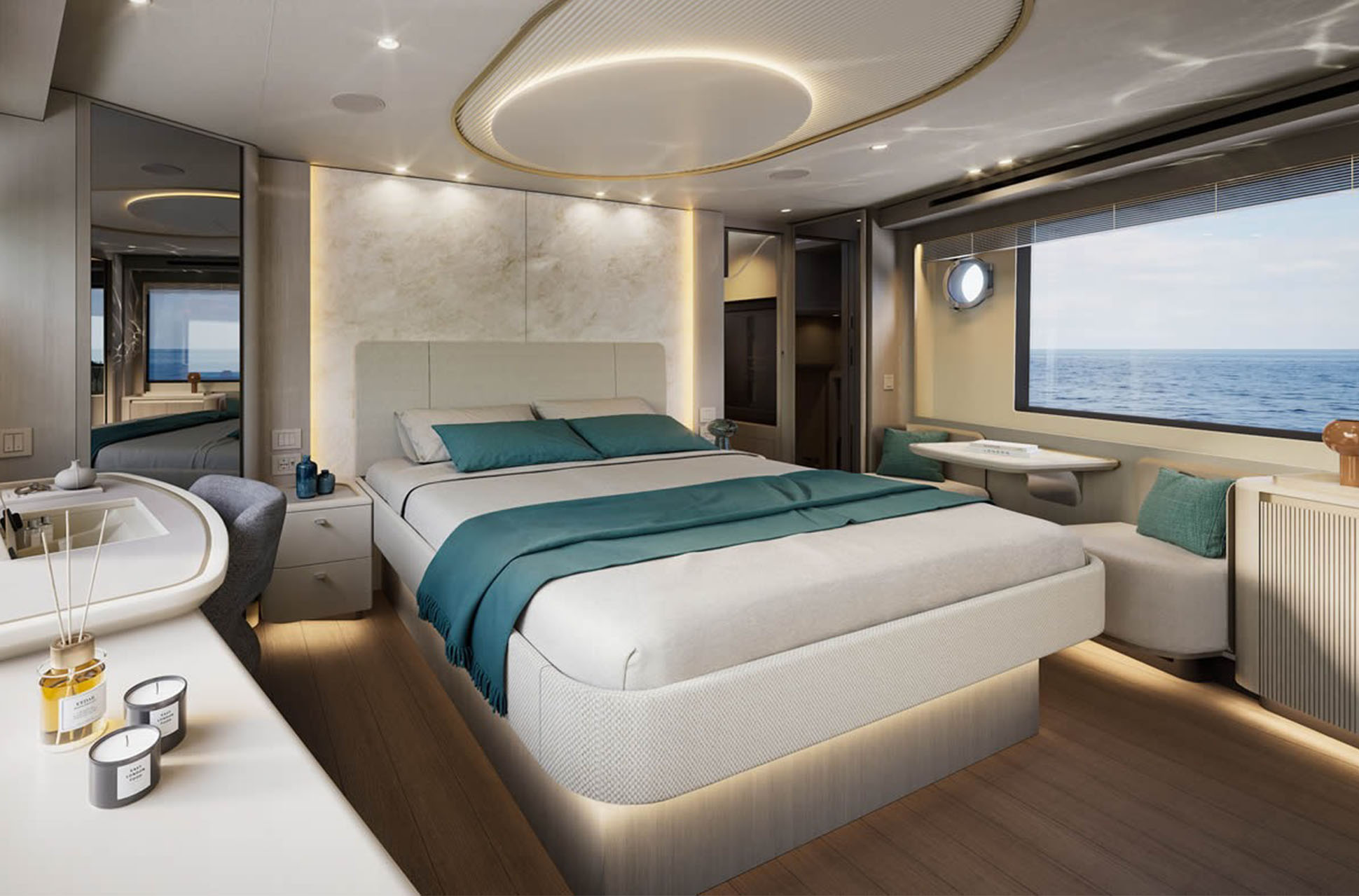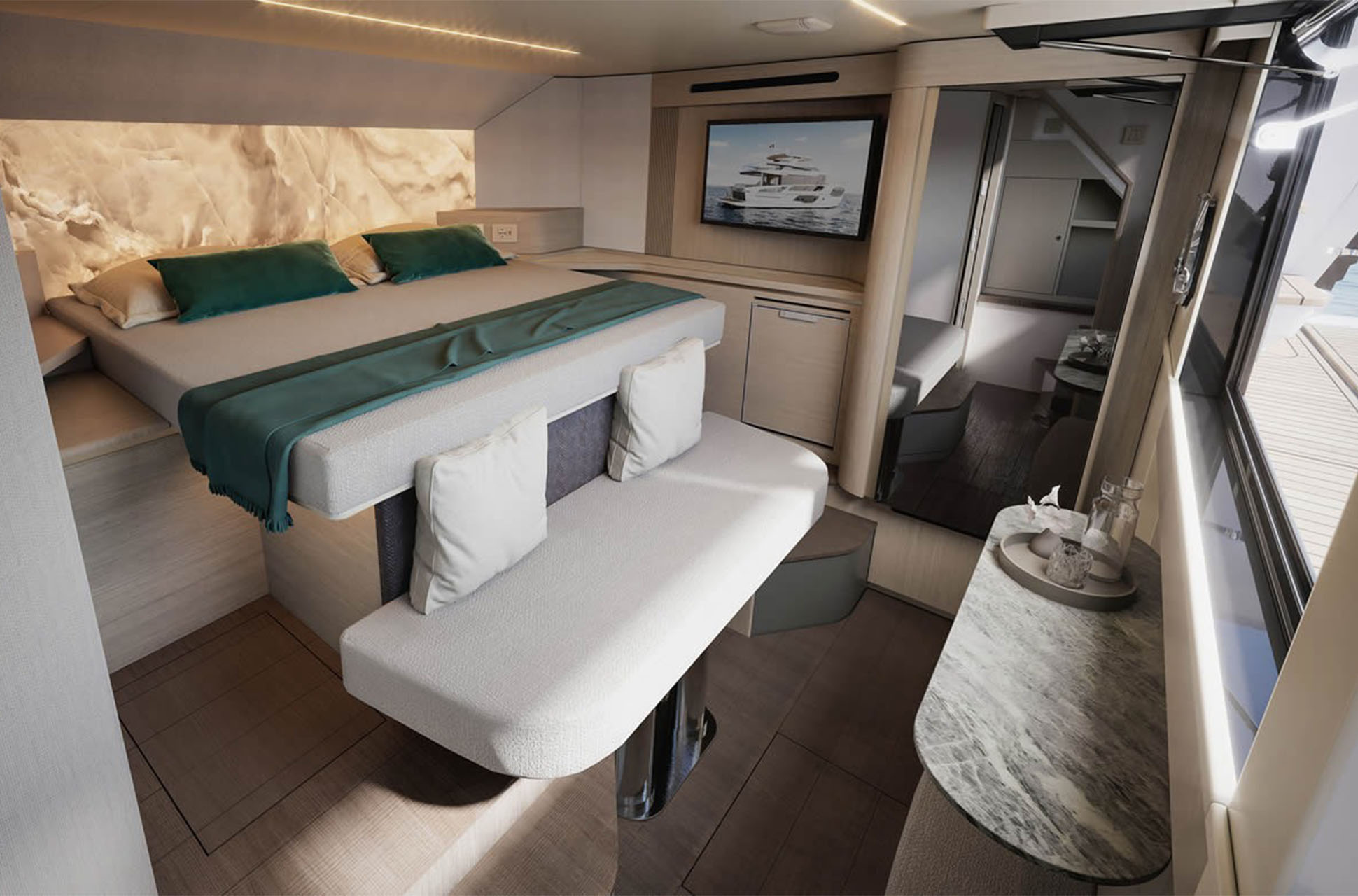 Below deck, the accommodations are built for real cruising with family and guests. The forward owner’s suite is designed as a bright, private space with large windows, while the stern VIP is laid out to maximize room around the king-size bed. A twin guest cabin adds more flexibility, and the standout feature is a fourth cabin positioned just above sea level, with a settee that converts into a double bed at the touch of a button for a unique, waterline-level retreat. Dedicated crew quarters round out the layout for longer trips or added support onboard.