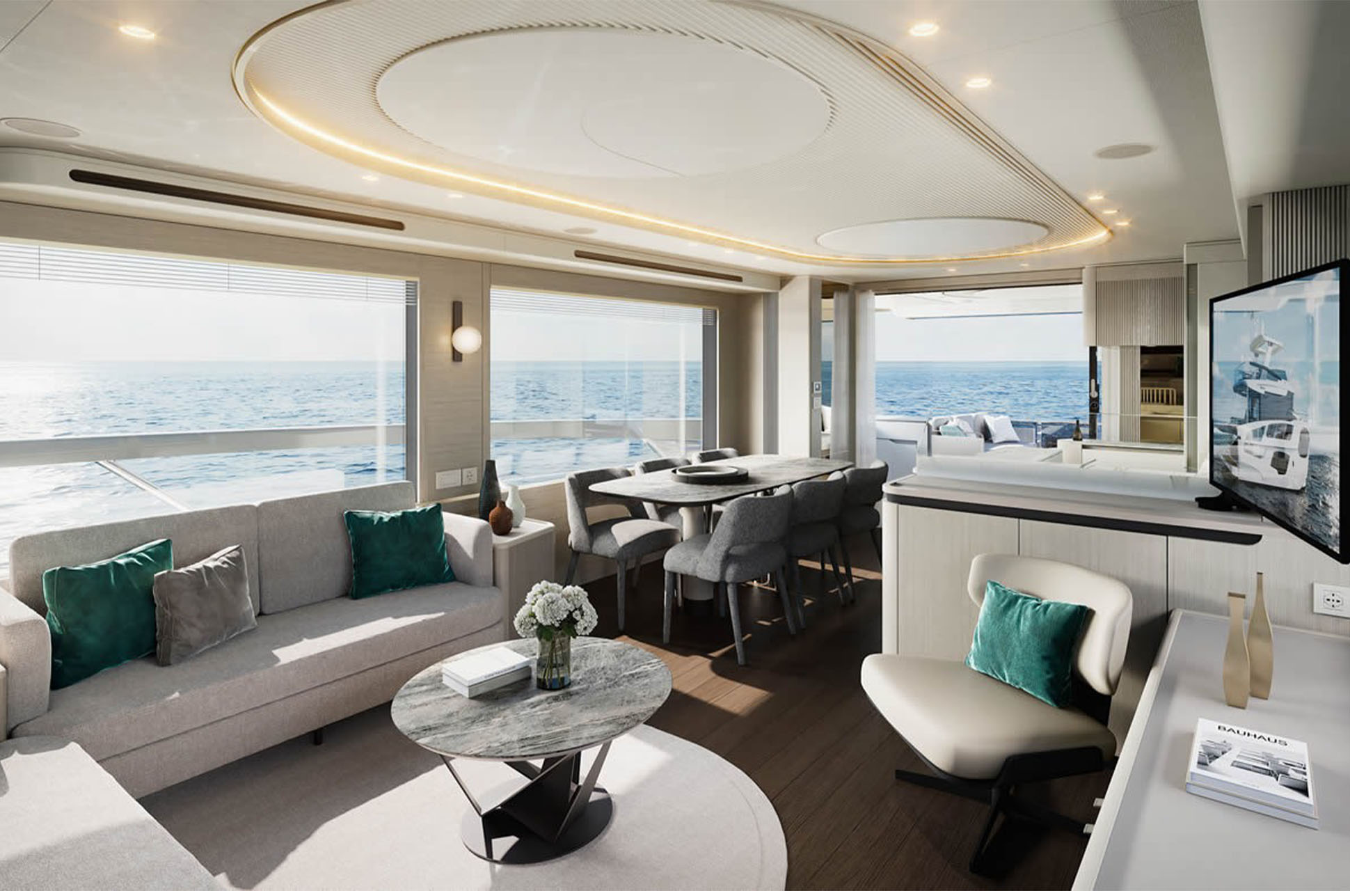 Inside, the Navetta 66 focuses on light and easy movement, with strong headroom, minimal steps, and sliding doors to keep traffic flow simple. The salon includes an electric height-adjustable dining table and a retractable TV designed to preserve the panoramic view, while a low glass partition subtly separates the galley without closing the space off.