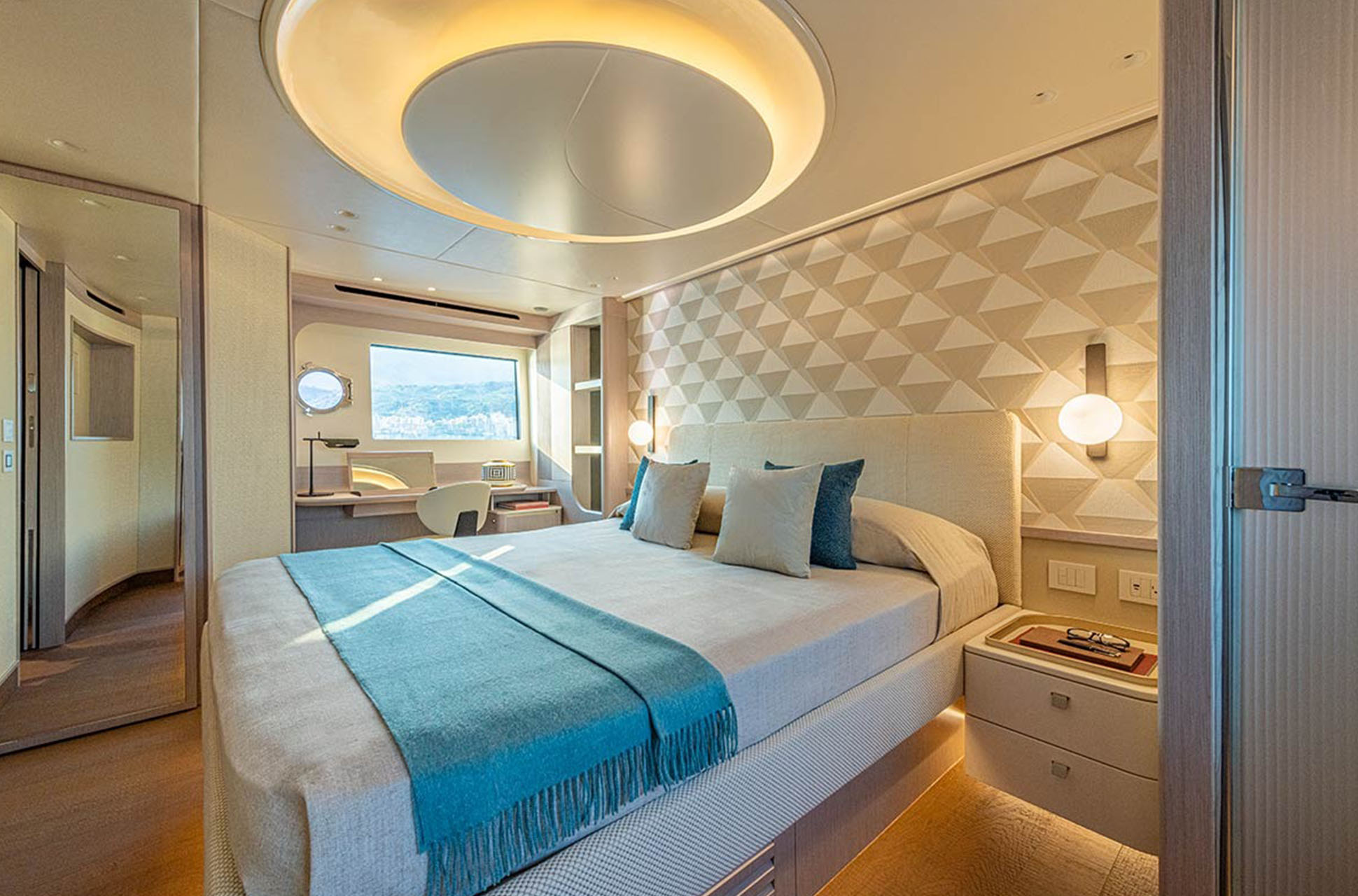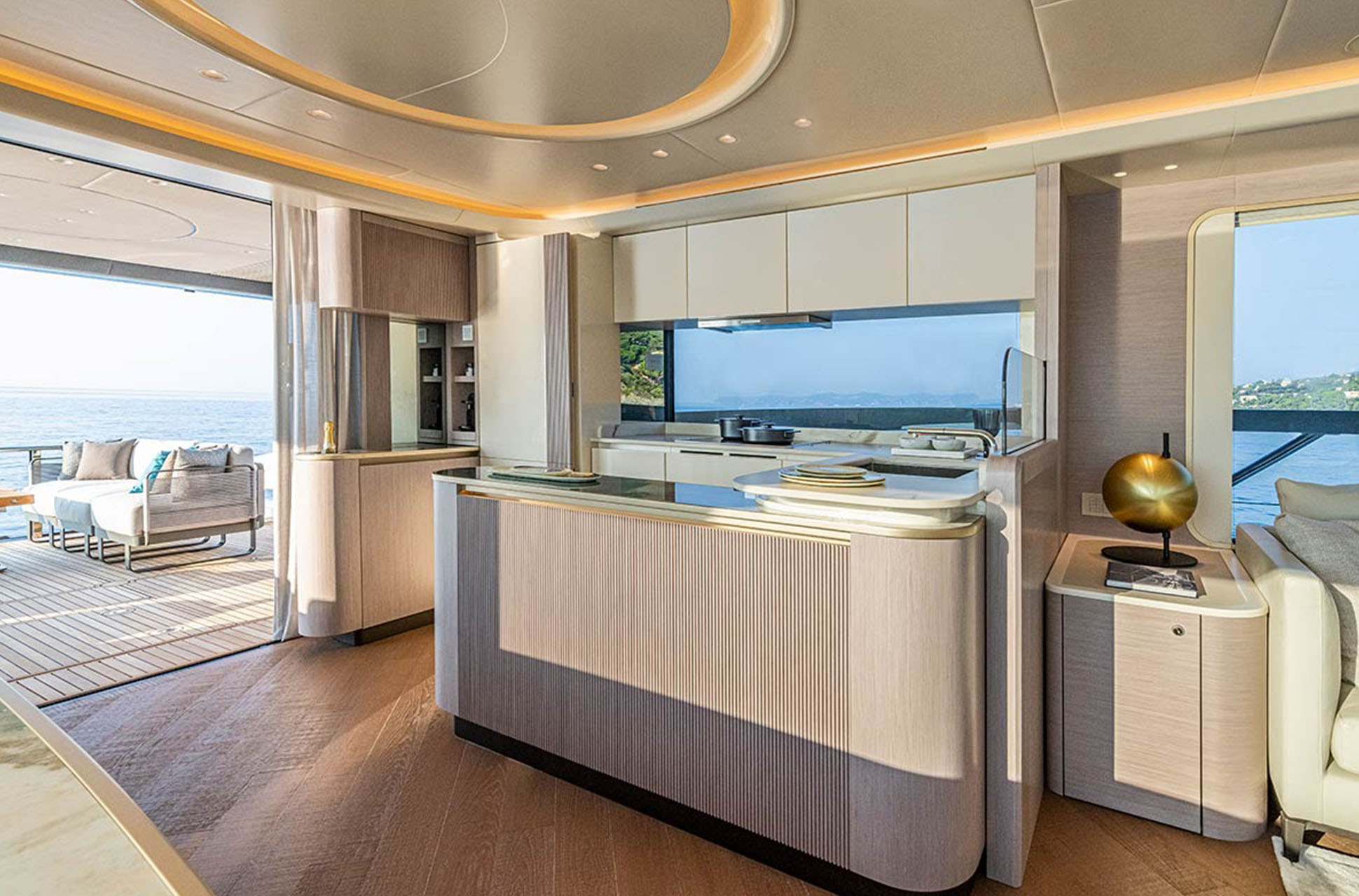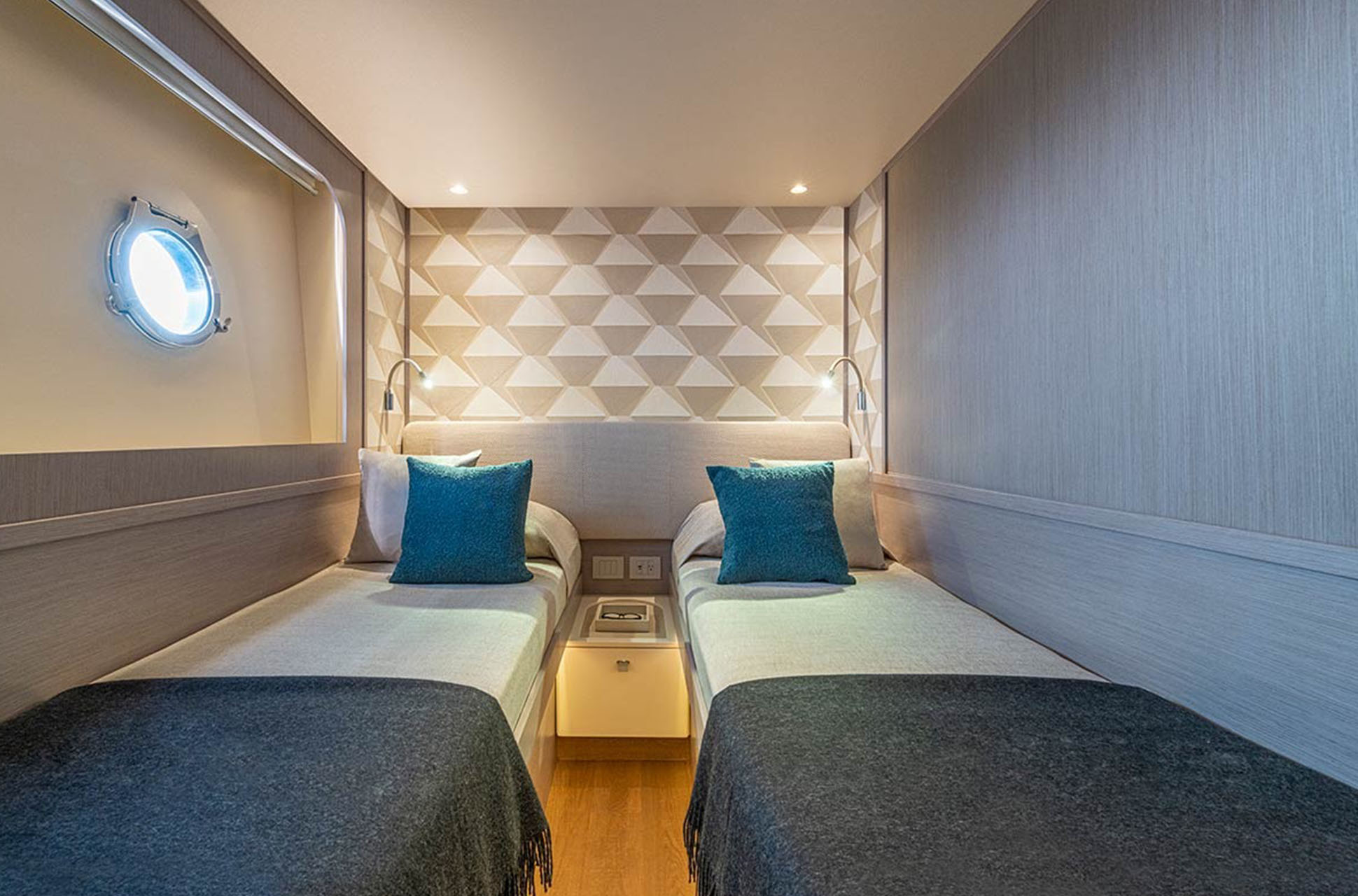 The accommodation plan is built for real cruising with guests. The owner’s stateroom is positioned forward with panoramic windows, there’s a full-beam VIP midship, and two additional guest cabins round out the guest layout. Crew quarters are separated for privacy and are equipped for longer stays, including two beds and a dedicated crew galley area.