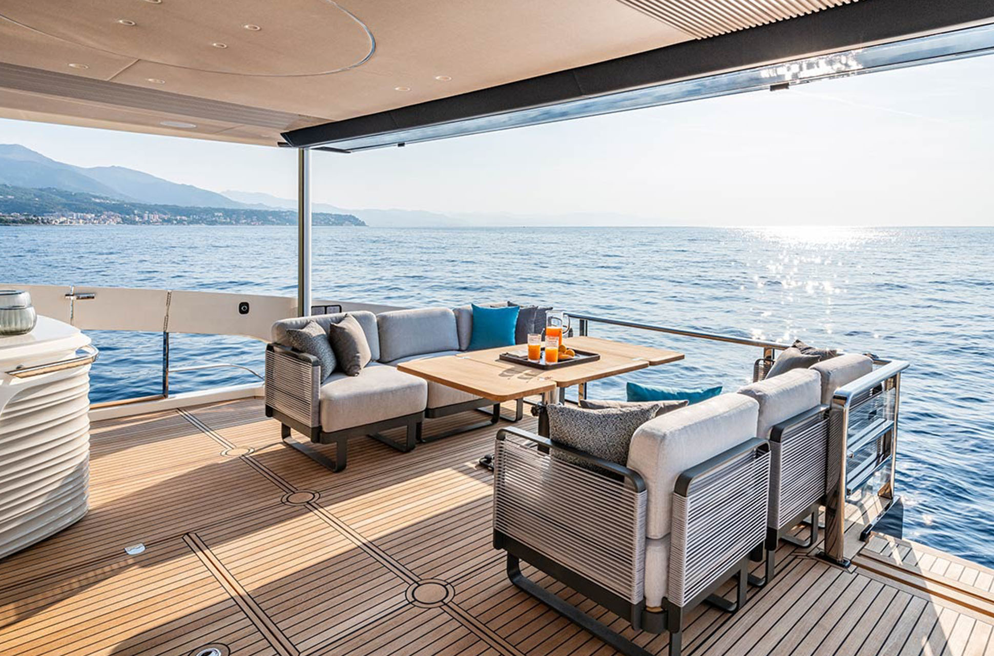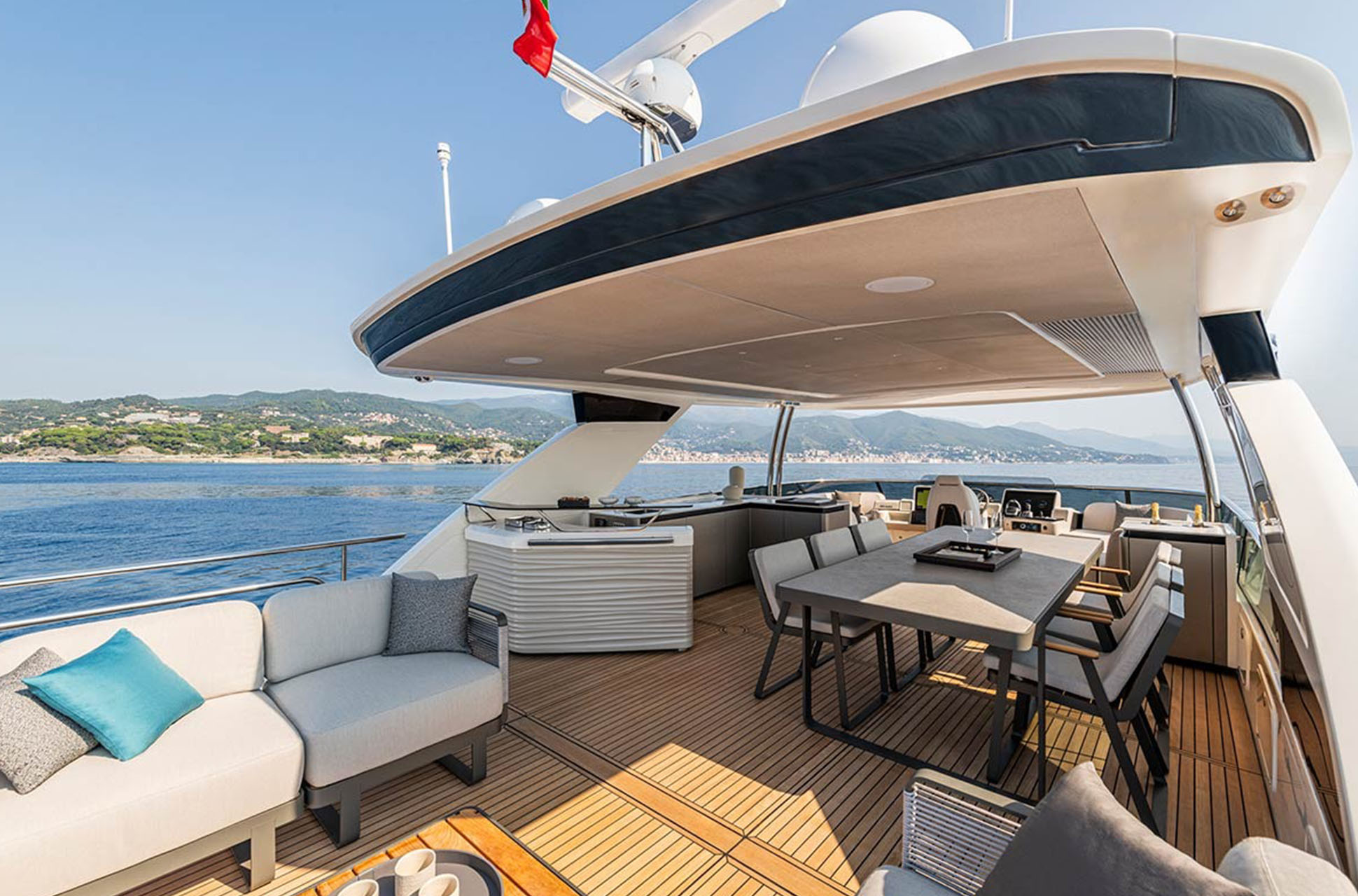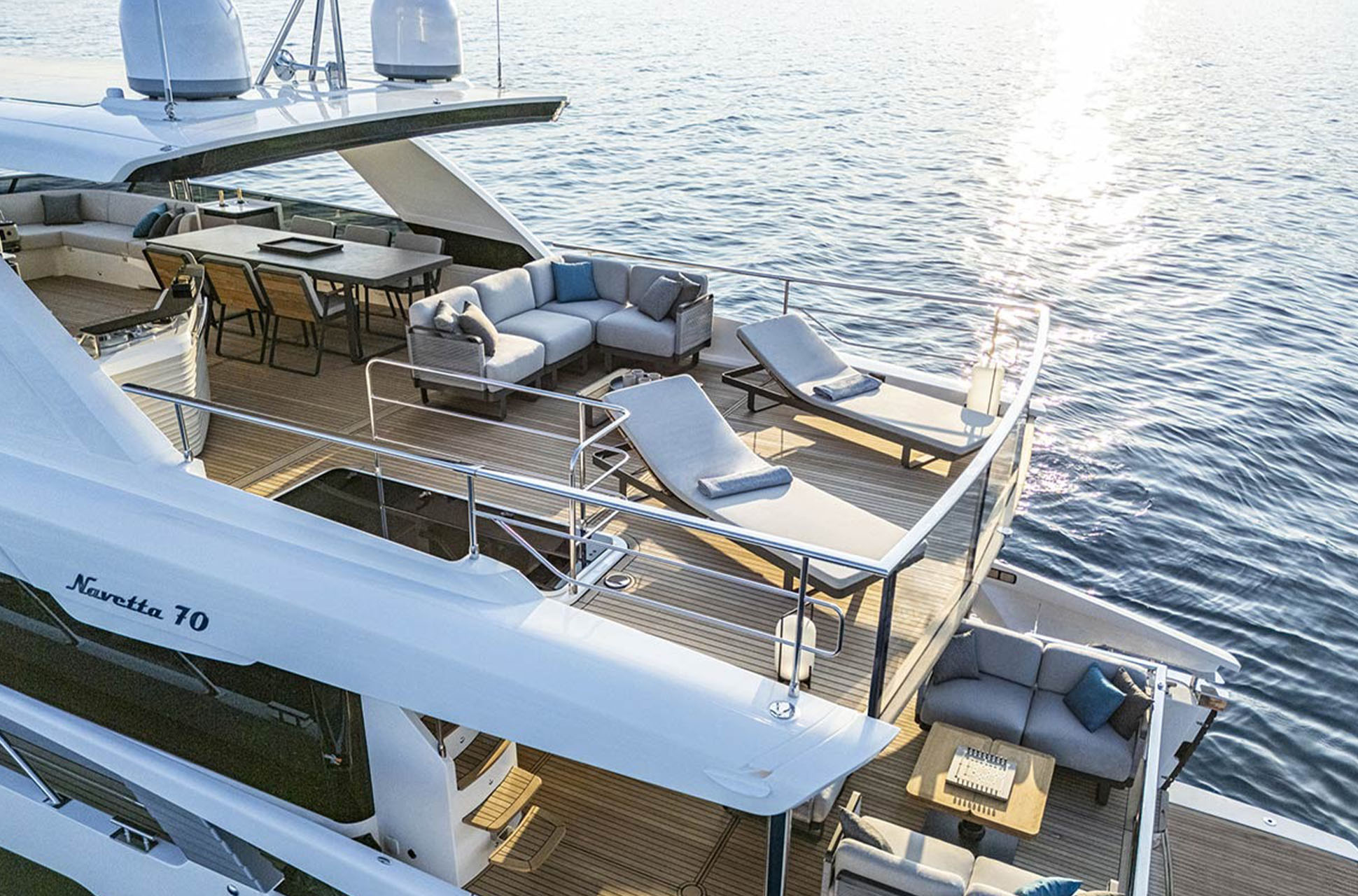 Outside, the Navetta 70 is built around usable social areas. The flybridge is spacious and redesigned to function as a true second living deck, while the main-deck cockpit terrace is set up as a comfortable extension of the salon for meals, lounging, and relaxed afternoons at anchor.