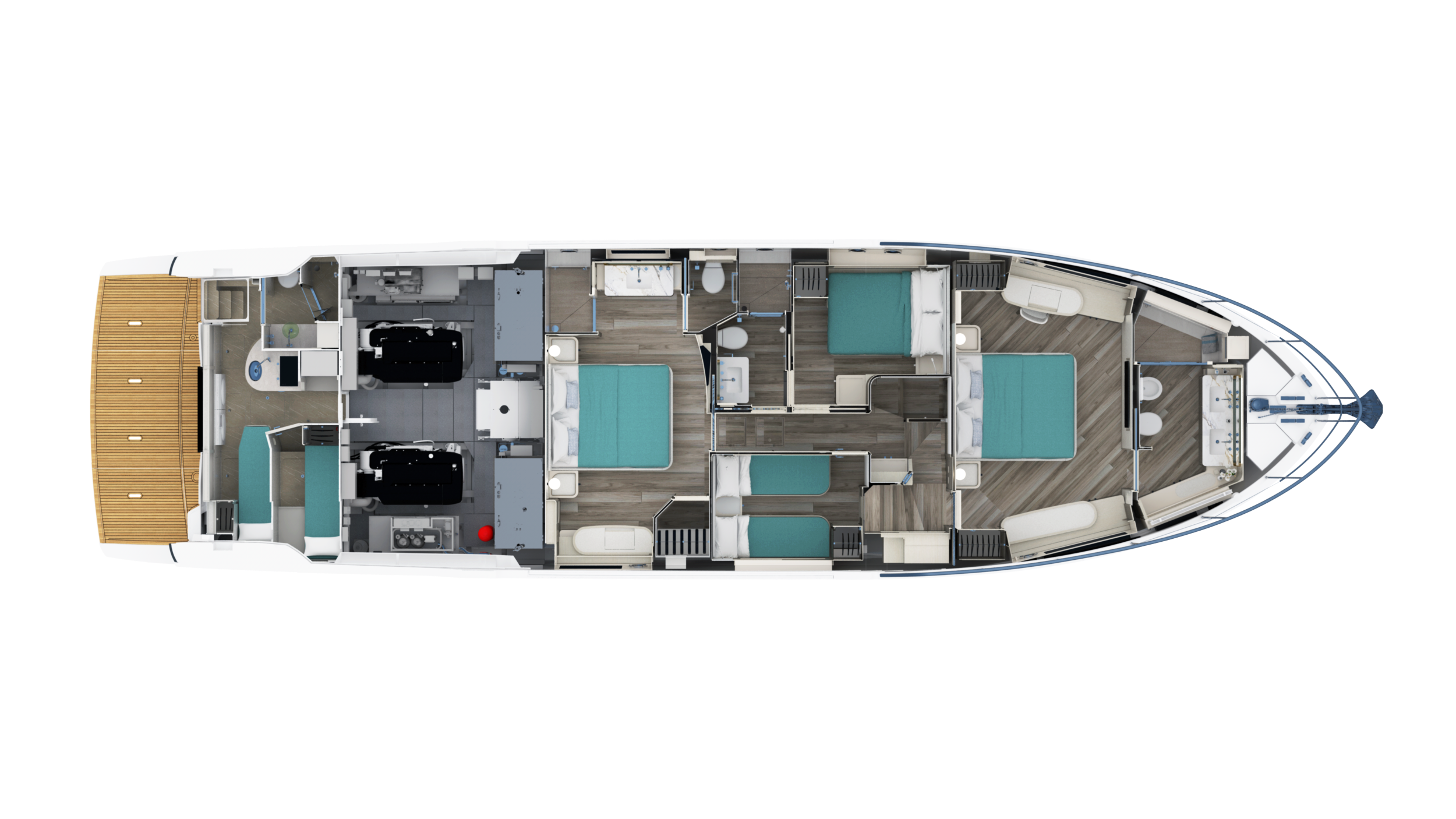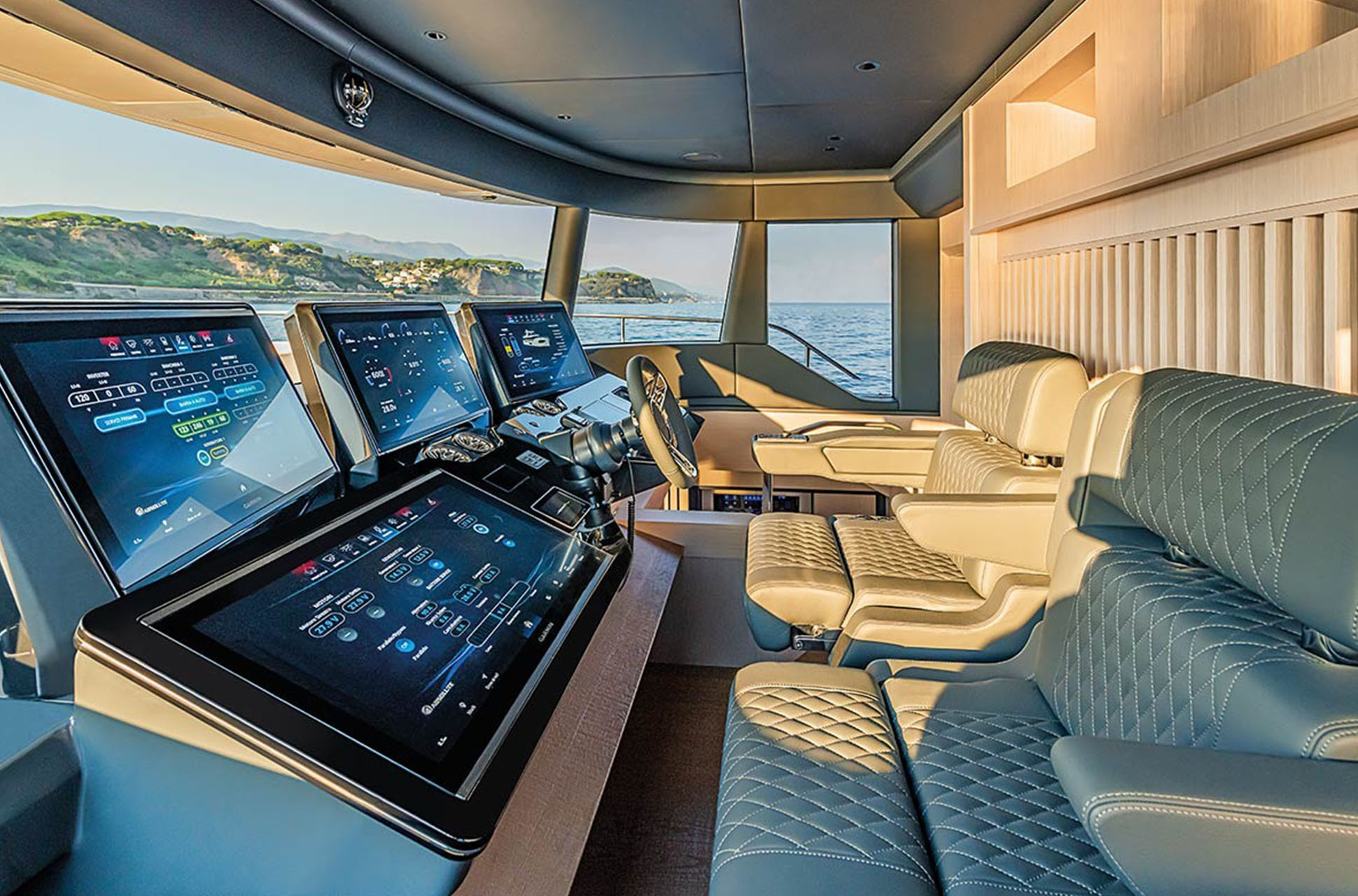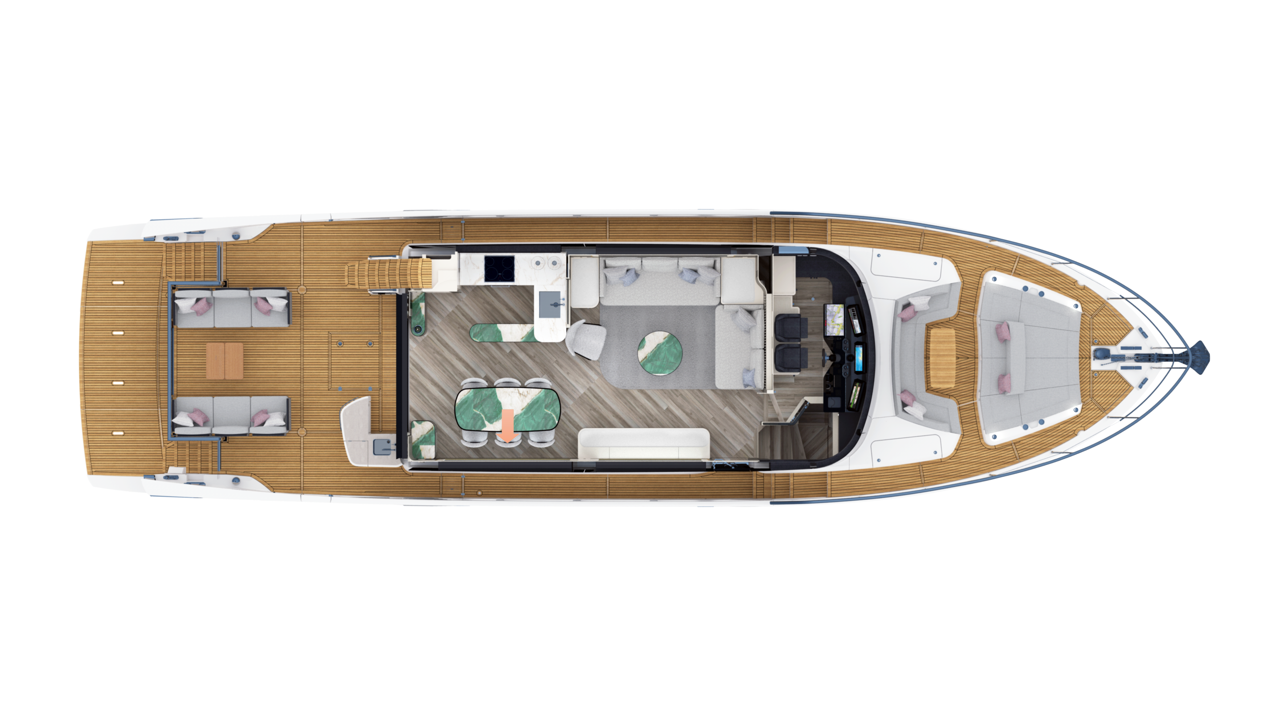 Outside, the Navetta 70 is built around usable social areas. The flybridge is spacious and redesigned to function as a true second living deck, while the main-deck cockpit terrace is set up as a comfortable extension of the salon for meals, lounging, and relaxed afternoons at anchor.