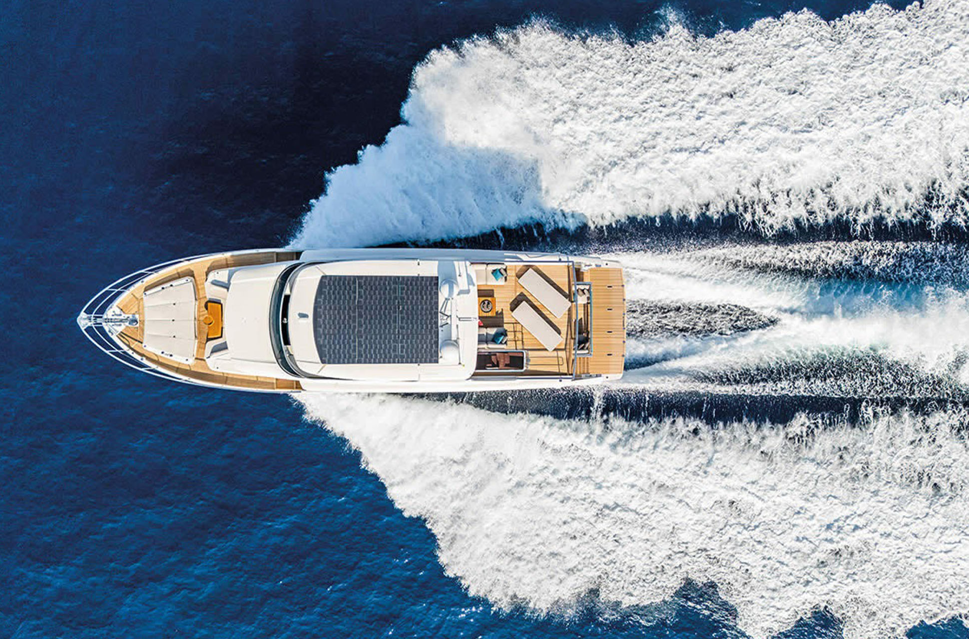 Absolute also builds in a practical sustainability angle: solar panels integrated into the flybridge roof help support essential onboard functions both underway and at anchor, reducing reliance on the generator for day-to-day loads when conditions allow.