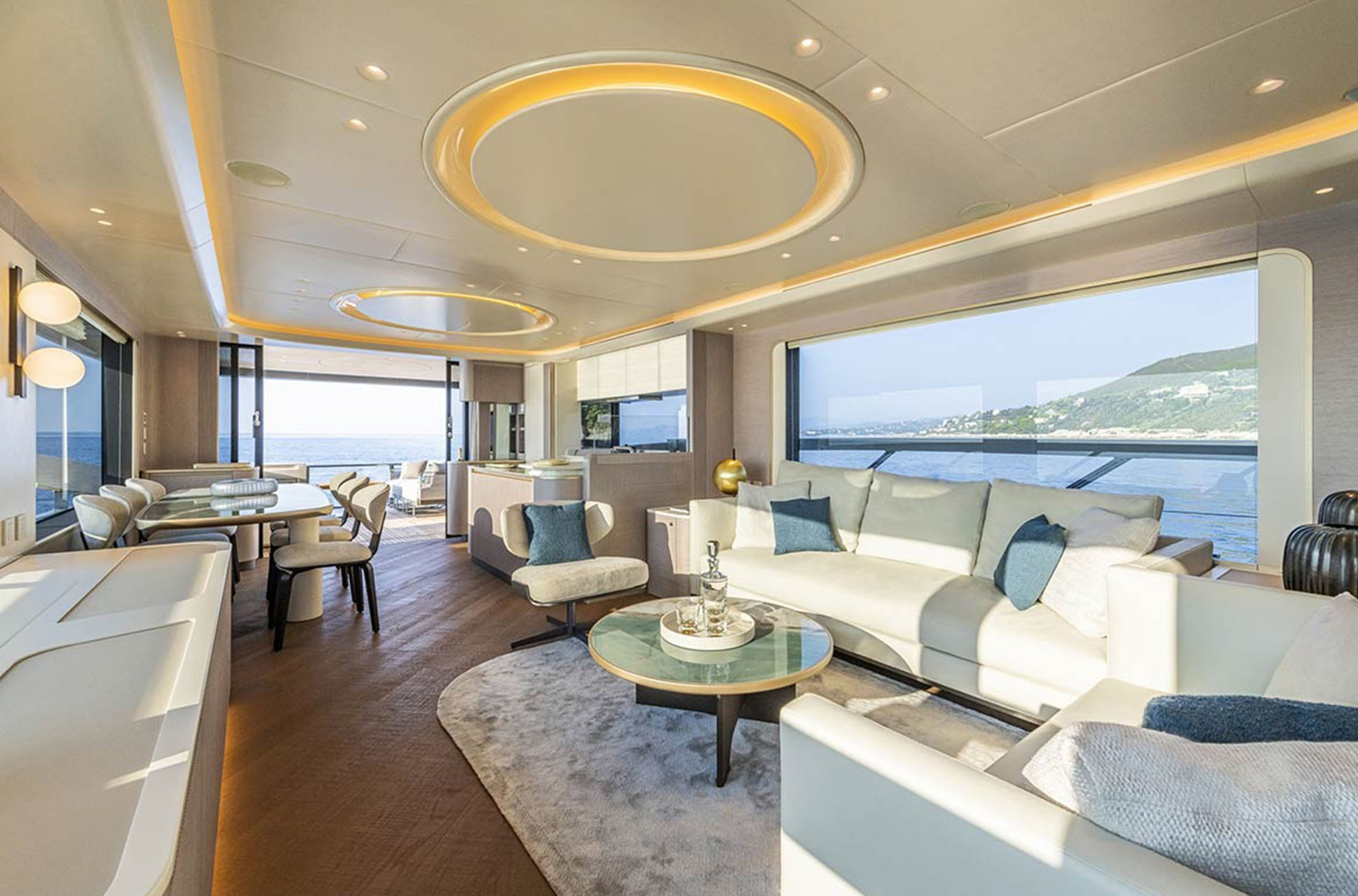 Inside, the design focuses on constant connection to the water. Oversize glazing and lower-profile exterior lines keep sightlines open from the salon, and the furniture and lighting details are intentionally rounded and contemporary to create a calm, continuous feel instead of a segmented, formal interior.