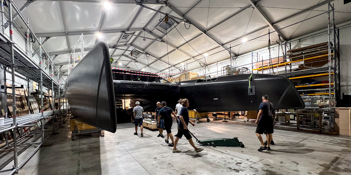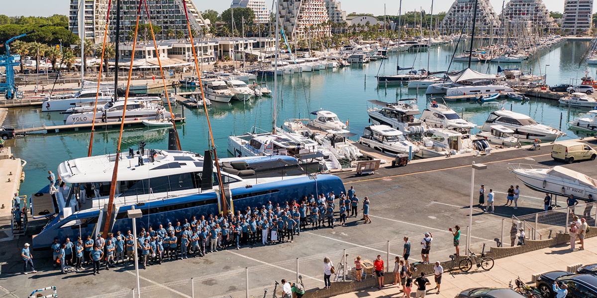 The shipyard is located in La Grande-Motte in southern France. Its facilities include a 38,736-square-foot (3,600 m²) assembly hall equipped for carbon fiber infusion of hulls and decks, with structural composite panels and interior components produced in partnership with specialized suppliers including Fibre Mechanics in the UK.