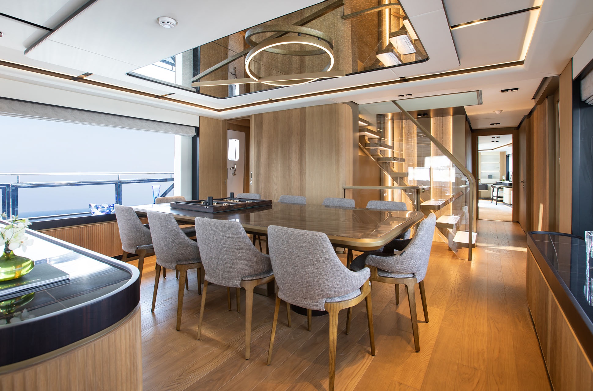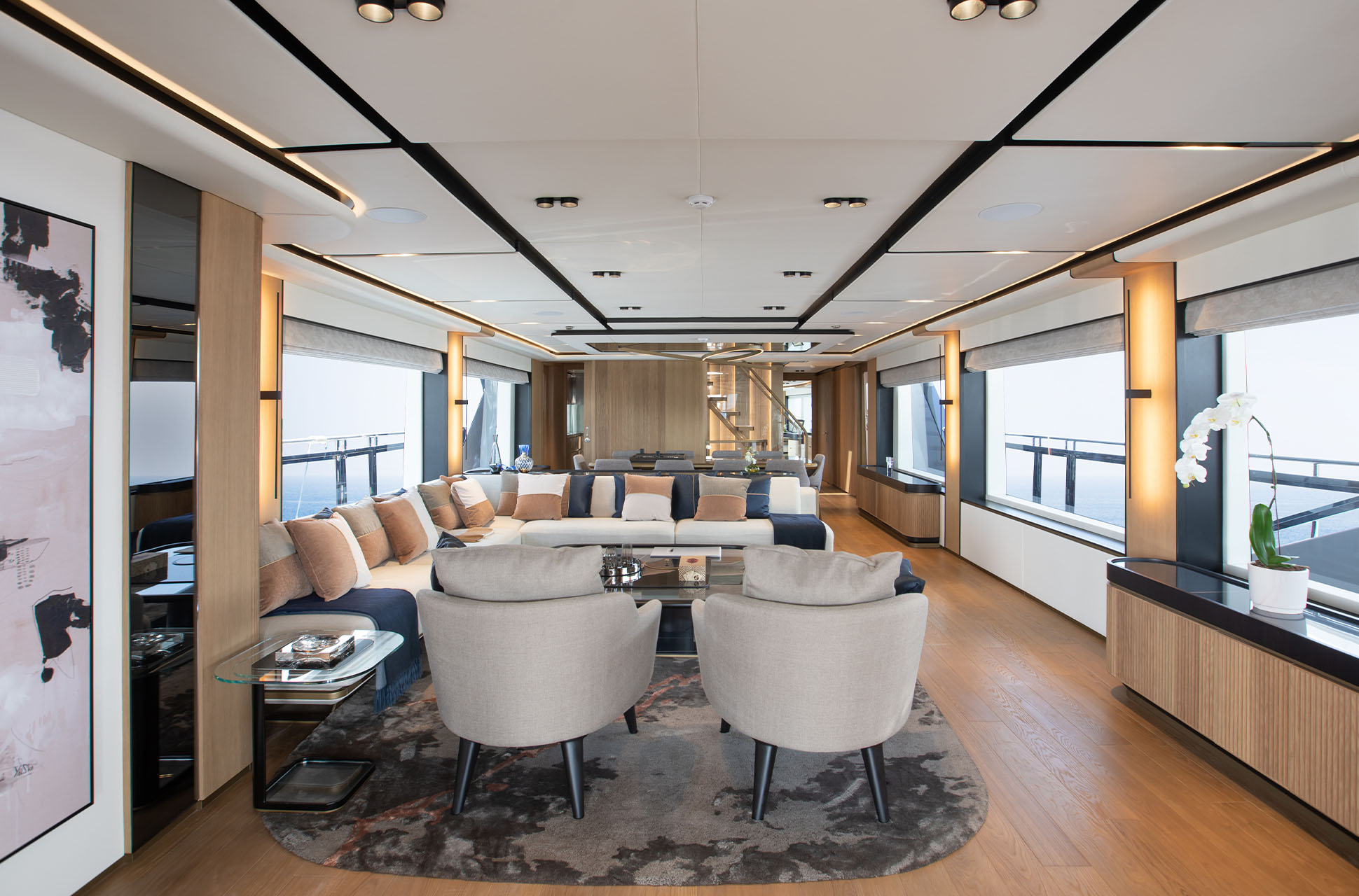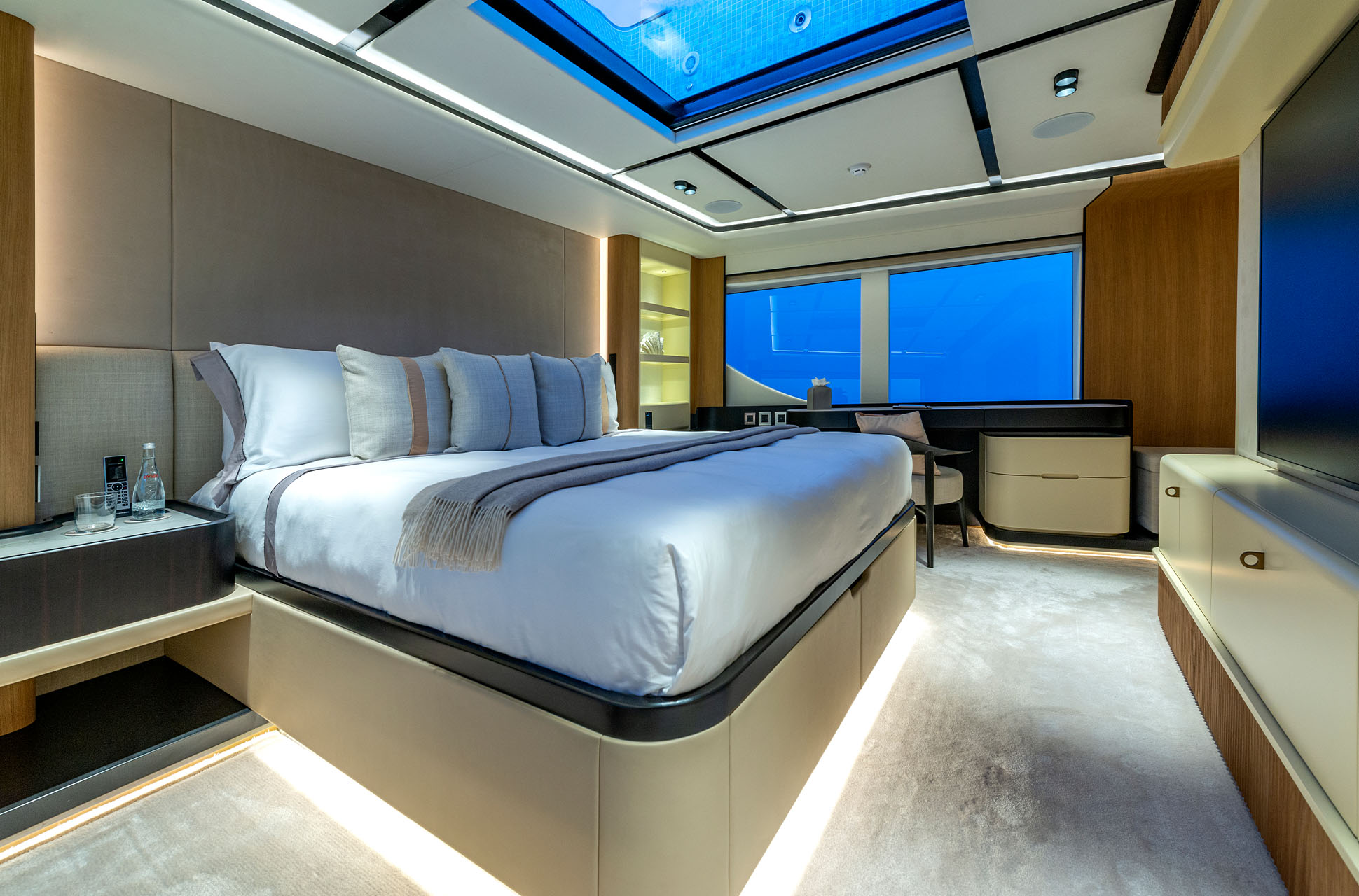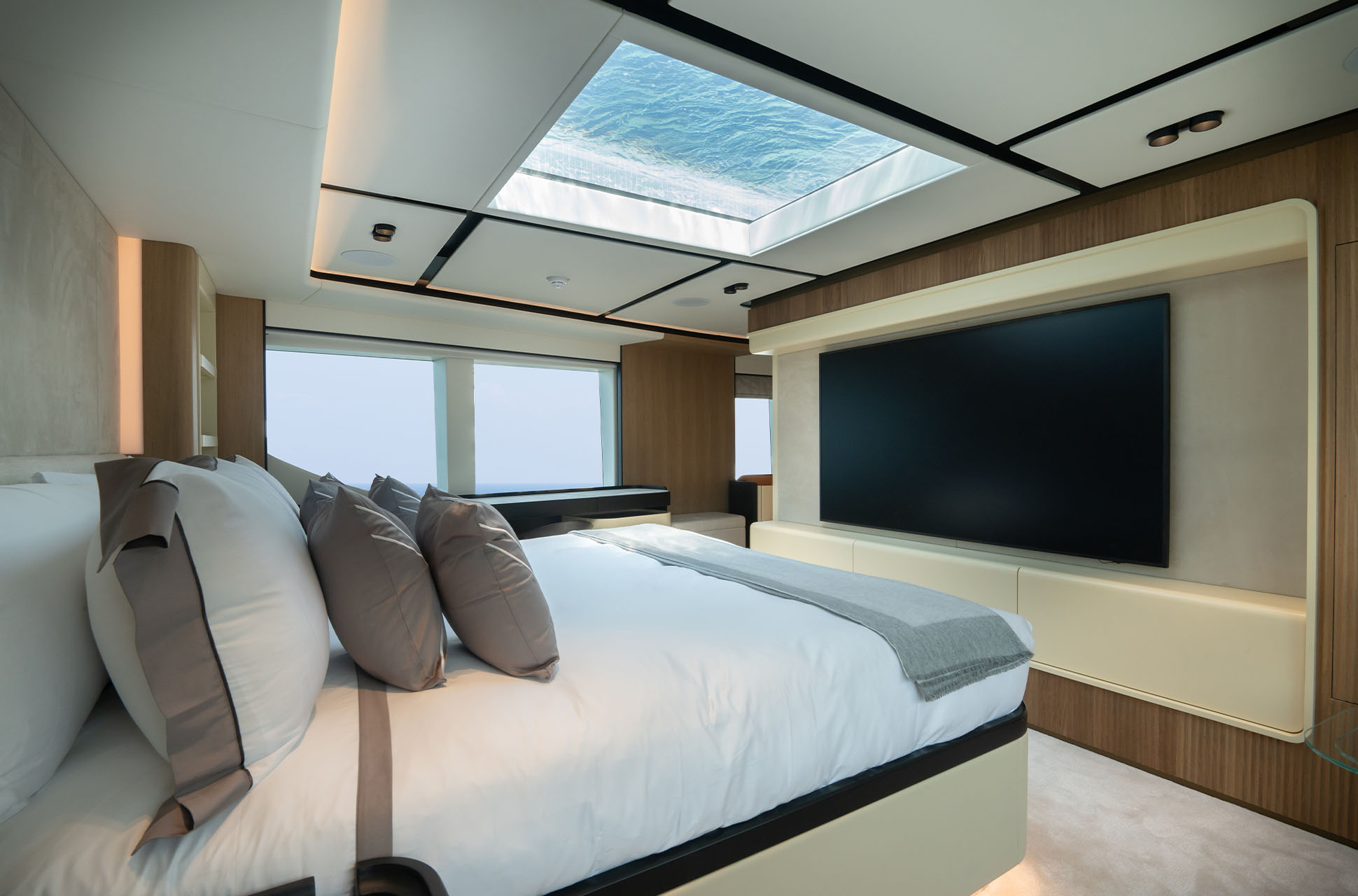 Floor-to-ceiling windows create 270-degree panoramic views, flooding interiors with light and a fresh, open feel. The foredeck plunge pool, expansive decks, and generous storage for water toys make the Majesty 111 ideal for both adventure and relaxation.