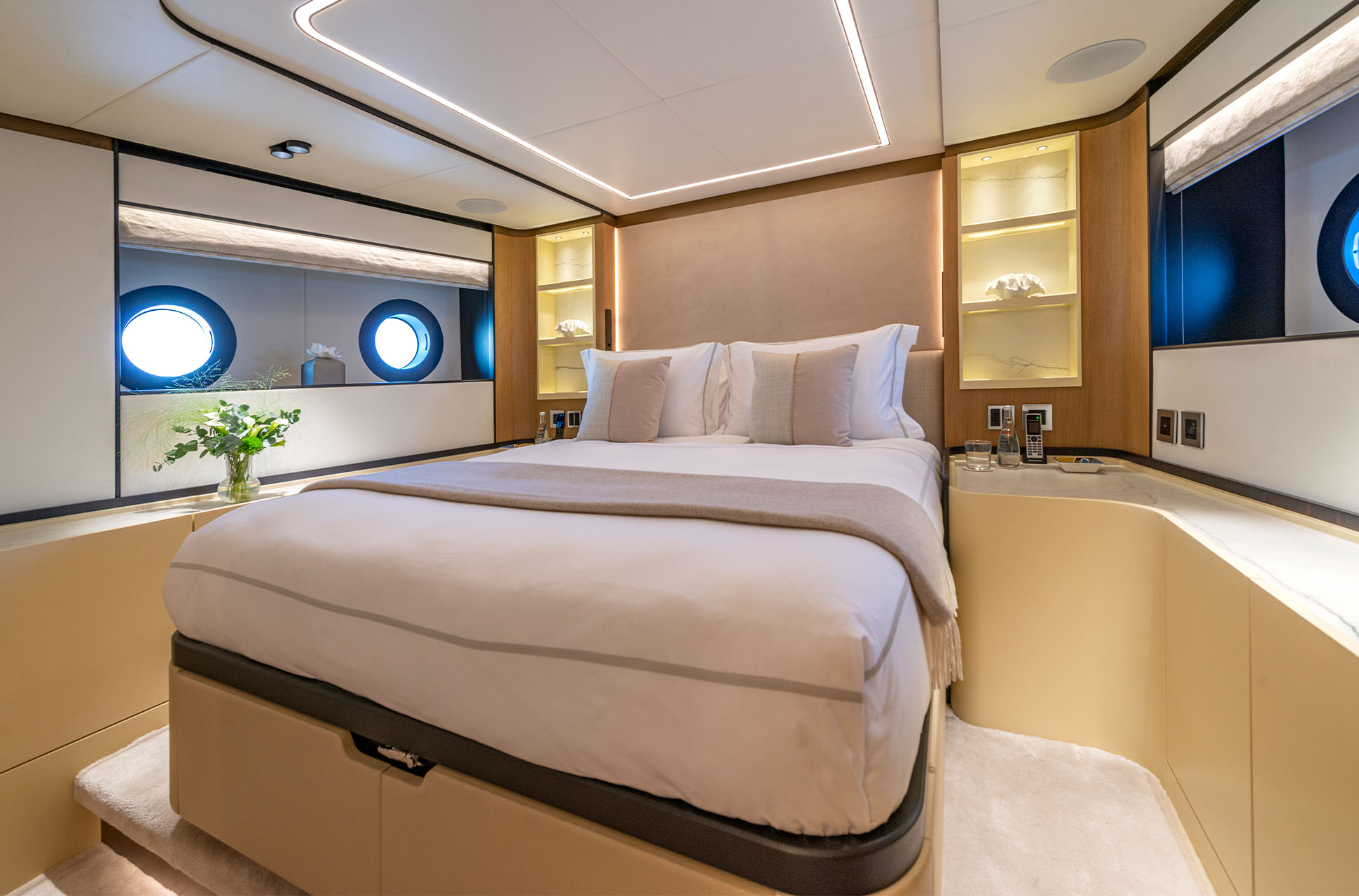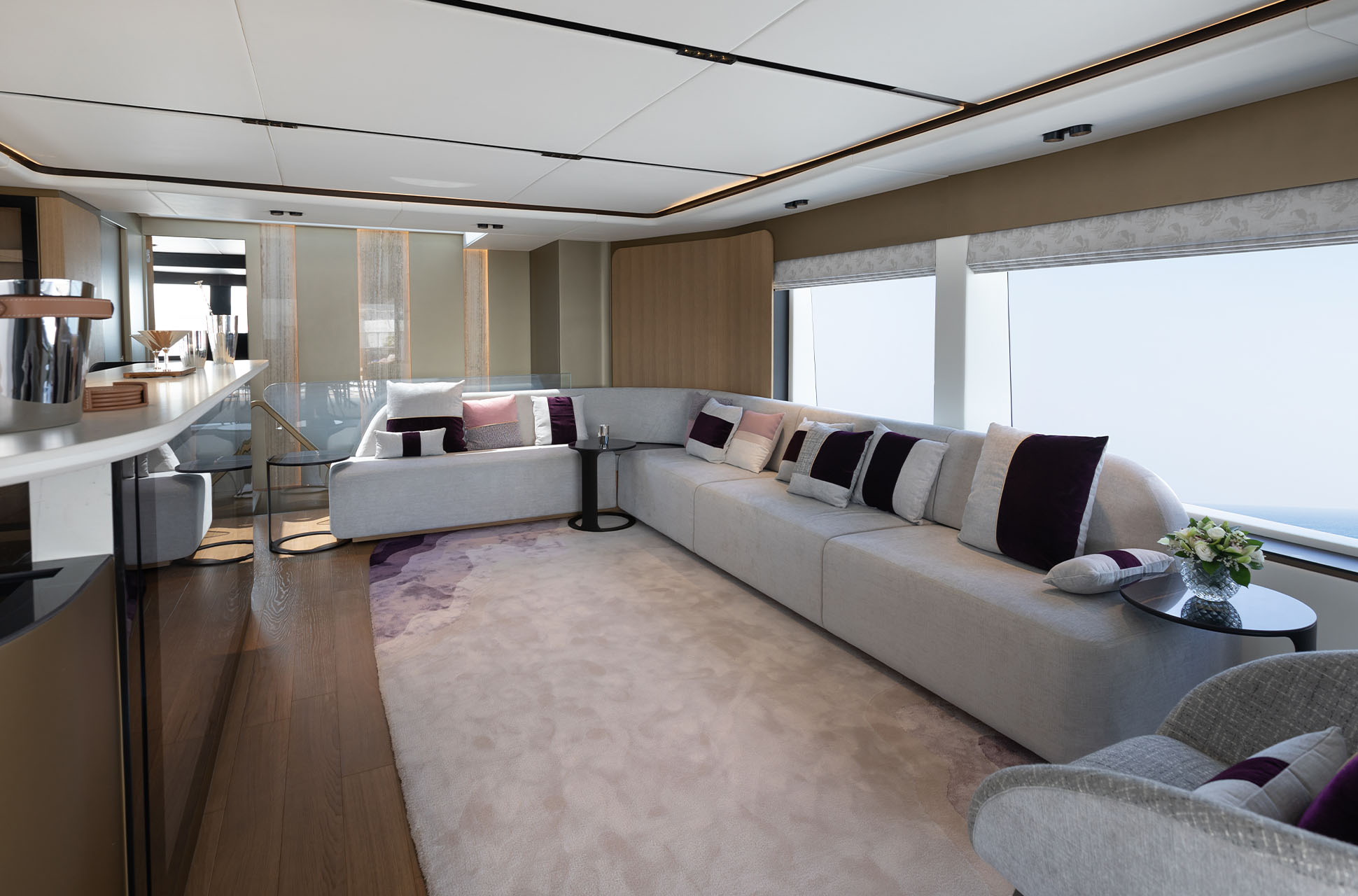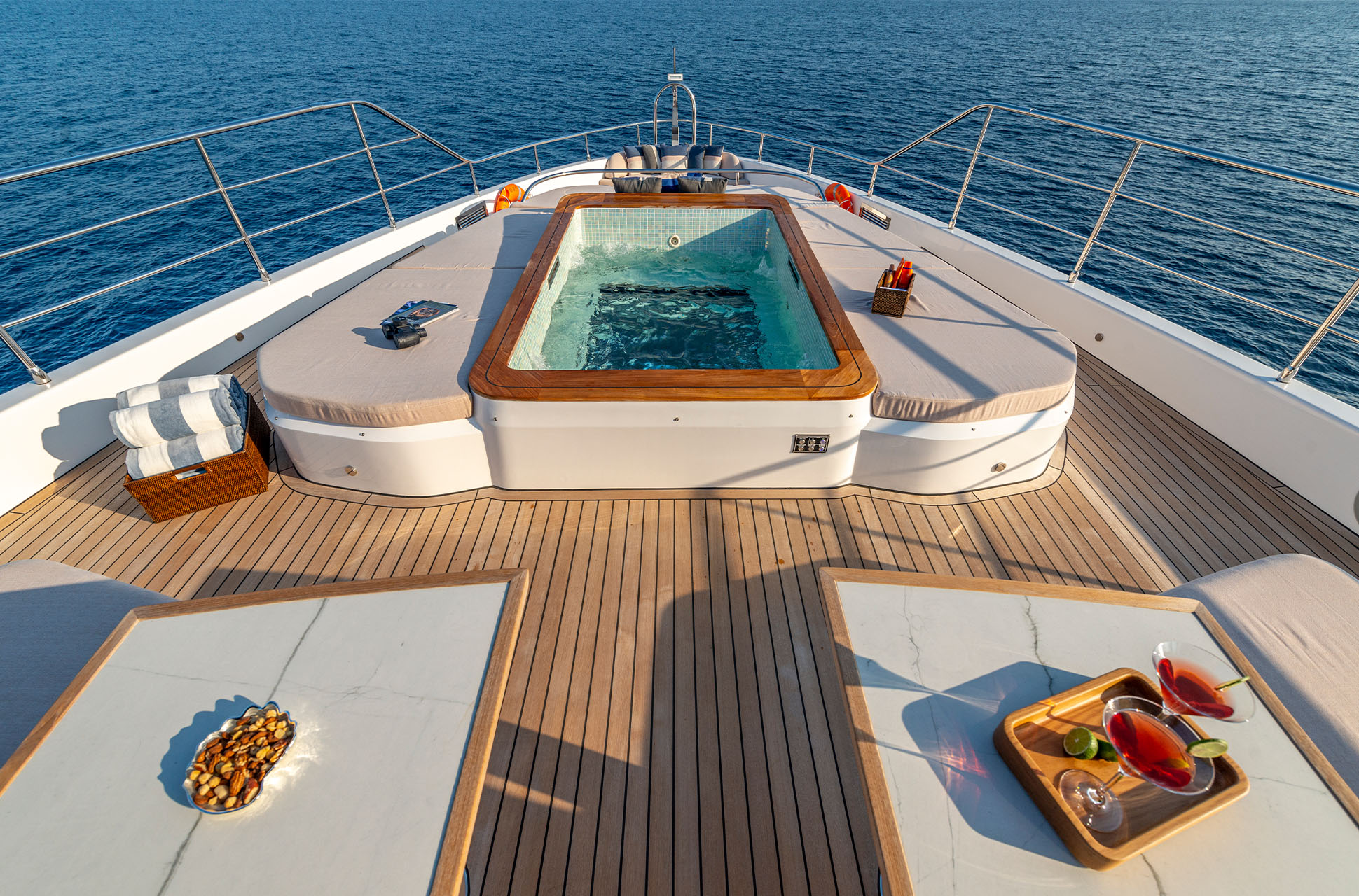 Floor-to-ceiling windows create 270-degree panoramic views, flooding interiors with light and a fresh, open feel. The foredeck plunge pool, expansive decks, and generous storage for water toys make the Majesty 111 ideal for both adventure and relaxation.
