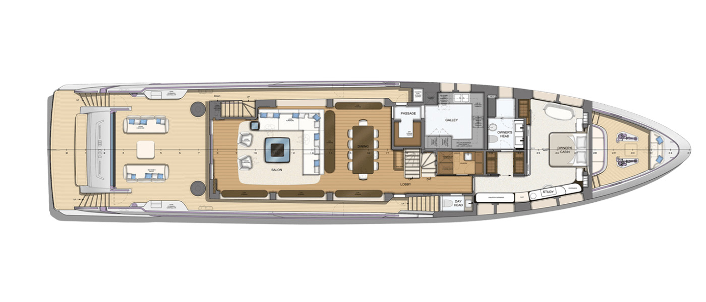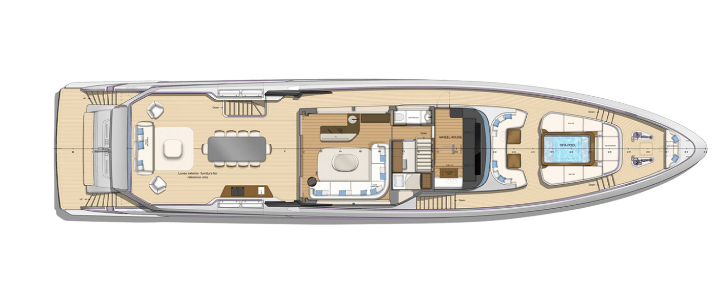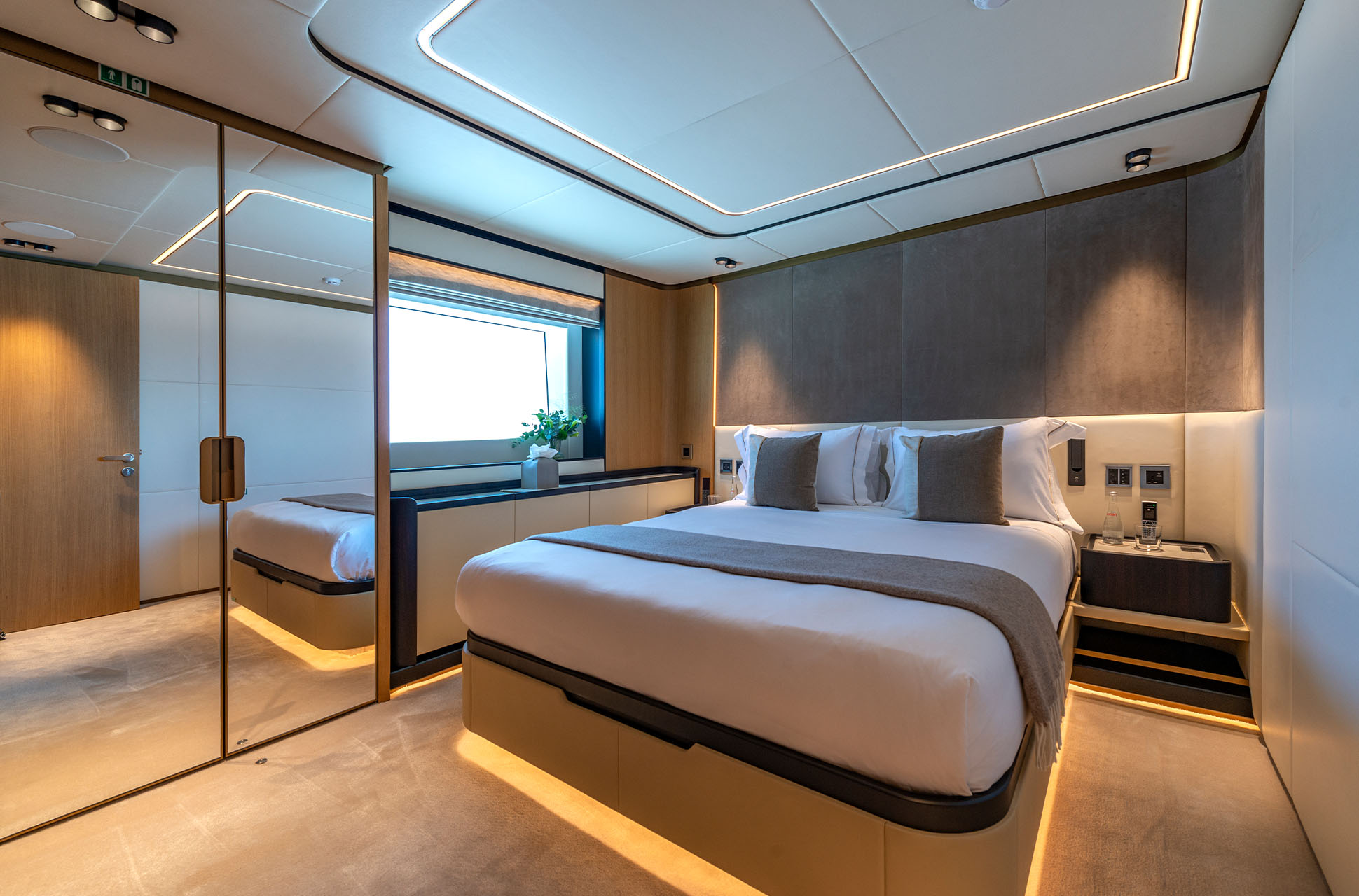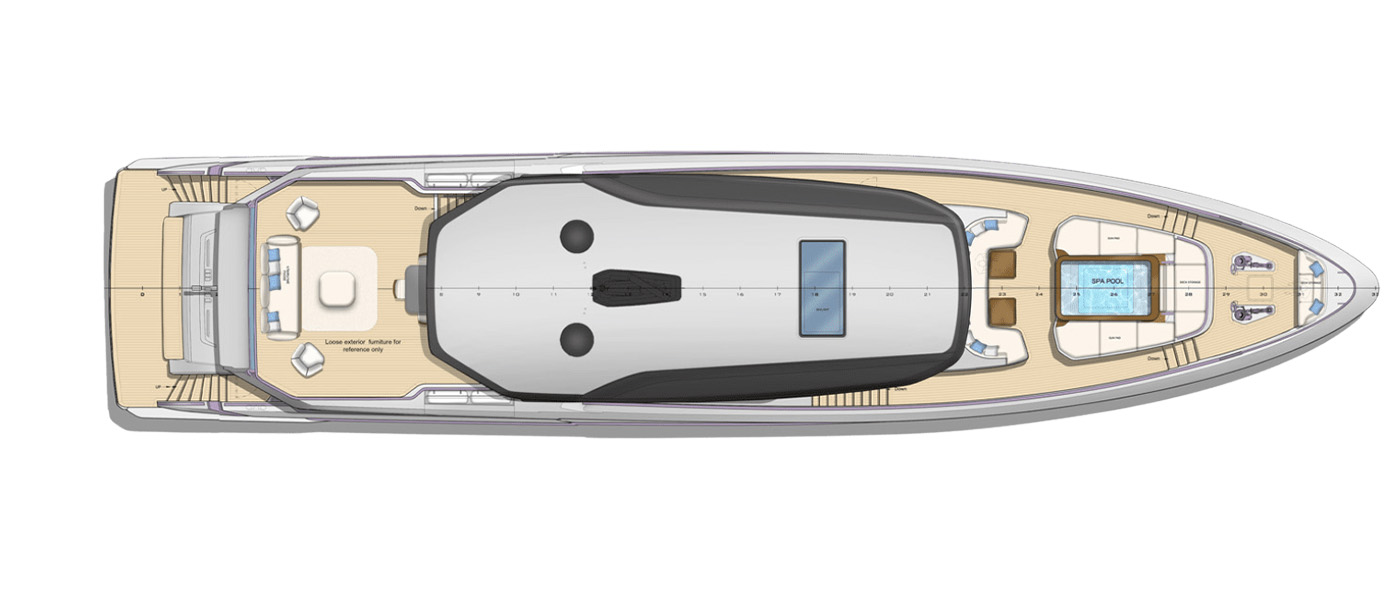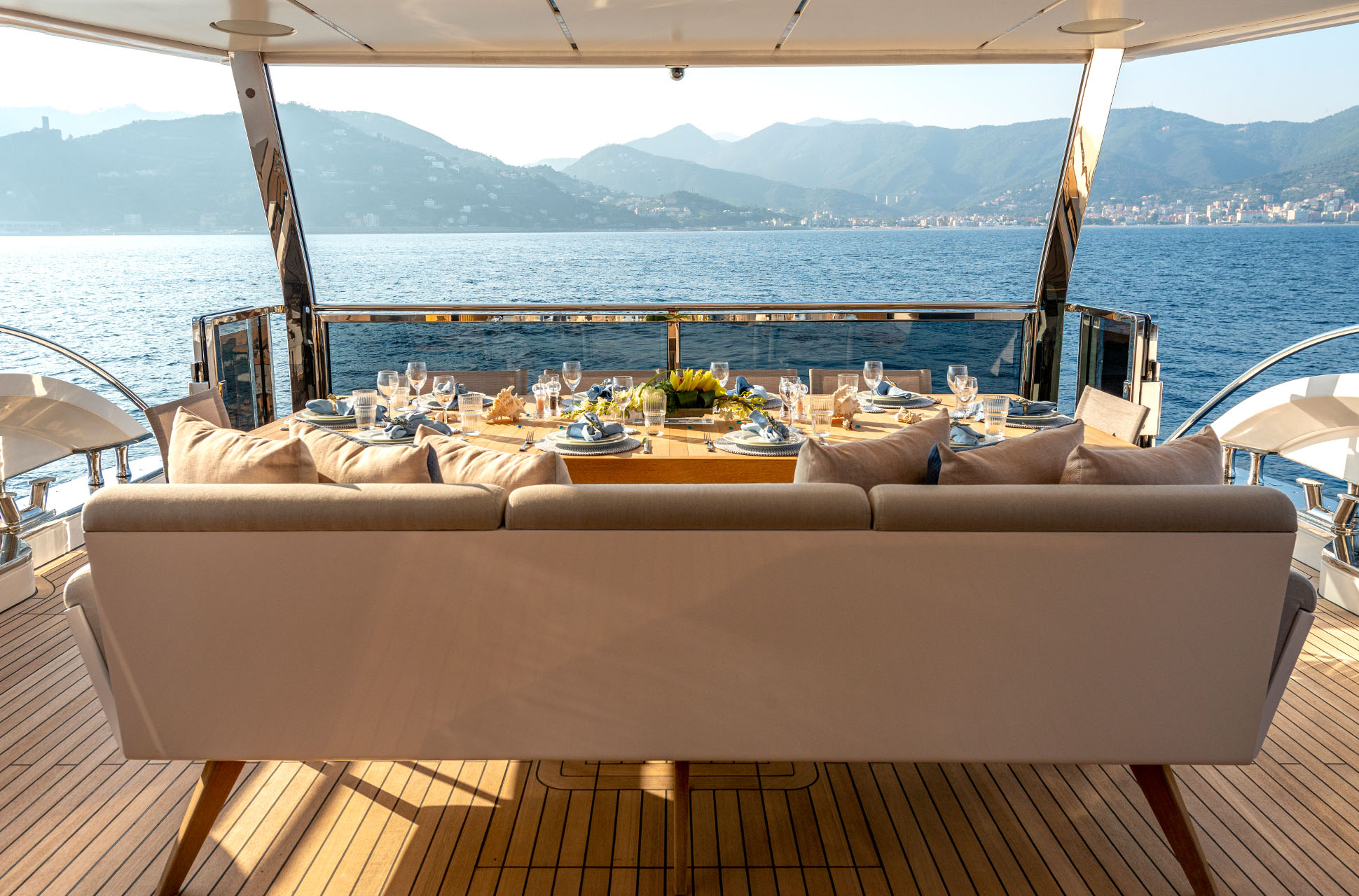 Floor-to-ceiling windows create 270-degree panoramic views, flooding interiors with light and a fresh, open feel. The foredeck plunge pool, expansive decks, and generous storage for water toys make the Majesty 111 ideal for both adventure and relaxation.