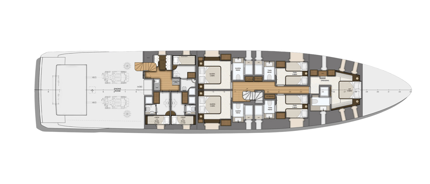 The Majesty 111 is a tri-deck superyacht that redefines modern luxury with bold design, advanced technology, and Gulf Craft’s signature craftsmanship. Featuring a 6-cabin layout including a cathedral-like forward VIP suite, this yacht emphasizes space, natural light, and seamless indoor-outdoor living.