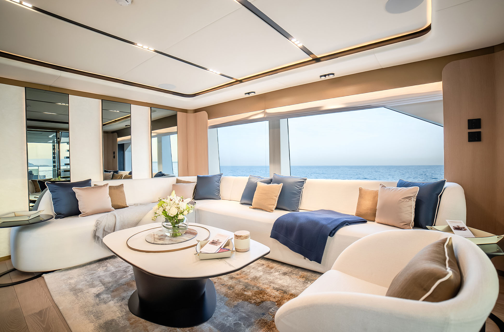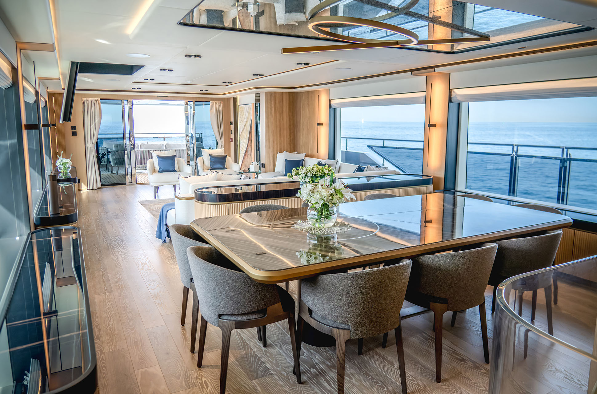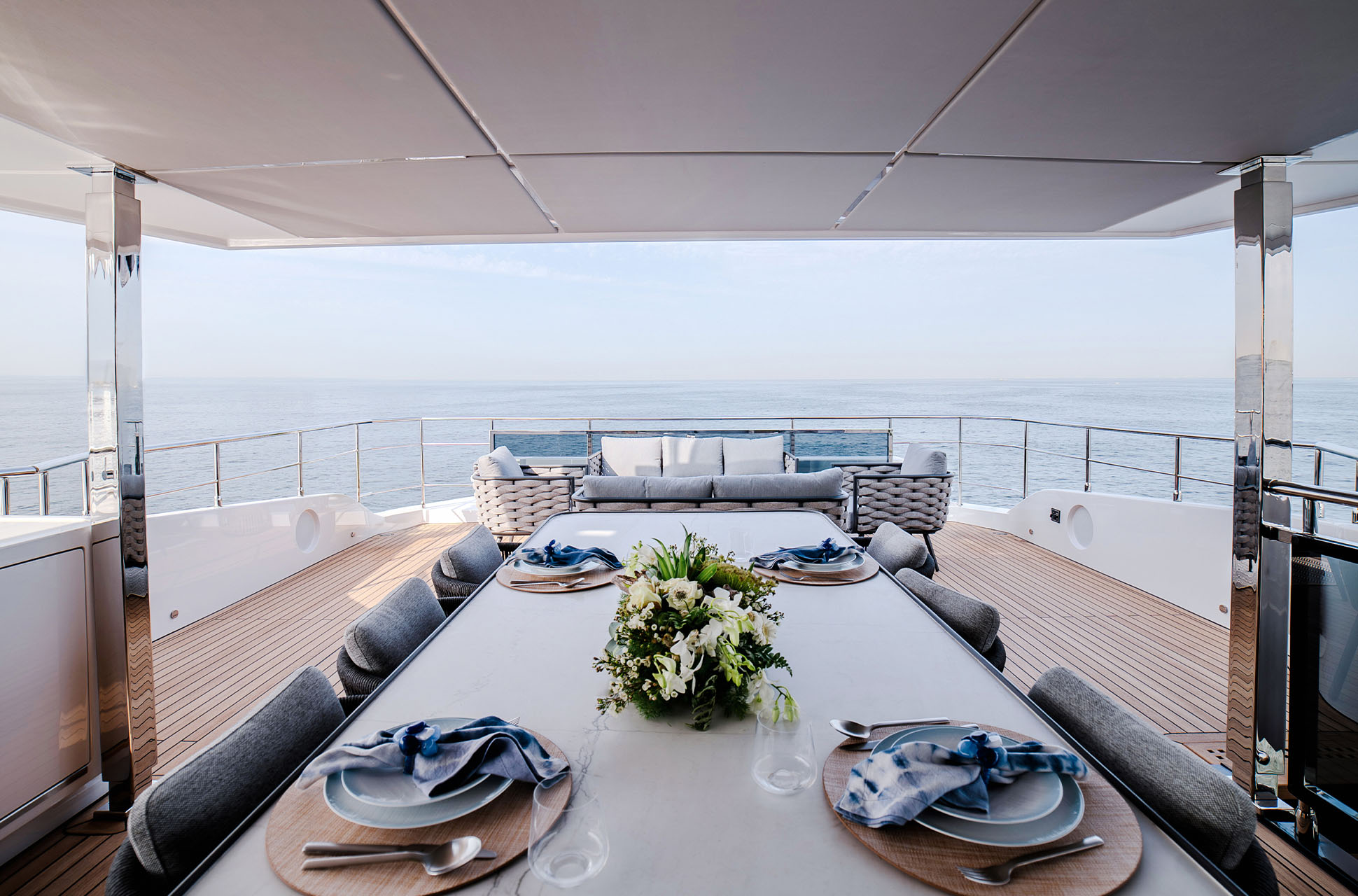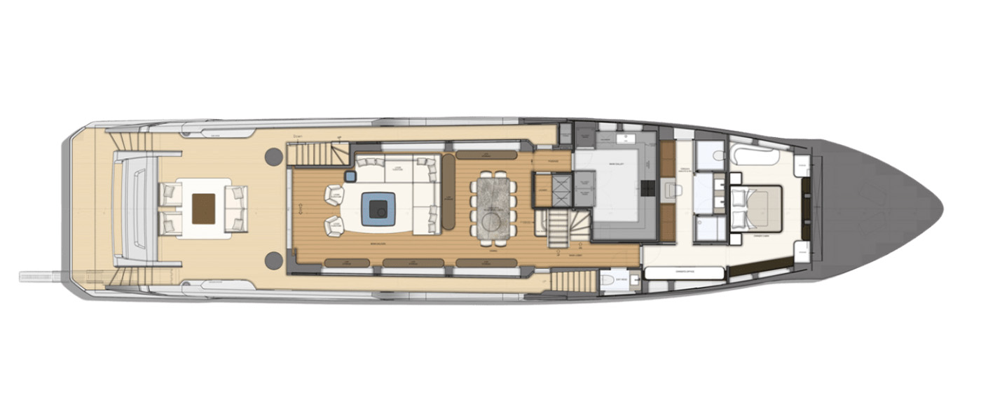 Designed to host up to 12 guests and 6 crew, the Majesty 112 Terrace offers multiple alfresco dining and lounging areas, along with a spacious salon flooded with natural light. Every detail, from curated materials to refined finishes, enhances comfort and style.