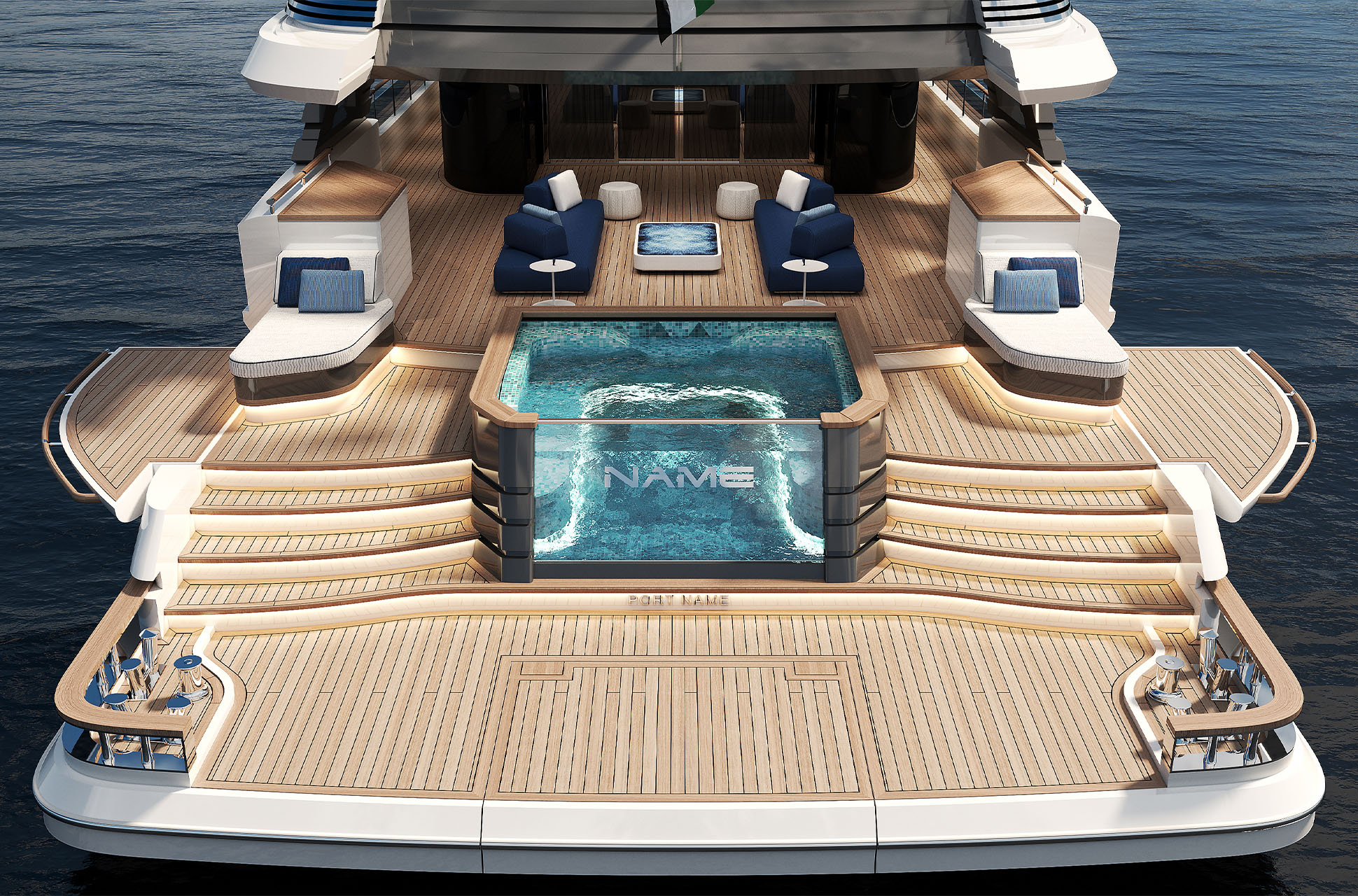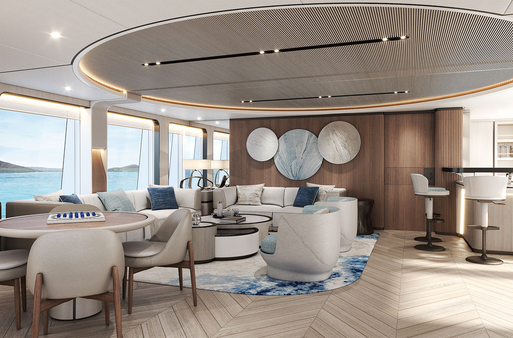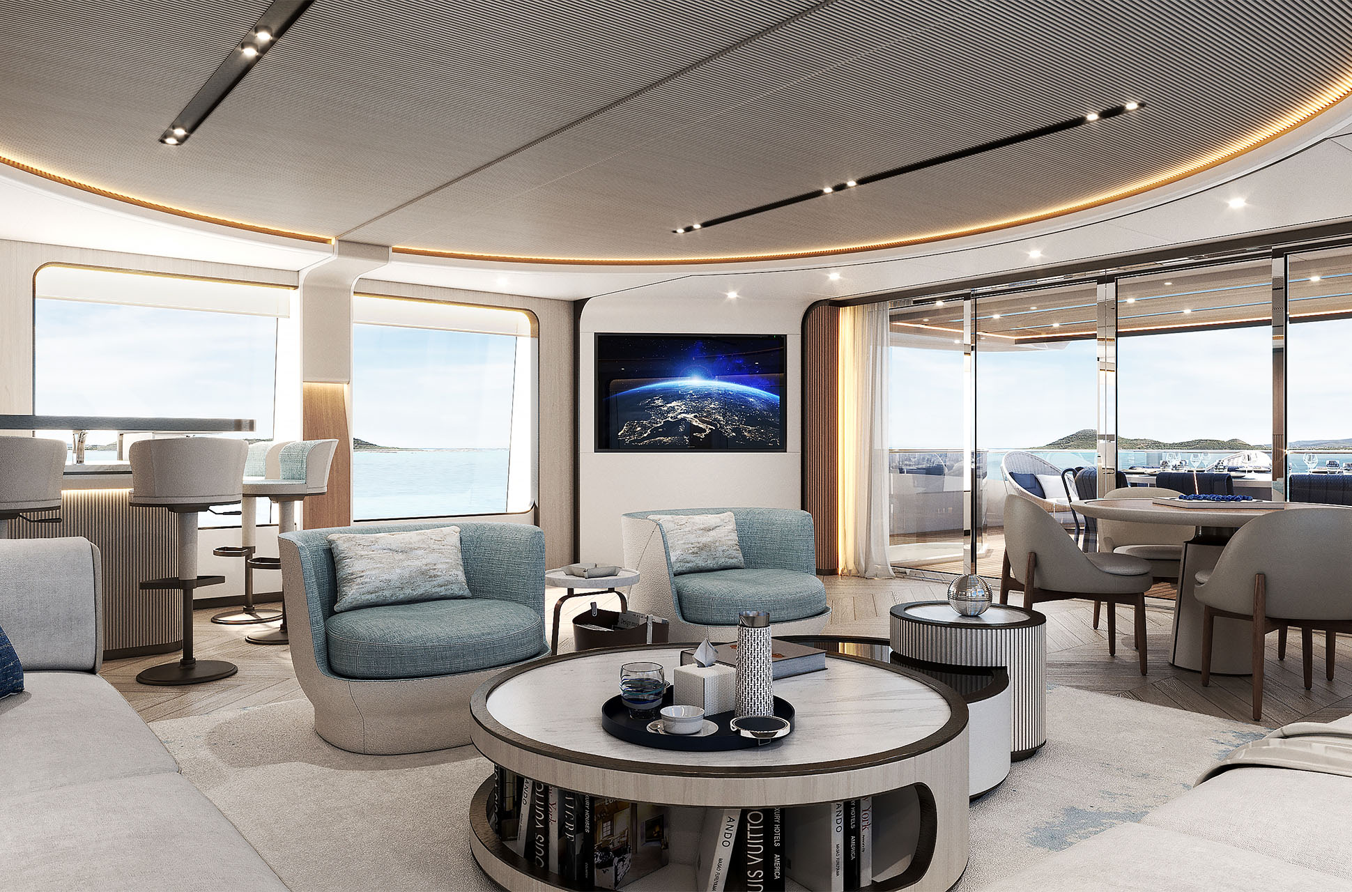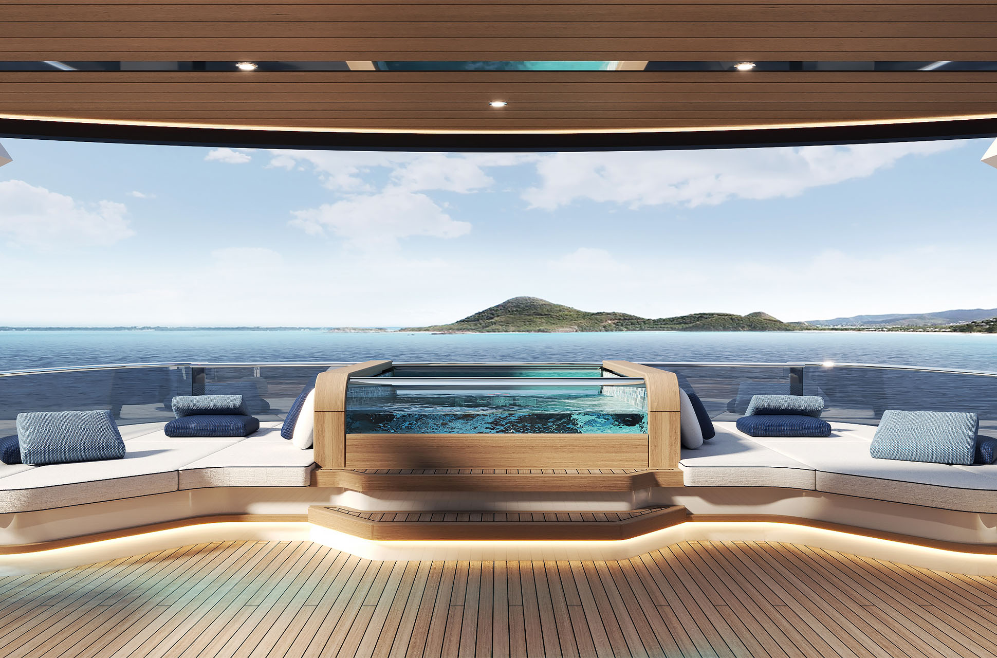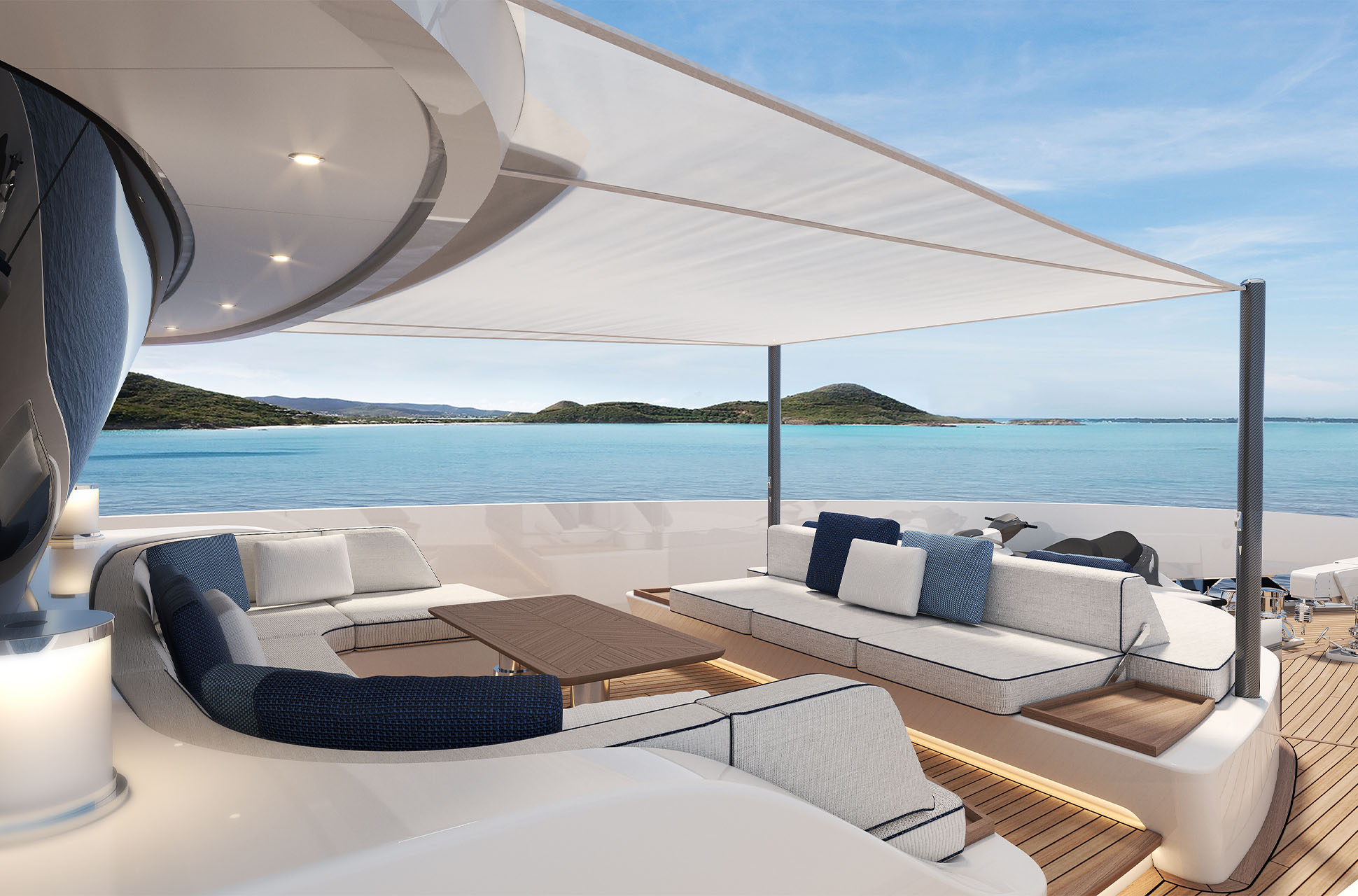 At the water’s edge, the yacht’s beach club transforms the aft deck into a private retreat. Custom sunpads, bespoke lounge furniture, fold-out terraces, and a hydraulic Transformer expand the space by more than 40%, offering direct access to the sea and effortless relaxation.