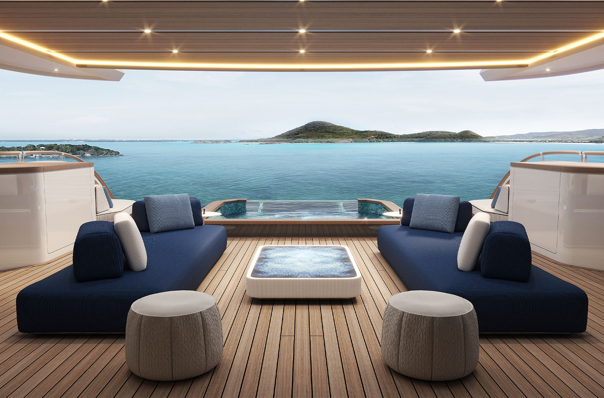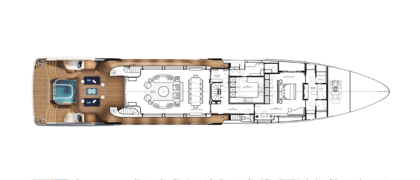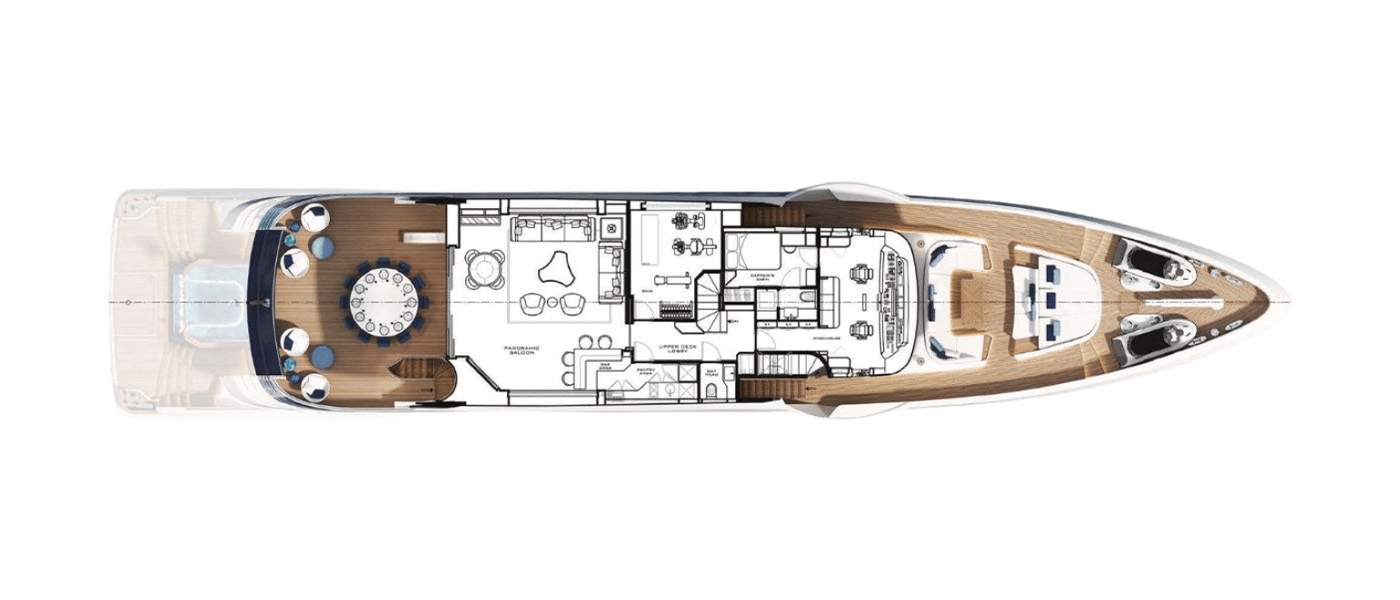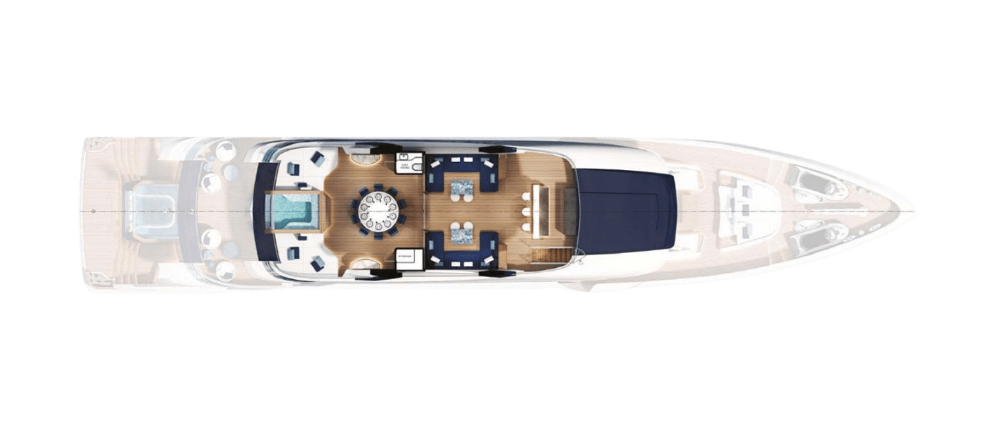 The Majesty 145 is a triumph of innovation and craftsmanship, designed to immerse guests in the surrounding seascape. Floor-to-ceiling glazing, glass balustrades, and extended terraces maximize natural light and panoramic views, while seamless indoor-outdoor connections create an atmosphere of continuous flow. Expansive decks provide generous areas for sun or shade, striking the perfect balance between comfort and open-air living.