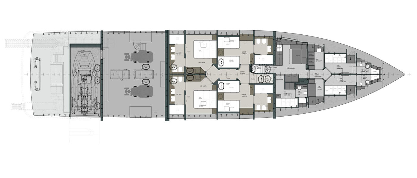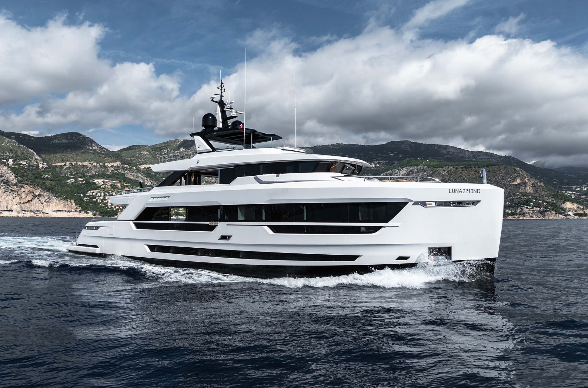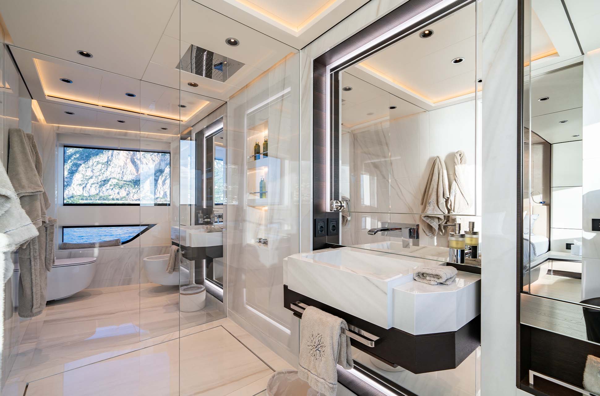 Featuring a three-deck configuration, the Ducale 120 offers 250 square meters of open space, creating an uninterrupted connection between the yacht and the sea. Its expansive living areas seamlessly blend modern elegance with luxurious comfort, accentuated by large, openable side windows that flood the interiors with natural light. The owner’s suite spans the width of the main deck, while the lower deck houses two VIP cabins and two additional guest staterooms. Designed for 10 guests and a crew of 7, the yacht also includes a well-appointed crew area, ensuring exceptional service on board. Among its standout features are two swimming pools—a seawater pool integrated into the stern beach club and a heated pool on the sundeck, complemented by sunbeds, a bar, and flexible outdoor furniture arrangements. A side-opening garage accommodates a 6-meter tender and water toys, making the Ducale 120 a perfect balance of adventure, luxury, and practicality.