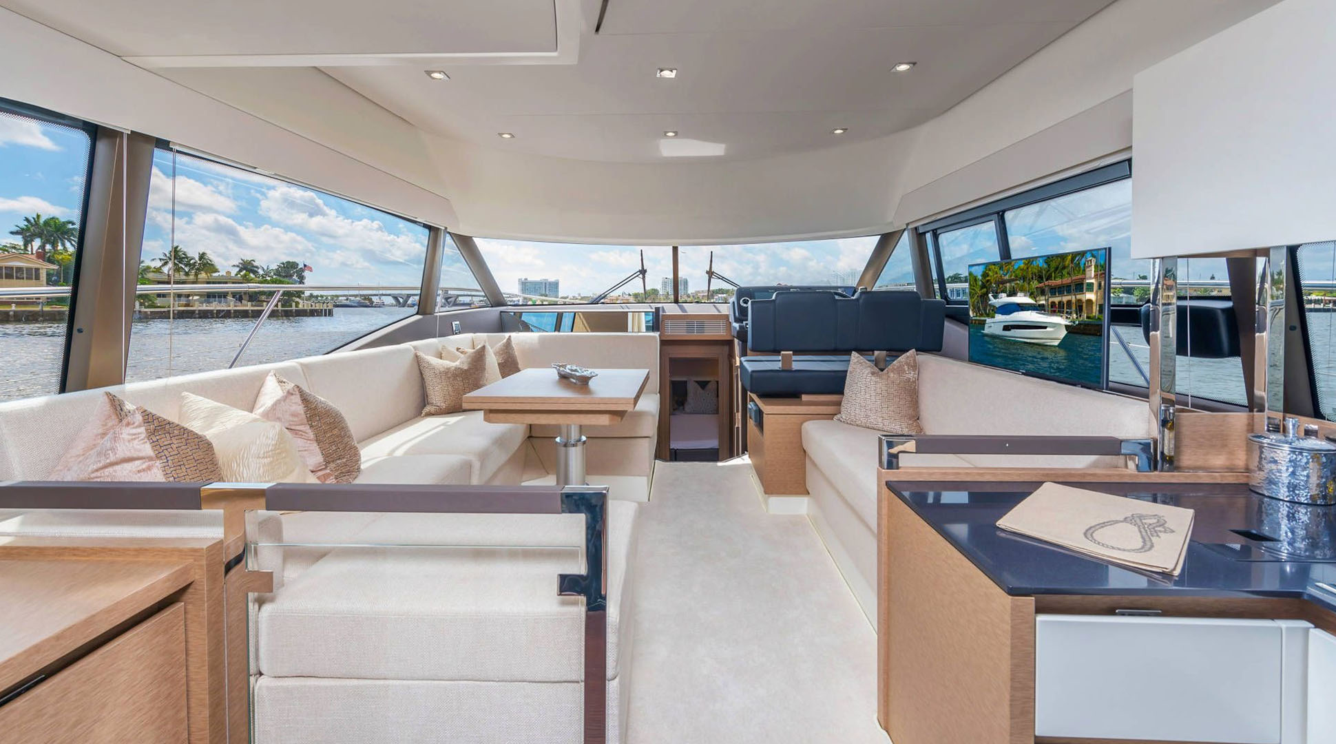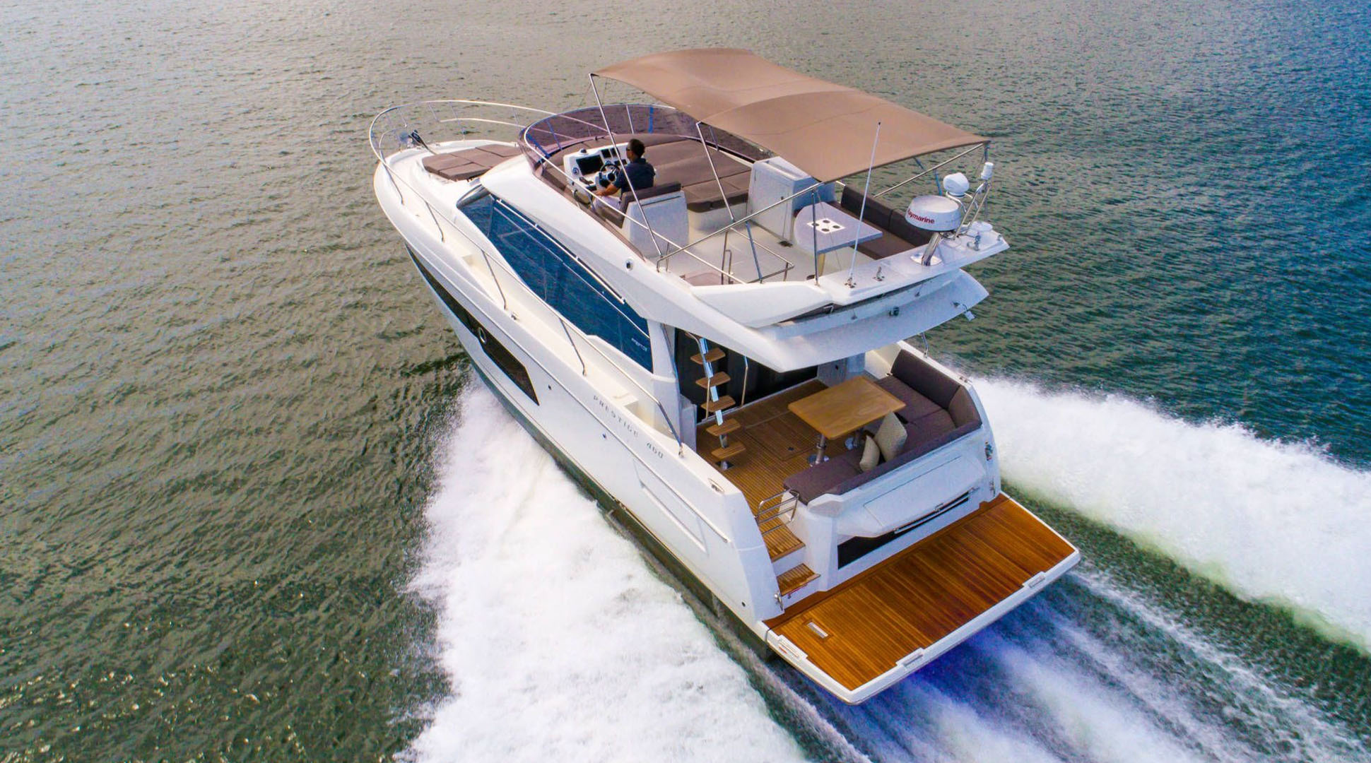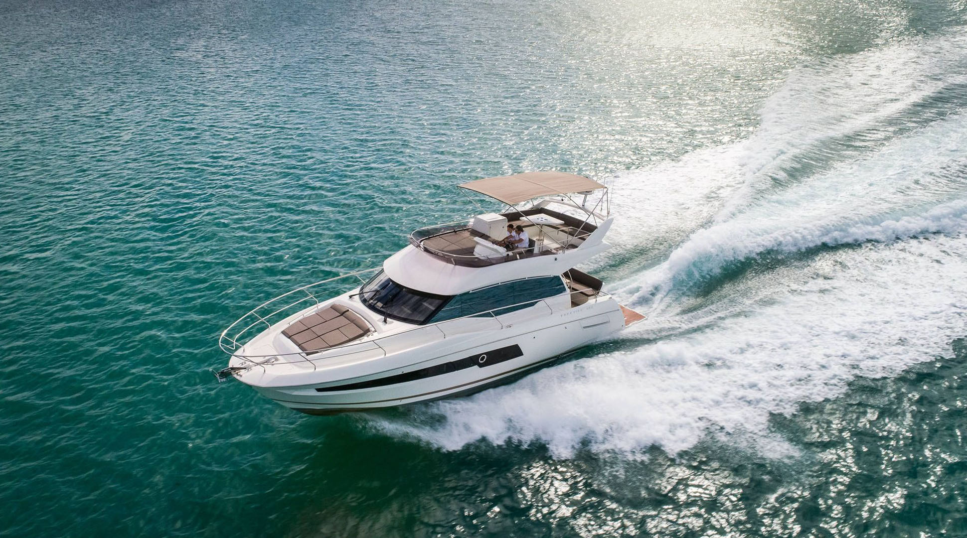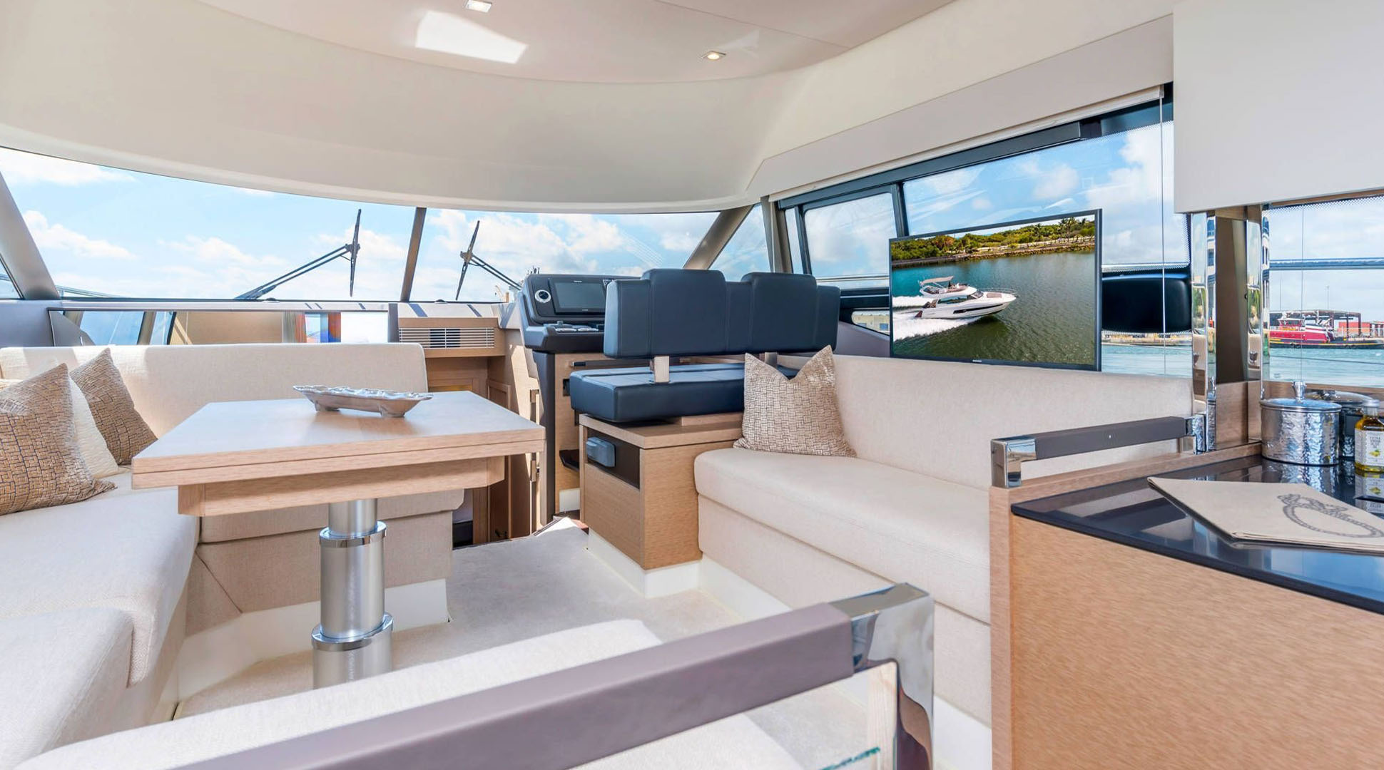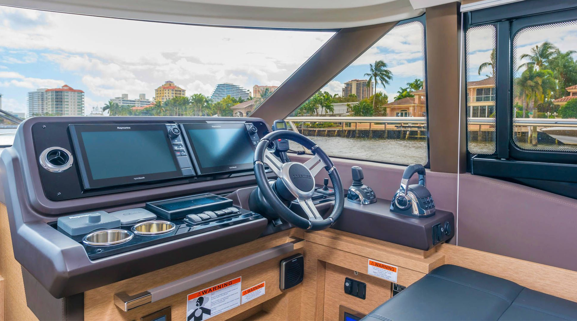 Spacious living feel: Though just under 47 feet, the boat features large windows, a fly-bridge and full outdoor-living spaces, giving it the feel of a much larger yacht.