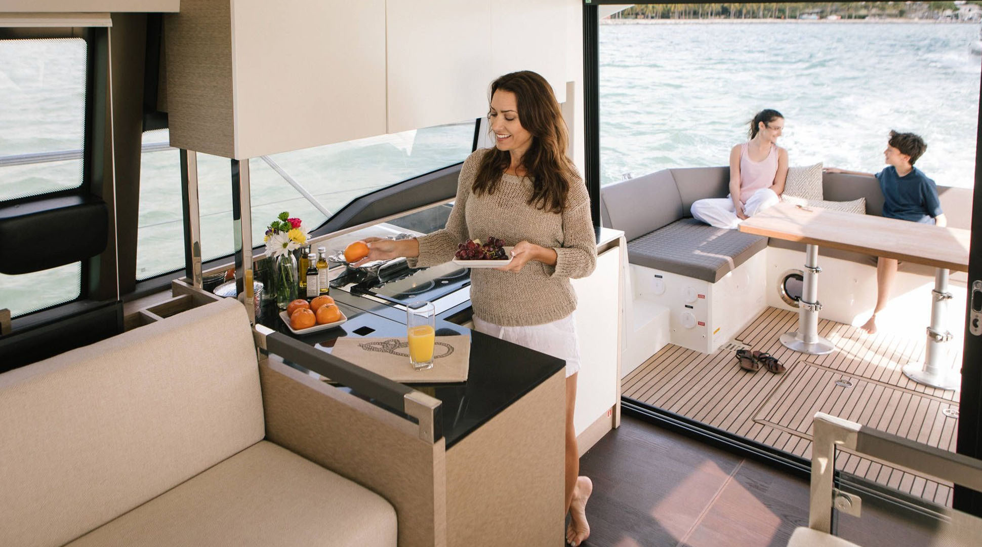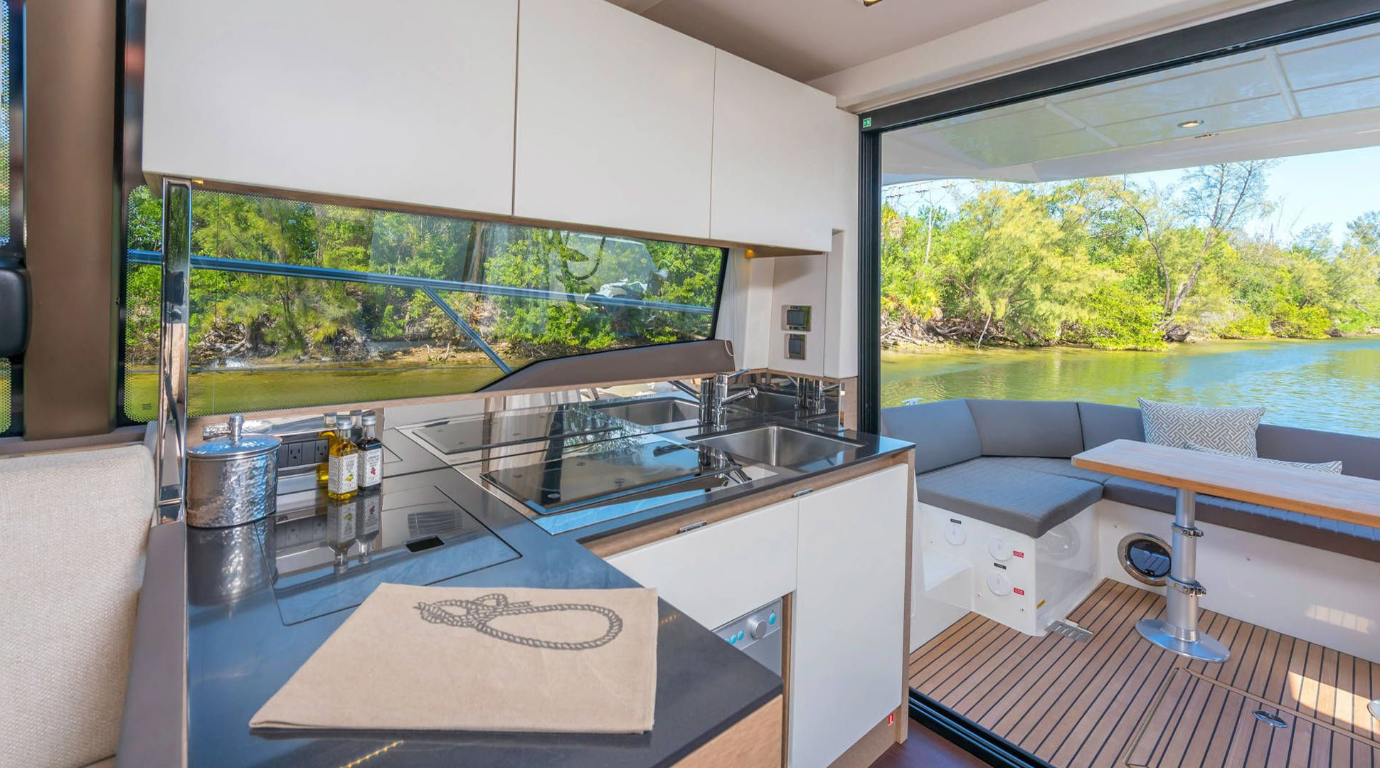 Outdoor-friendly layout: The exterior galley opens toward the cockpit and swim-platform area, enhancing social zones and interaction with the water.