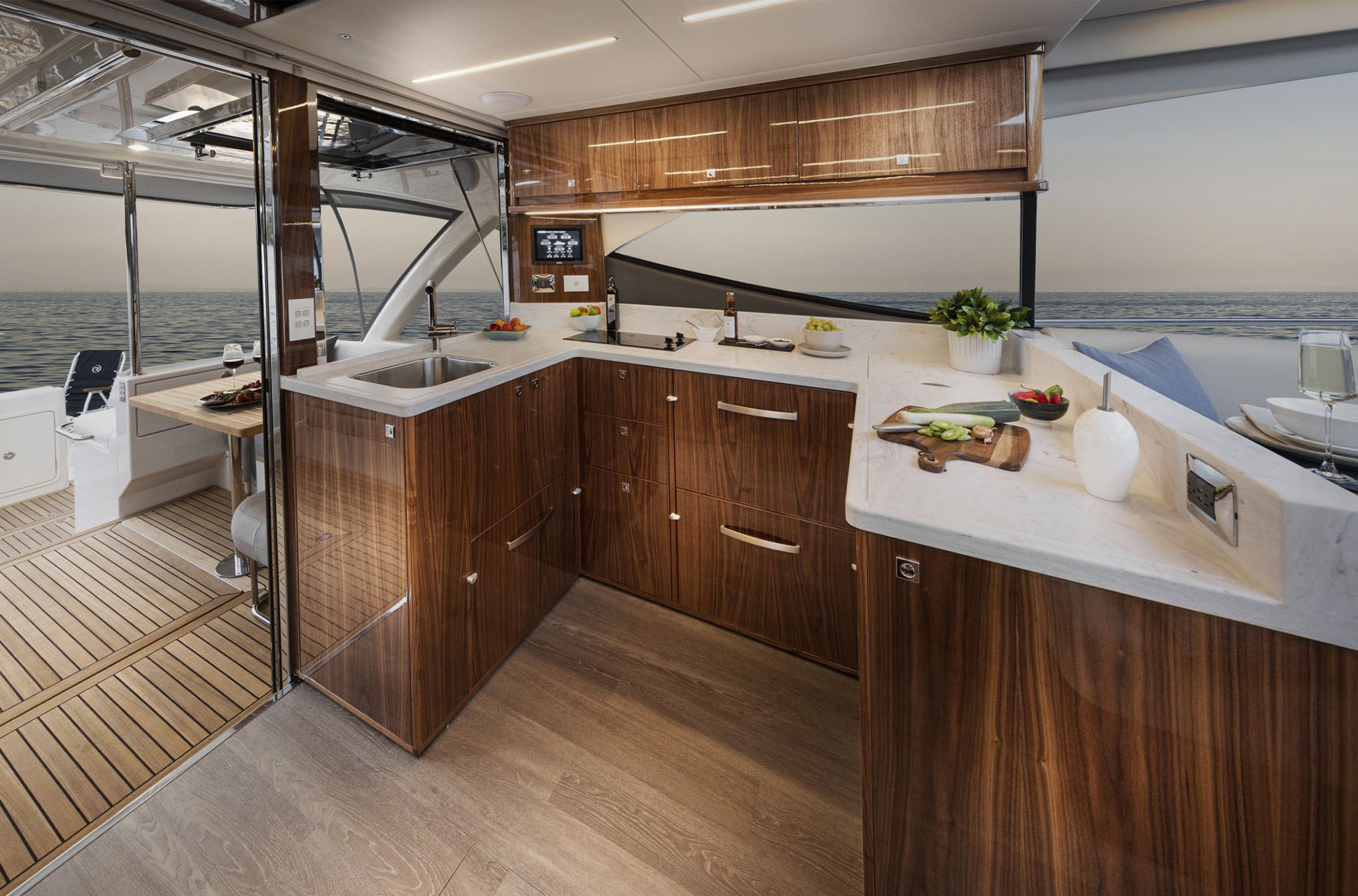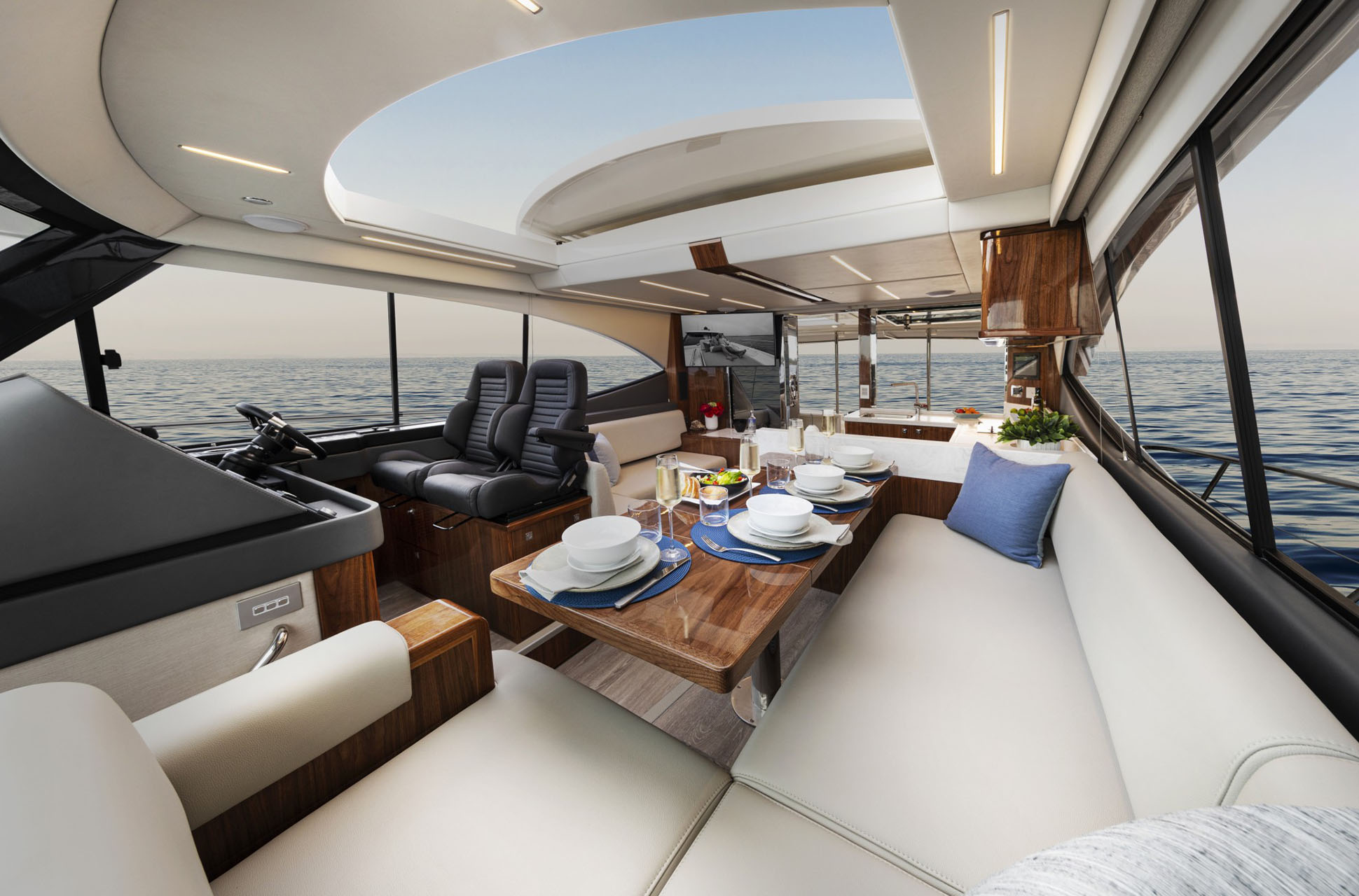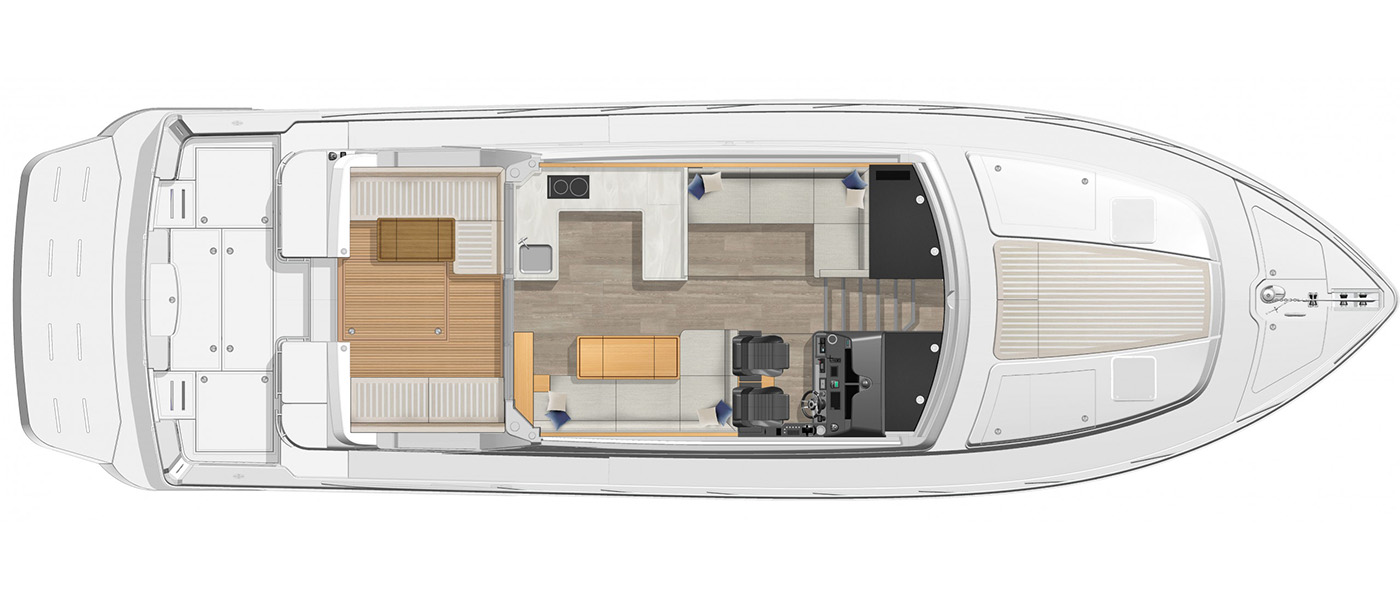 The Riviera 505 SUV takes the best of both worlds — the single-level alfresco entertaining of the Sport Yacht and the offshore pedigree of the Flybridge — and makes them even better. Its defining feature is the addition of a mezzanine: a beautifully designed wining, dining, and relaxing space that offers year-round privacy and protection from sun or weather. Paired with a generous cockpit low to the water, the 505 SUV is perfectly suited for everything from cruising and entertaining to diving, fishing, and watersports.